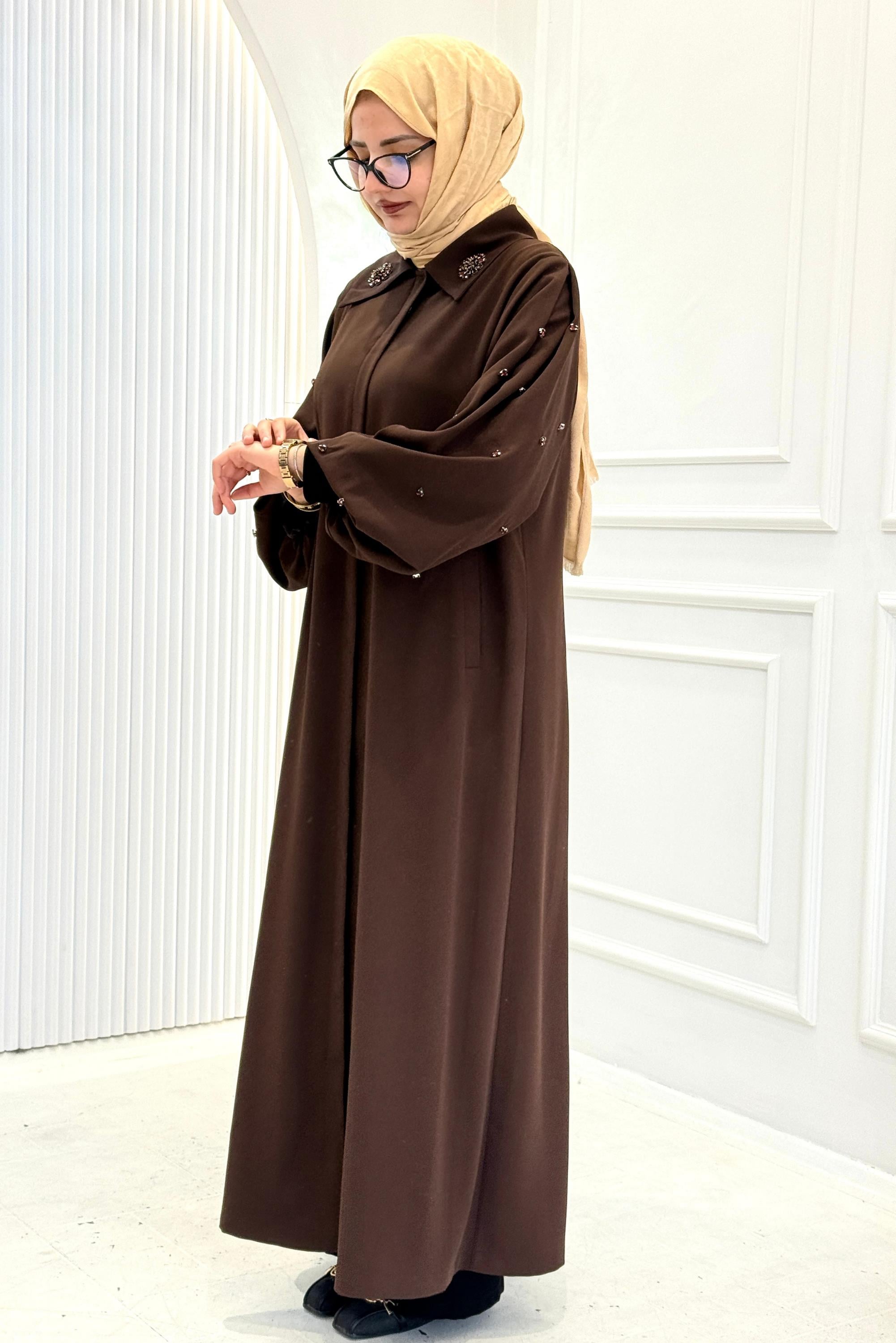 Orhan Store Klasik Yaka Taş Detaylı Ferace Kahve OTW1197