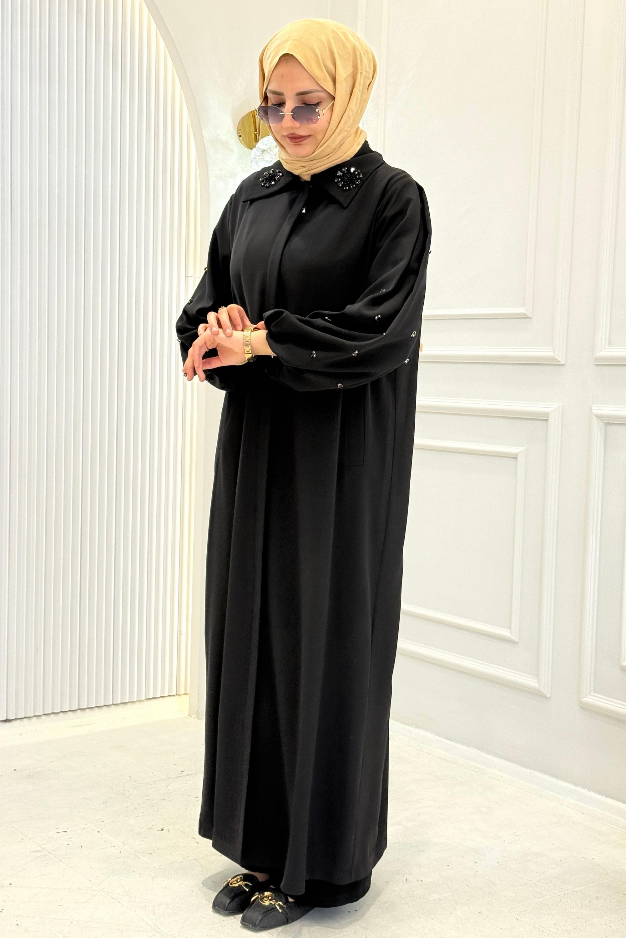 Orhan Store Klasik Yaka Taş Detaylı Ferace Siyah OTW1197