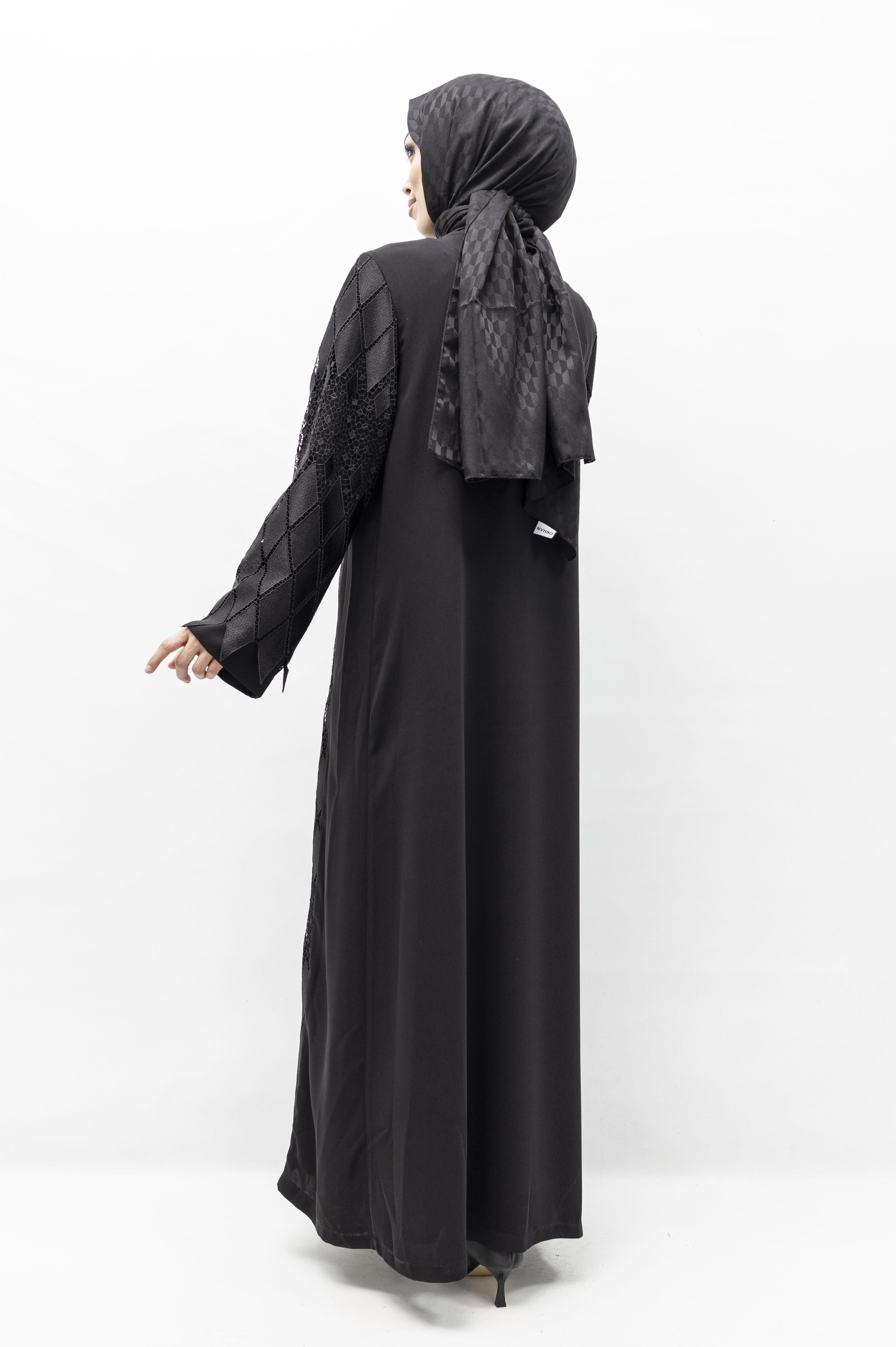 Zarif güpür detayları ile tasarlanan siyah tesettür ferace modeli, klasik şıklığı modern bir dokunuşla buluşturur. Ön kısmındaki güpür işlemeler modele derinlik ve asil bir görünüm kazandırır.