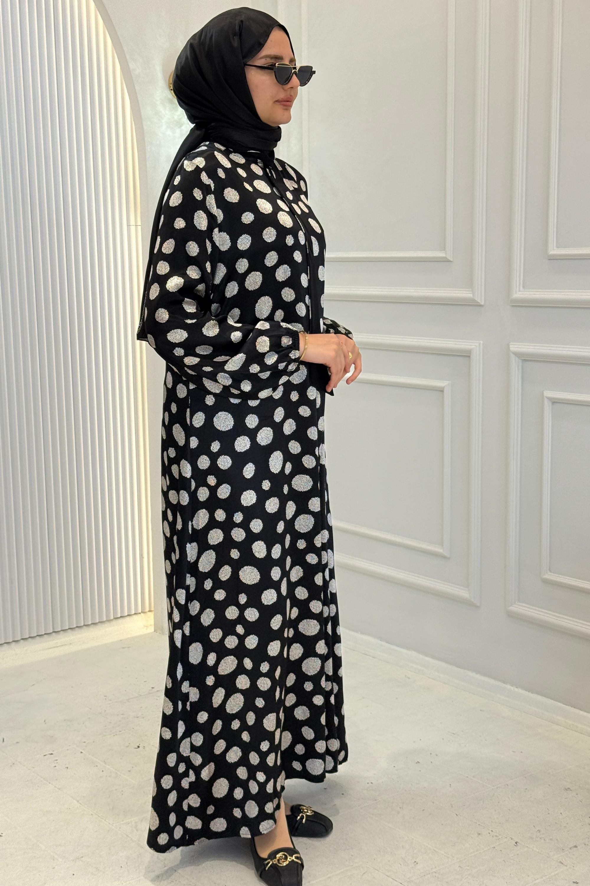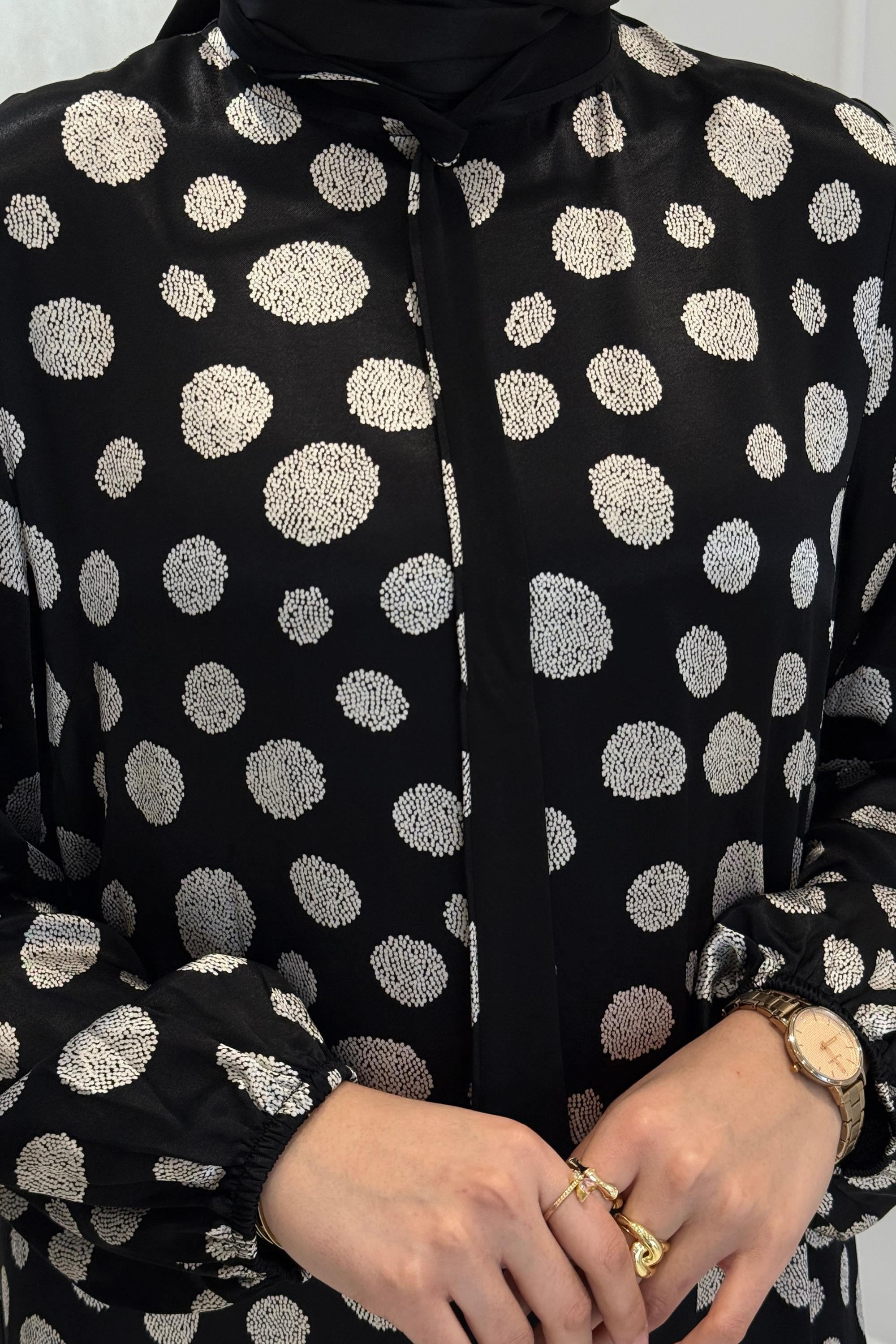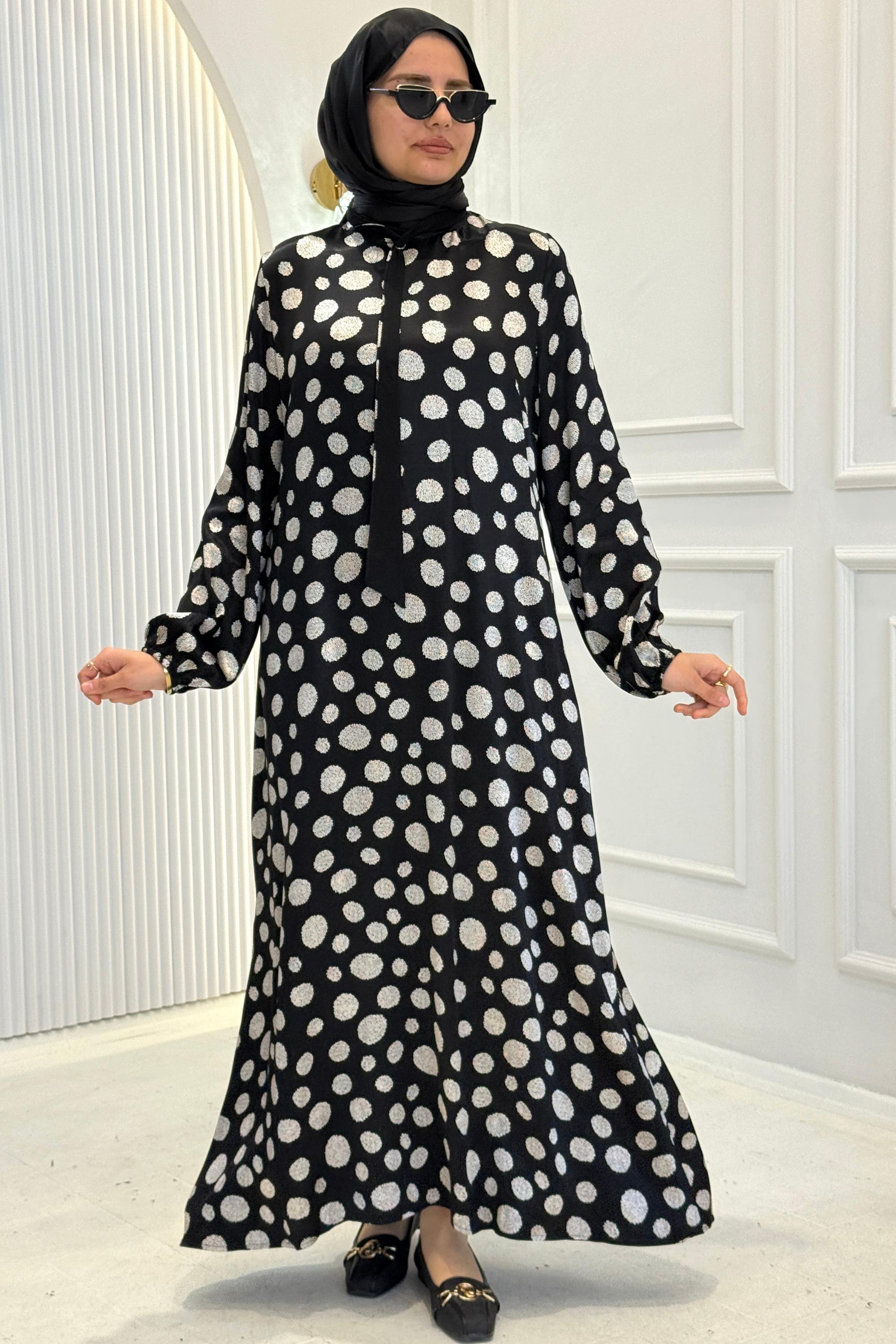 Orhan Store Puantiye Desenli Fular Yaka Uzun Elbise Siyah OTW1826