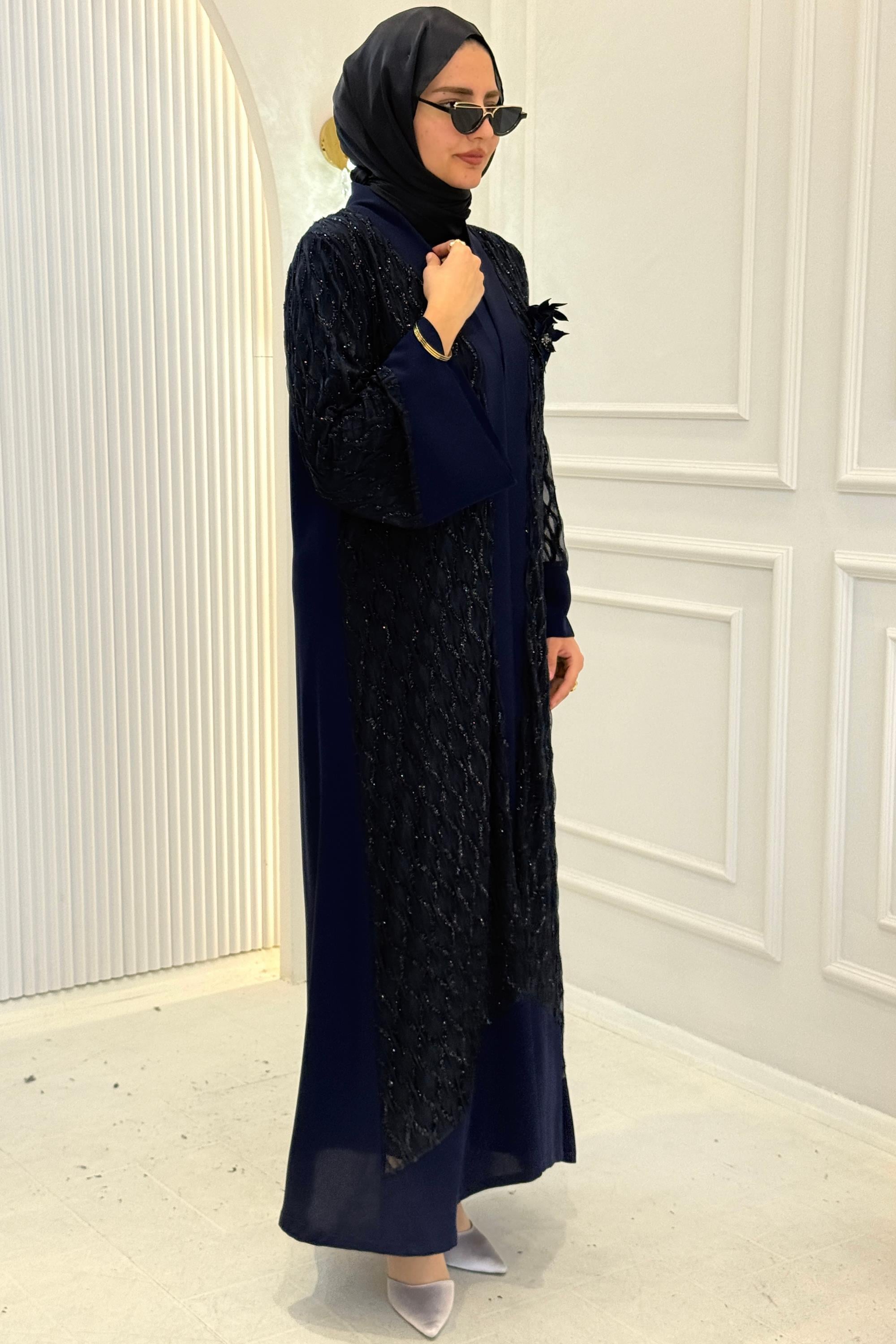 Zarif ve şık tasarımıyla öne çıkan şifon abaya takım, özel günlerde ve davetlerde tercih edilebilecek şık bir tesettür kombinidir. İç kısmında bulunan sandy kumaş elbise sayesinde rahat bir kullanım sunarken dış kısmındaki şifon abaya hareketli ve zarif bir görünüm kazandırır.Taş ve doku detaylarıyla zenginleştirilen bu model, modern tesettür giyim stilini tamamlayan şık bir alternatiftir. Büyük beden uyumlu kalıbı sayesinde rahat bir kullanım sunar.