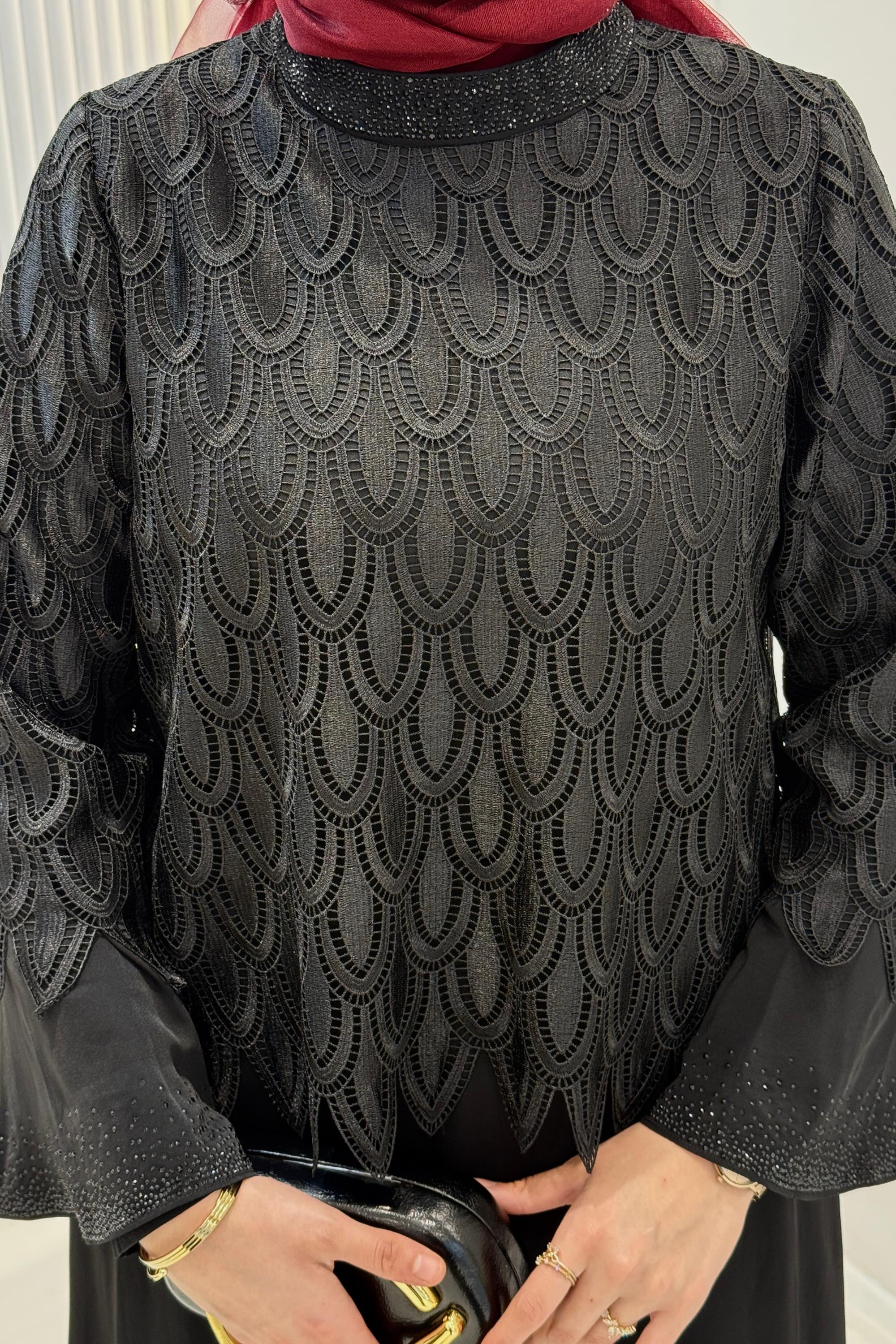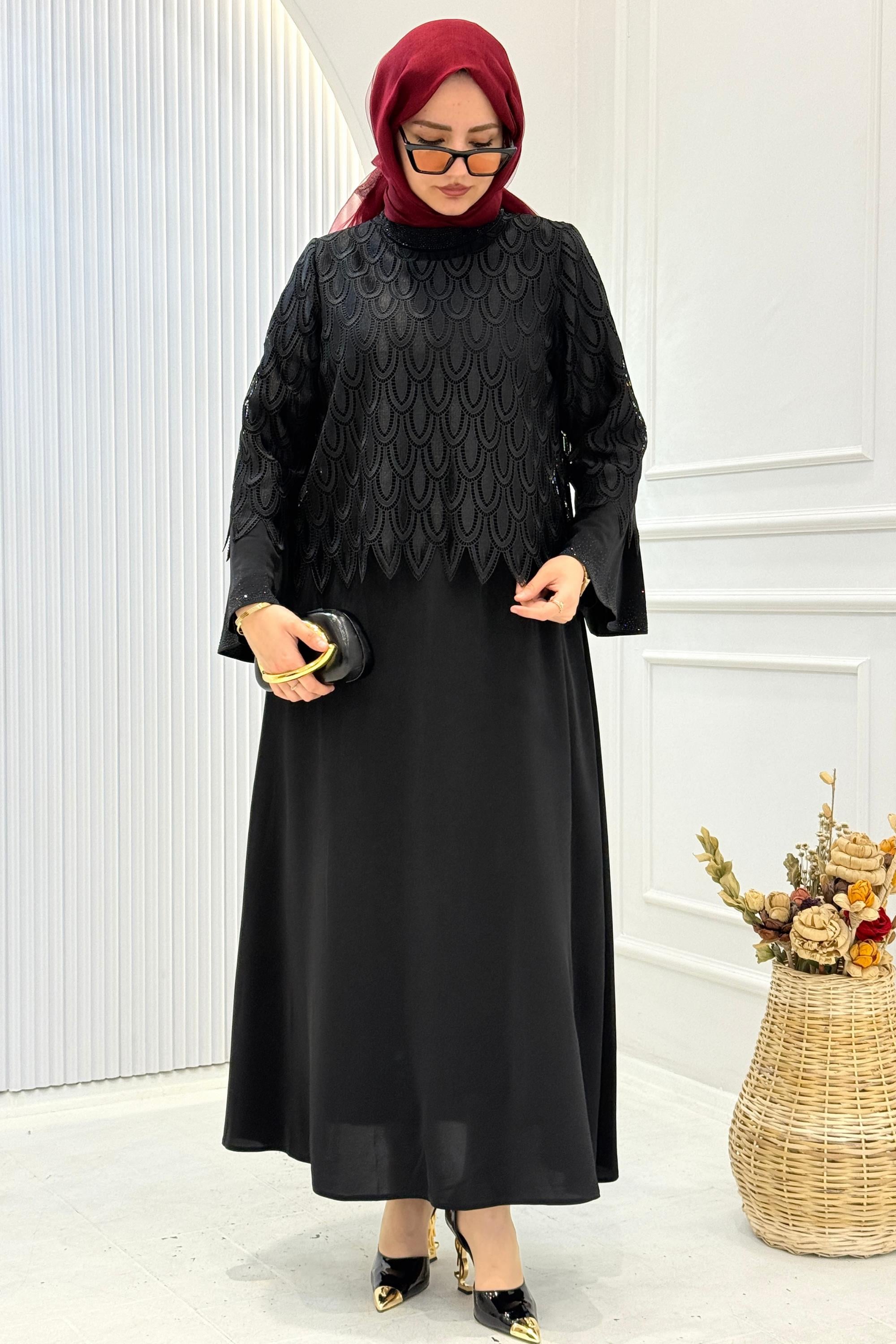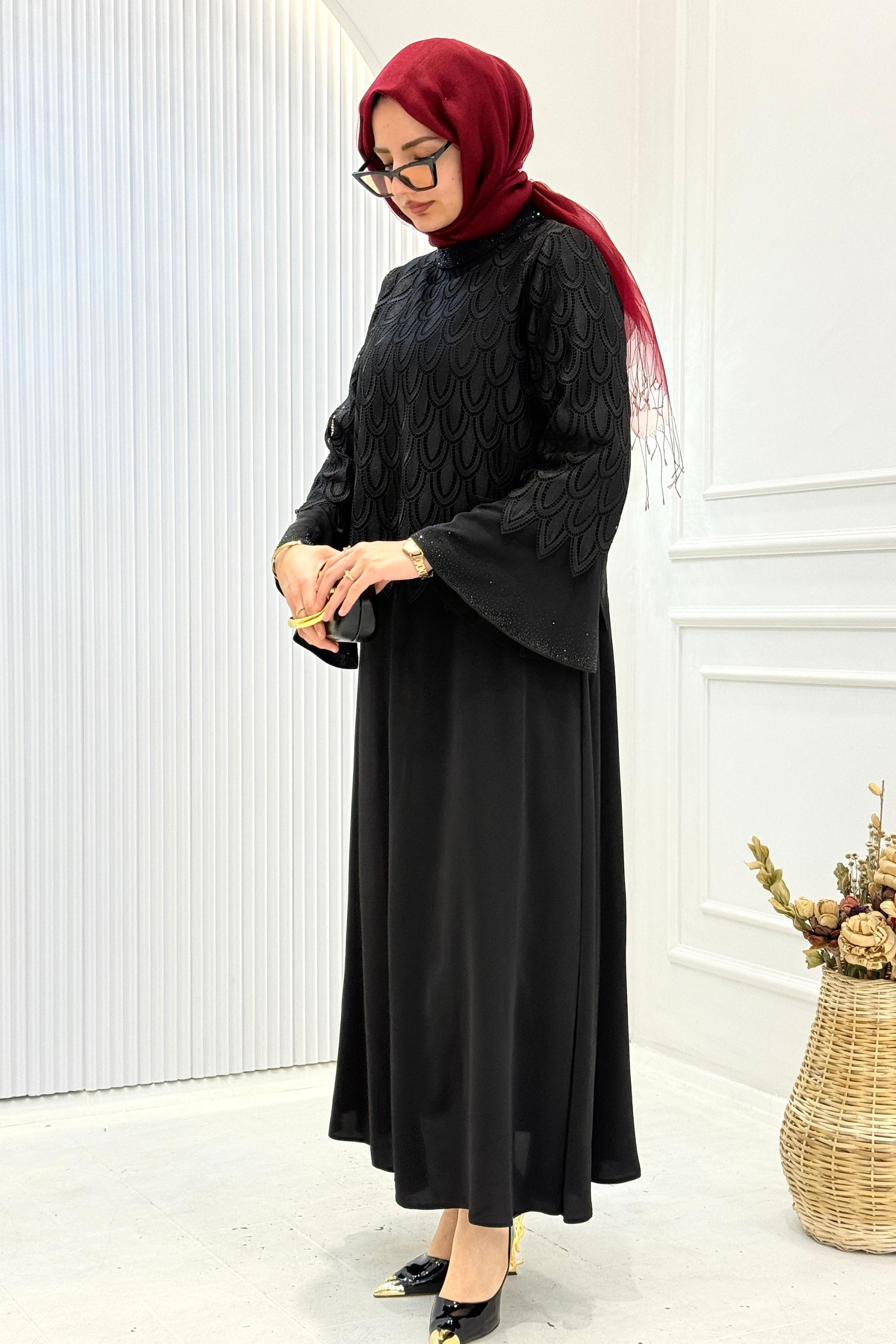 Üst kısmı özel desenli küpür detaylı ve elbise ile dikili tasarlanan bu uzun tesettür abiye, sade ama etkileyici bir duruş sunar.Alt kısmı geniş ve dökümlü kesime sahiptir; basen ölçüsü verilmemiştir çünkü model rahat kalıp ve bol formdadır. Vücuda yapışmaz, akıcı bir siluet oluşturur.Özel davetler, nişan, söz, akşam organizasyonları ve şık kombinler için ideal bir tercihtir.