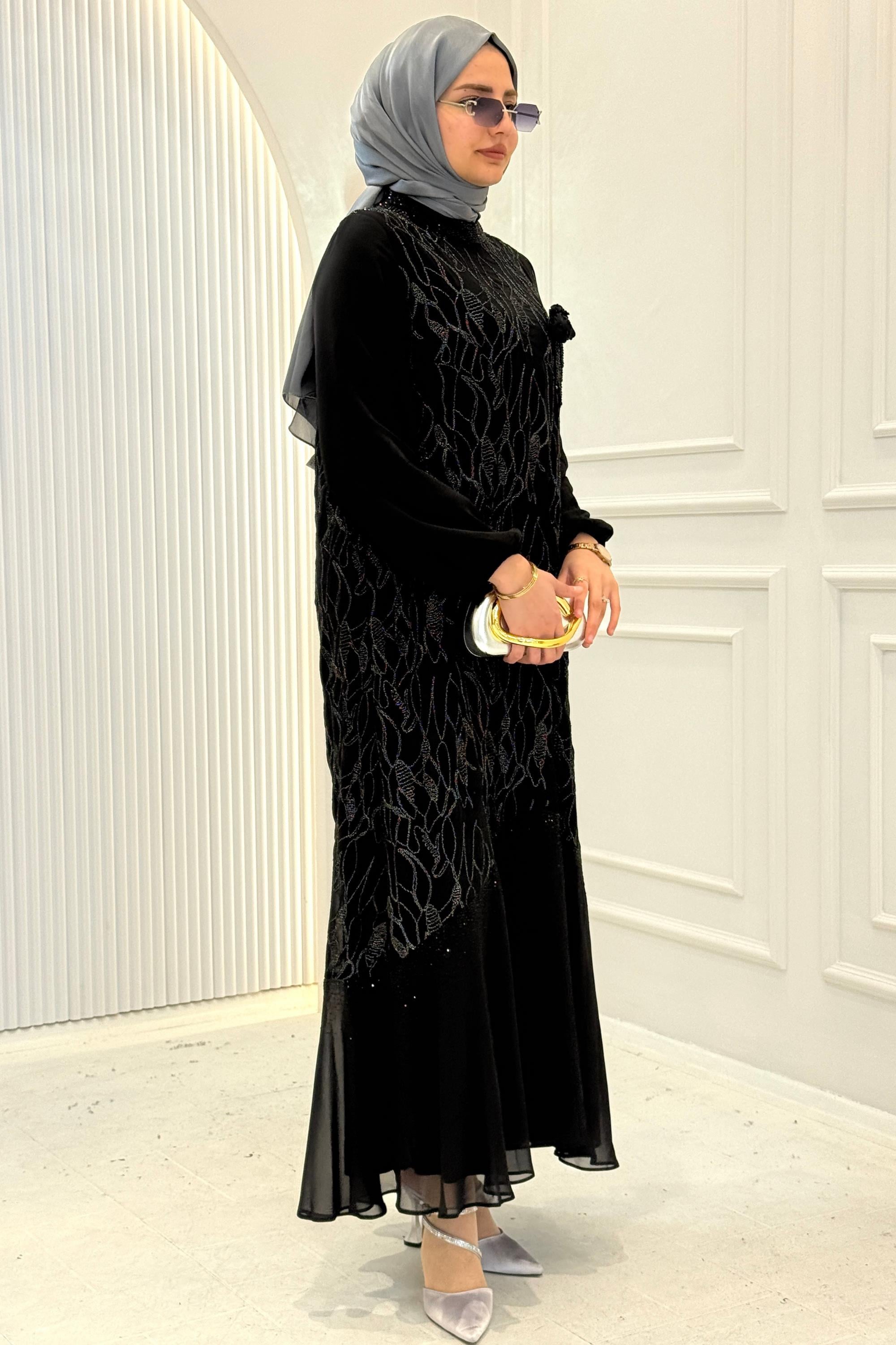 Siyah küpür detaylı uzun elbise modeli, zarif işlemeli üst tasarımı ve akıcı şifon etek formu ile özel gün kombinleriniz için şık bir seçenek sunar. 143 cm boy uzunluğu sayesinde asil ve dengeli bir siluet oluşturur.