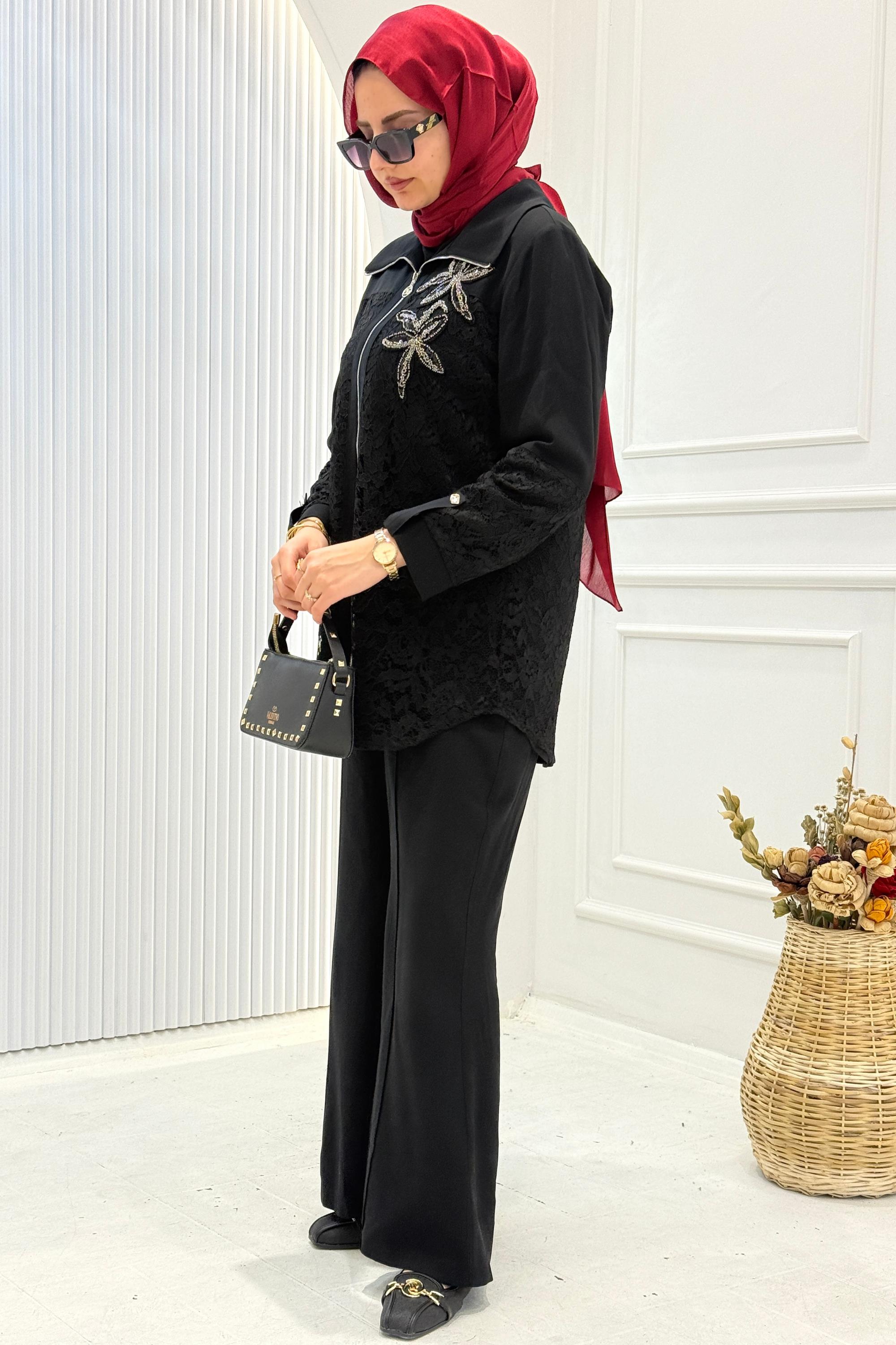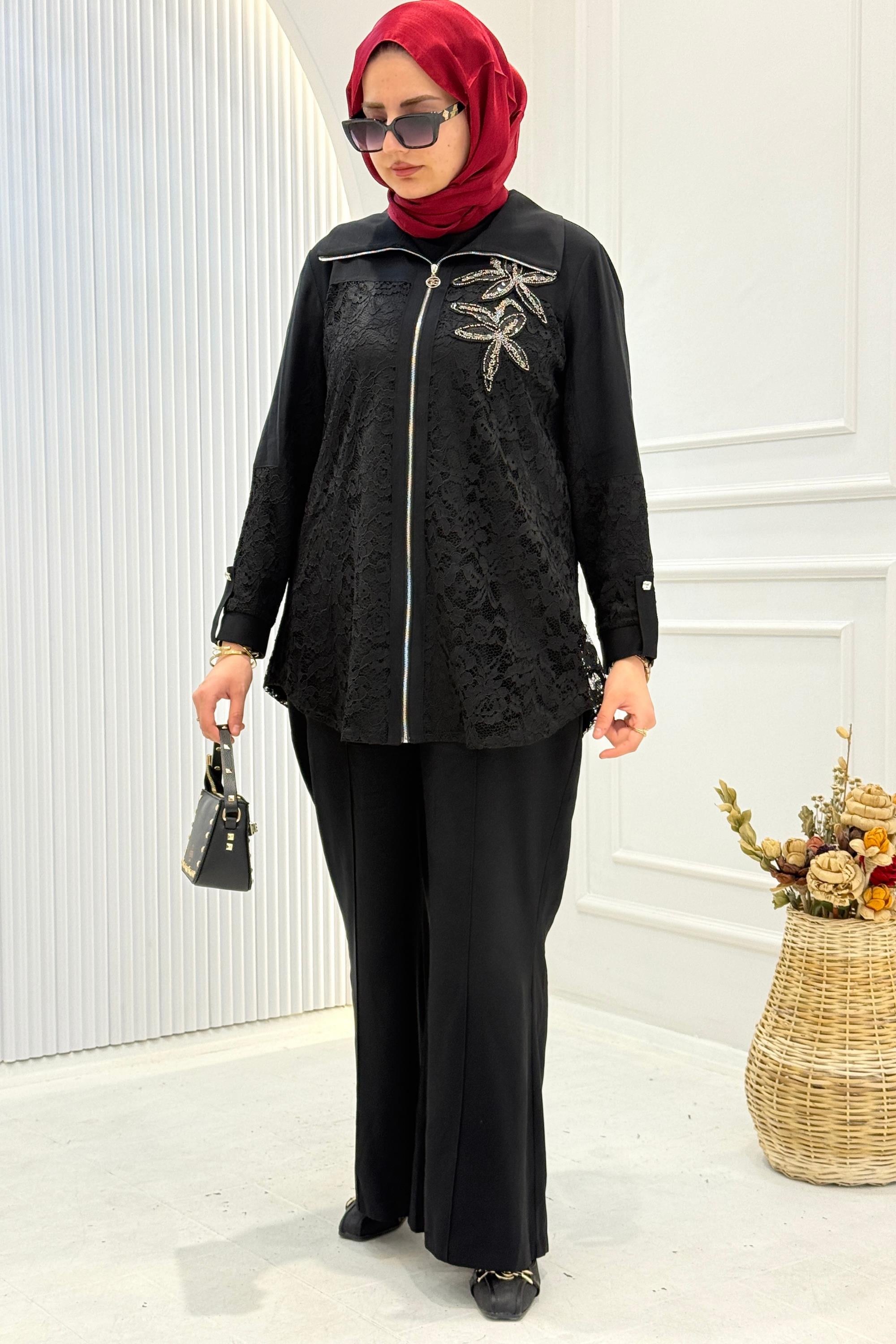 Ön fermuarlı tunik modeli hem pratik hem modern bir görünüm sağlar. Dantel dokusu takıma zarif ve özel bir hava katarken, dökümlü kesimi vücuda yapışmadan rahat bir siluet oluşturur.
