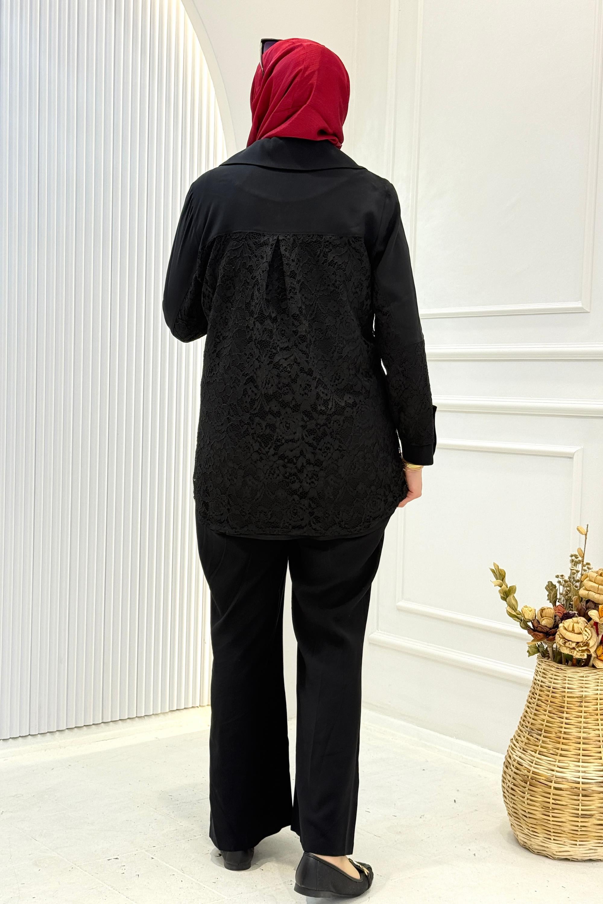 Mevsimlik tensel kumaşı sayesinde hafif, nefes alan ve konforlu kullanım sunan tesettür takım modeli, önü ve arkası dantel detaylı tasarımıyla şıklığı ön plana çıkarır.