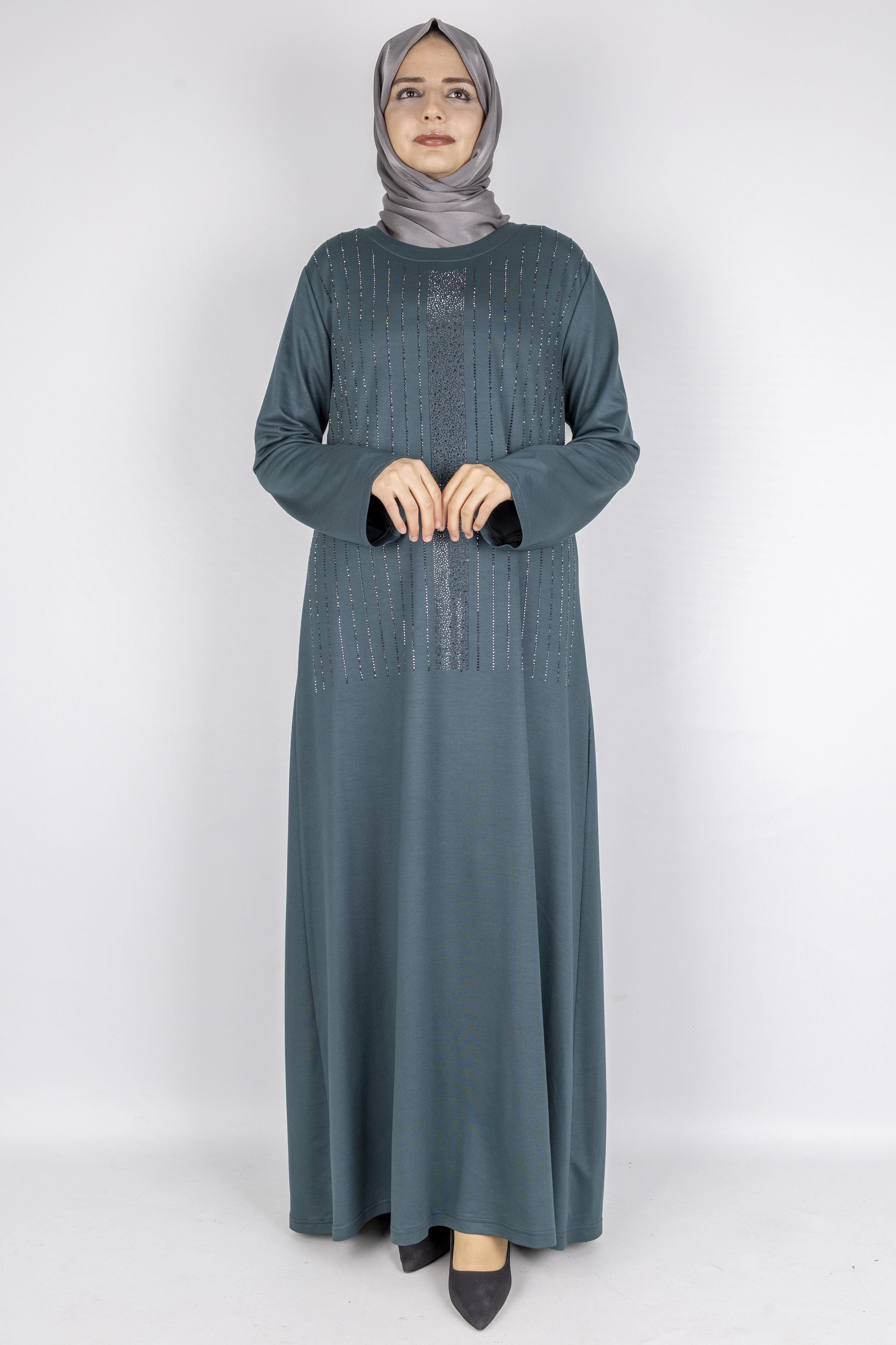 Sim Taş İşlemeli Büyük Beden Penye Elbise Yeşil OTW2111
