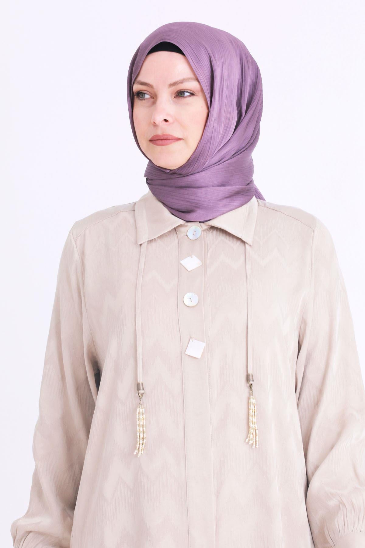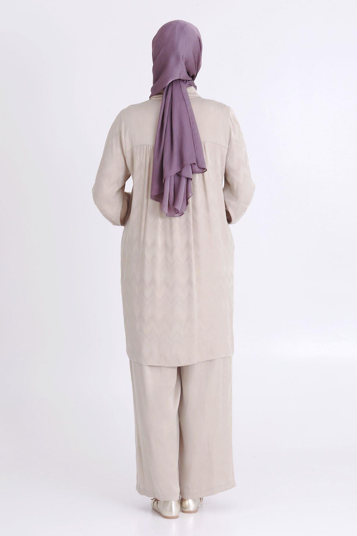 Ürün Detayları: Önden gizli pat düğmeli modelimiz sedef aksesuarlıdır. Pantolon beli lastkili ve ceplidir.