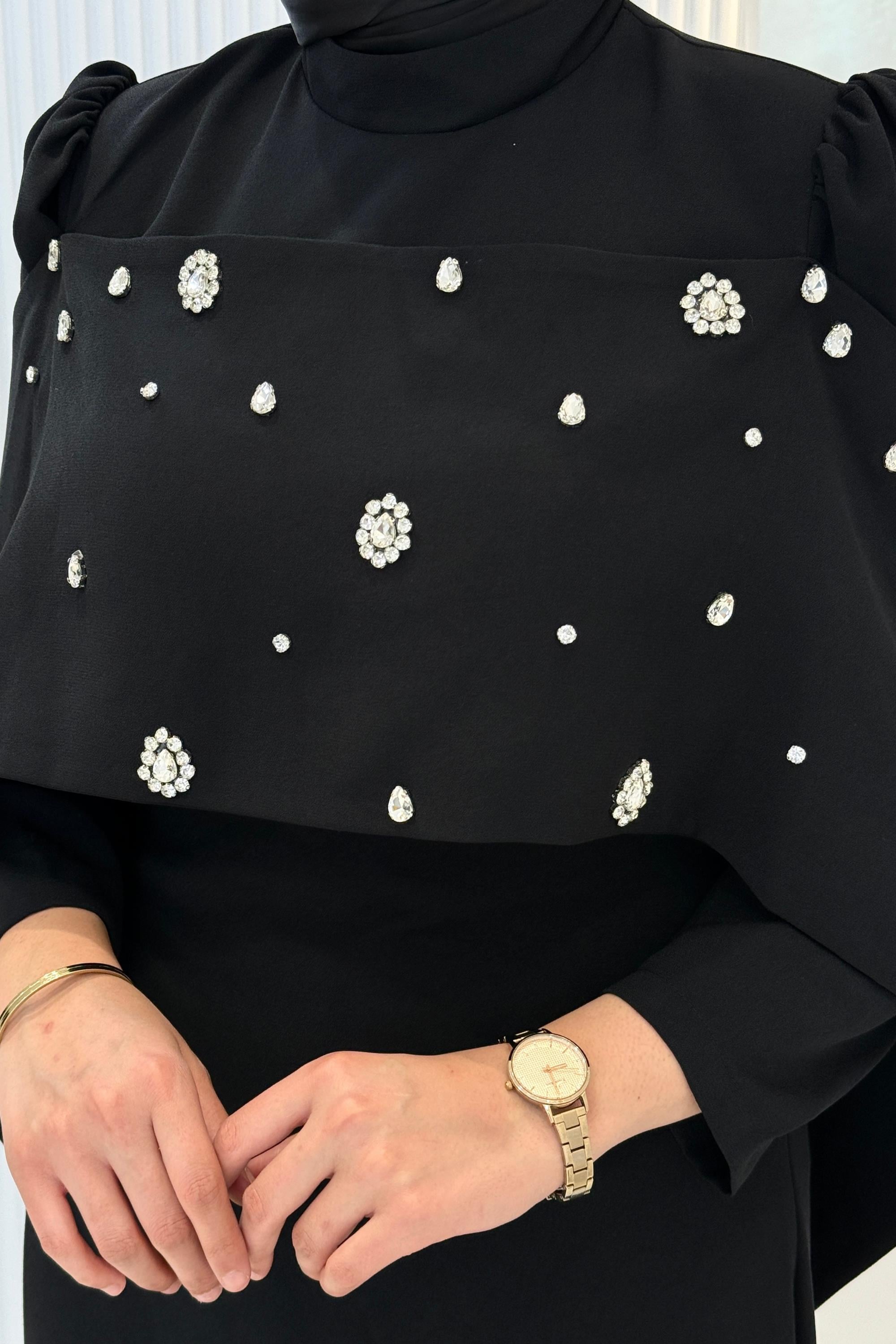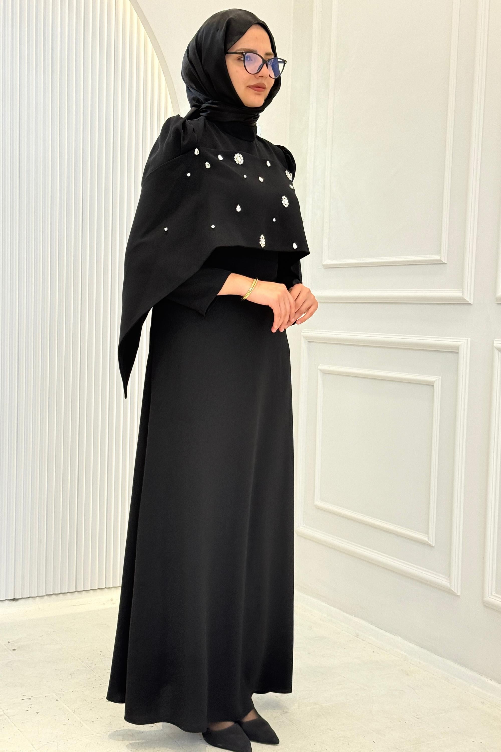 Pelerinli Taş İşlemeli Siyah Abiye Siyah OTW4901