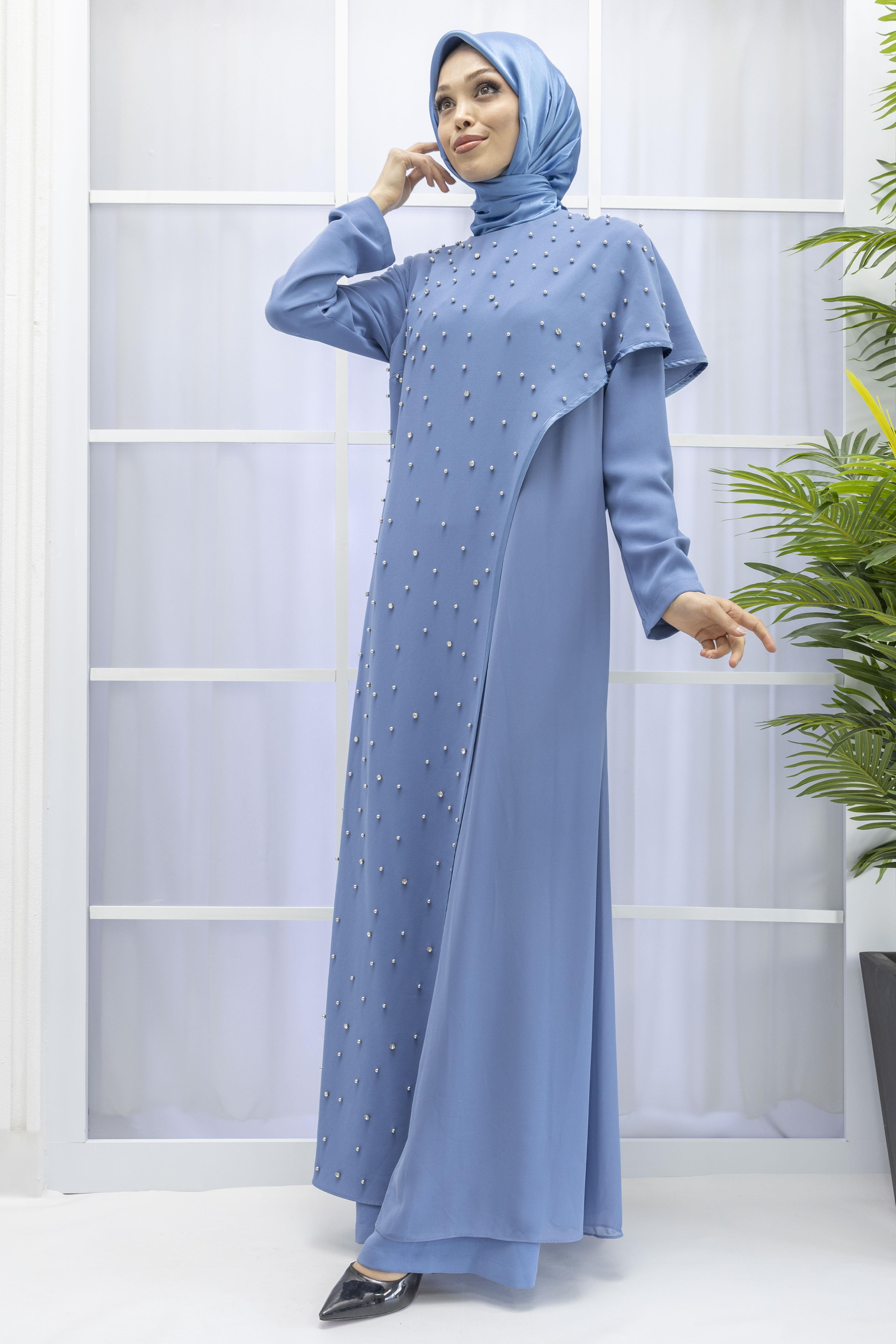 İncili İkili Pelerinli Tulum Takım İndigo OTW38942