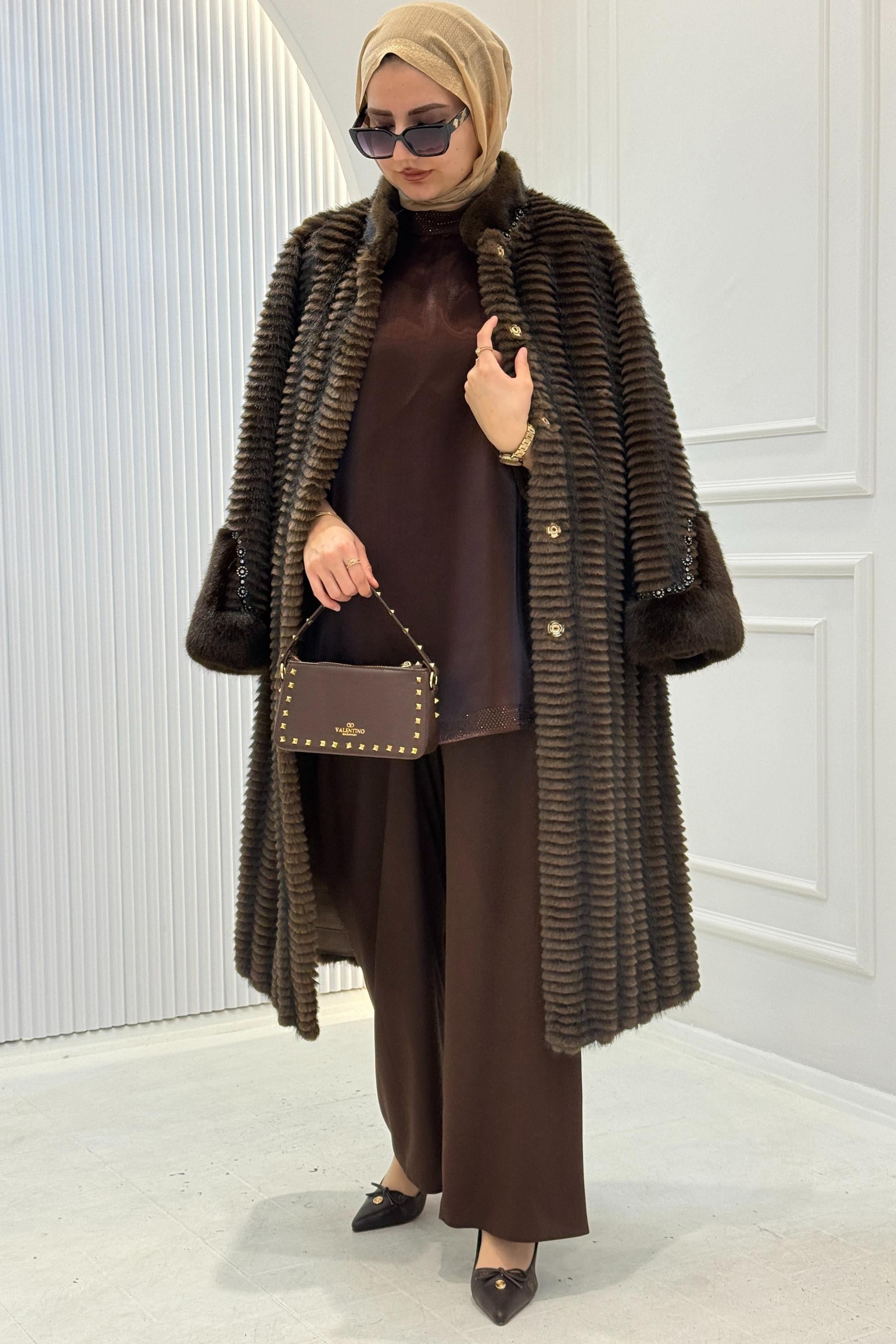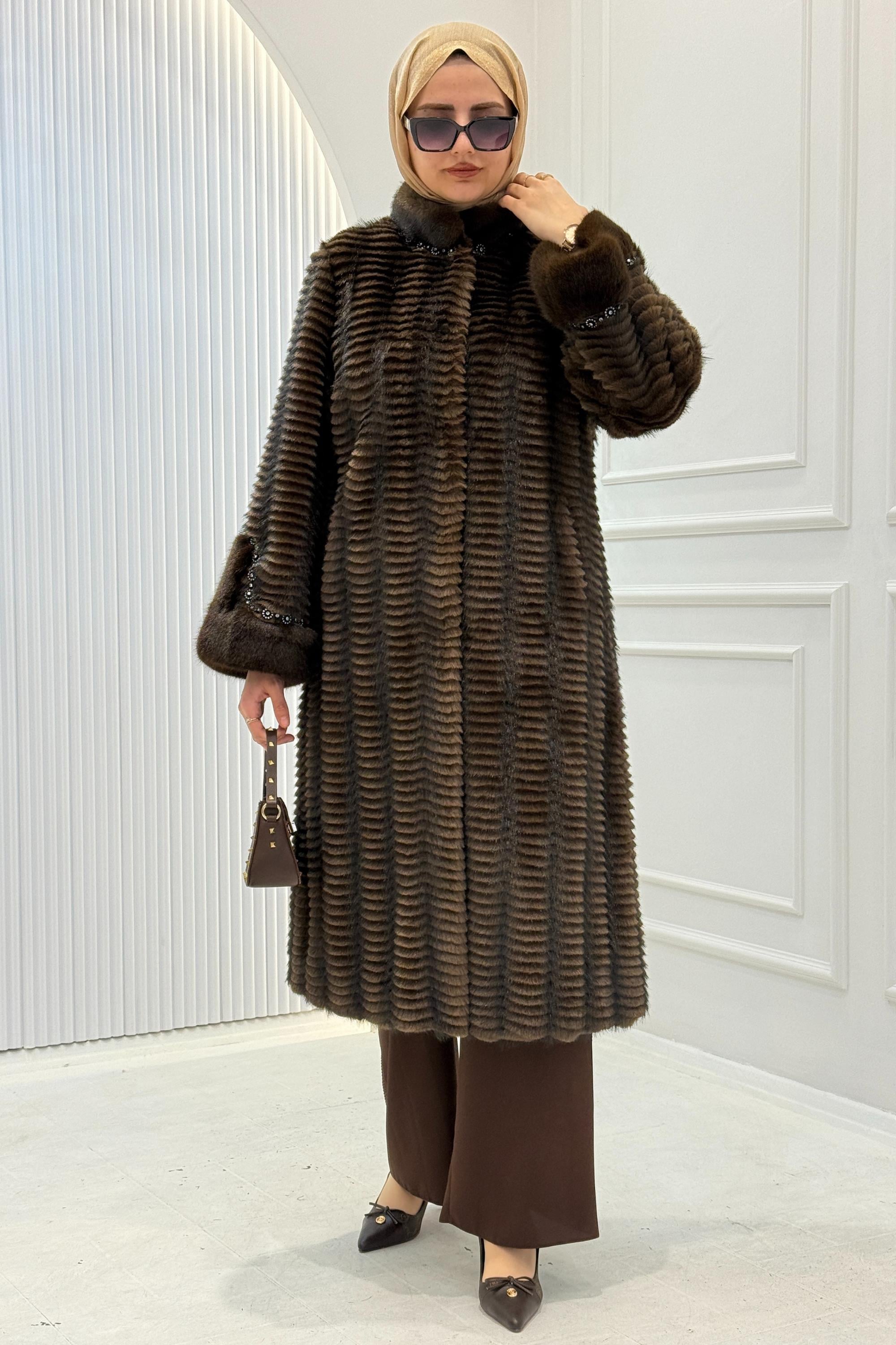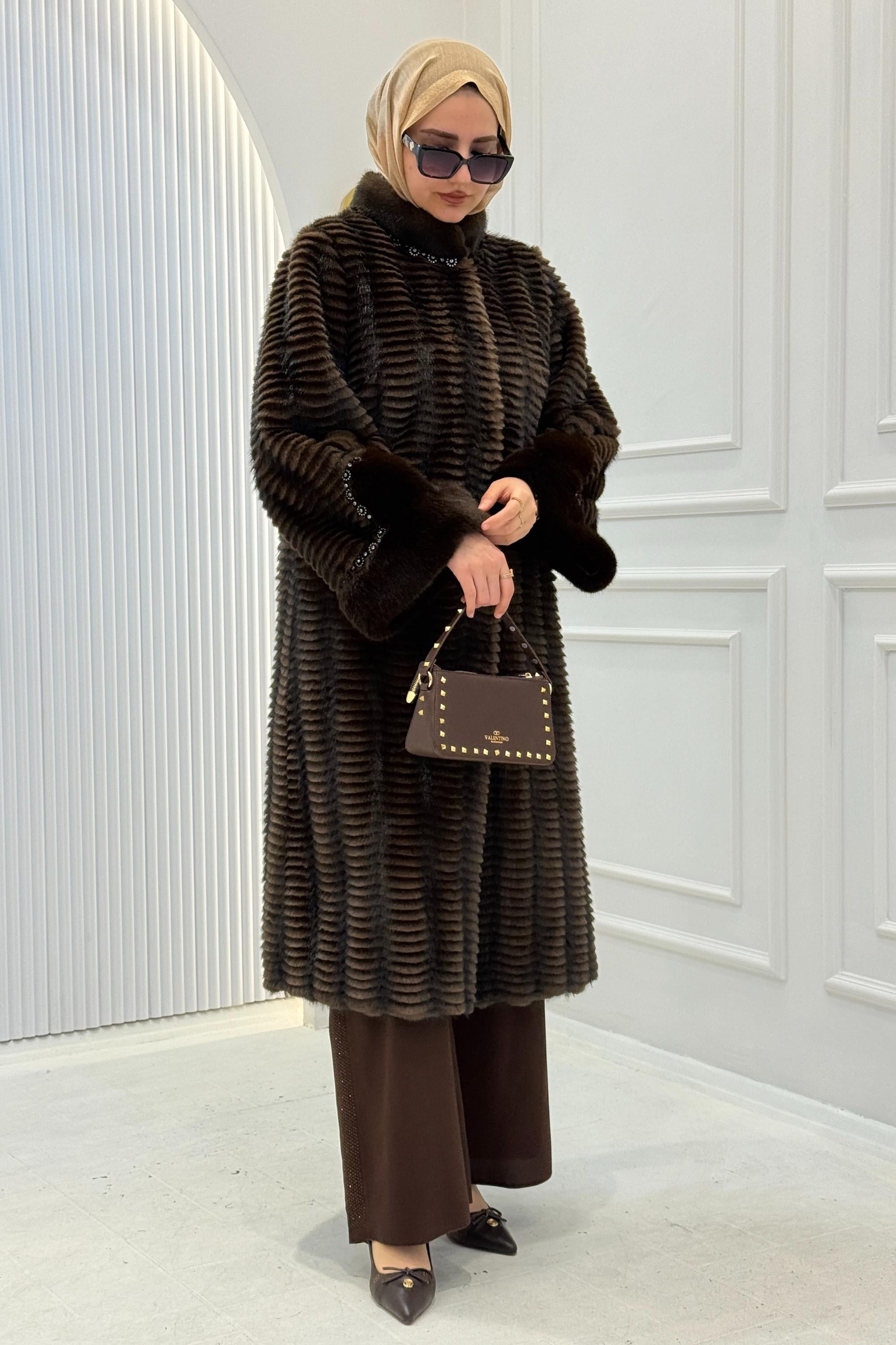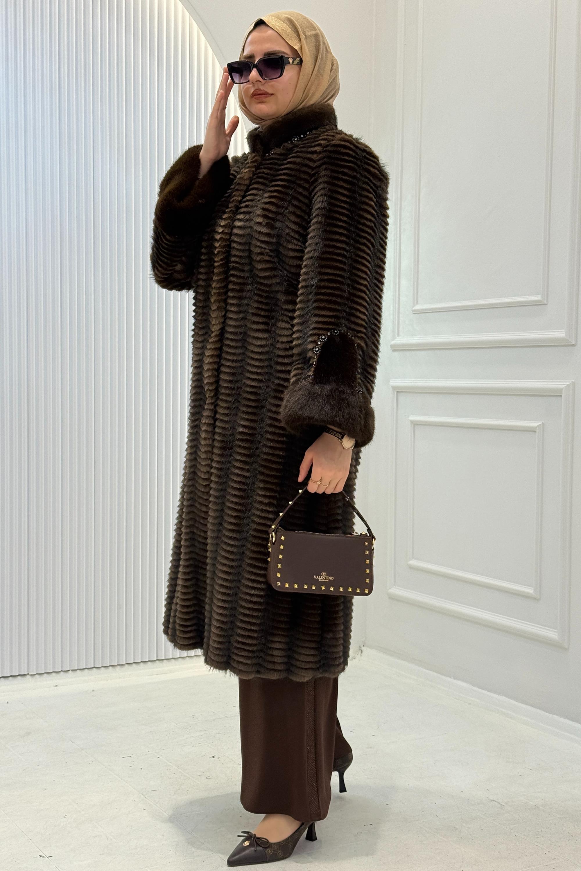 Rahat kalıbı ve diz altı uzunluğu ile tesettür giyime uygundur. Günlük kombinlerden özel davet şıklığına kadar geniş bir kullanım alanı sunar. Pantolon ve elbiselerle kolayca kombinlenebilen bu kışlık kürk kaban, zamansız bir stil arayanlar için ideal bir tercihtir.