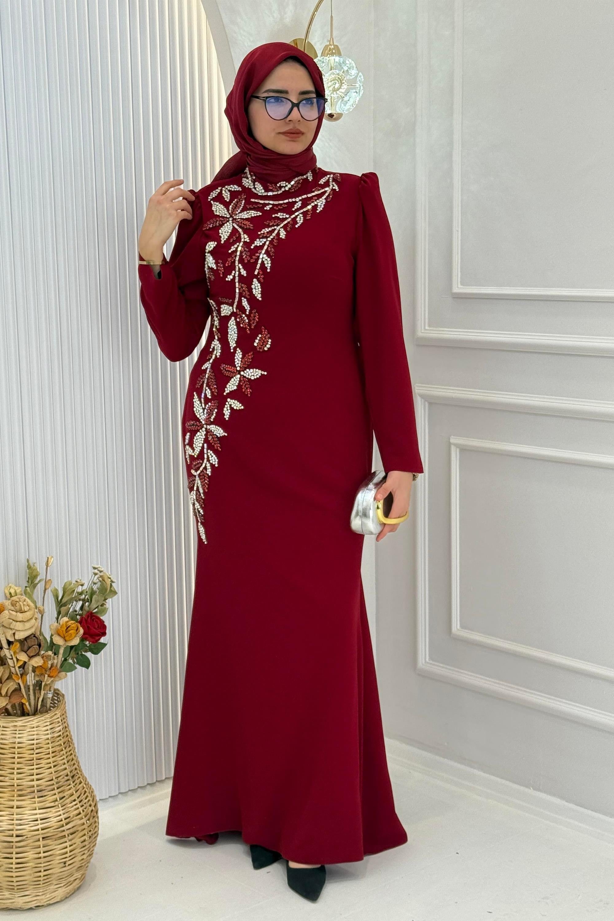 Zarif taş işlemeleriyle ön plana çıkan bu krep kumaş uzun abiye elbise, bordo rengin asil duruşunu modern bir şıklıkla buluşturur. Ön bölümde yer alan ince işçilikli taş detayları elbiseye feminen ve göz alıcı bir hava katarken, akıcı krep kumaşı vücuda zarif bir form kazandırır. Düğün, nişan, davet ve özel günlerde güvenle tercih edilebilecek zamansız bir abiye modelidir.