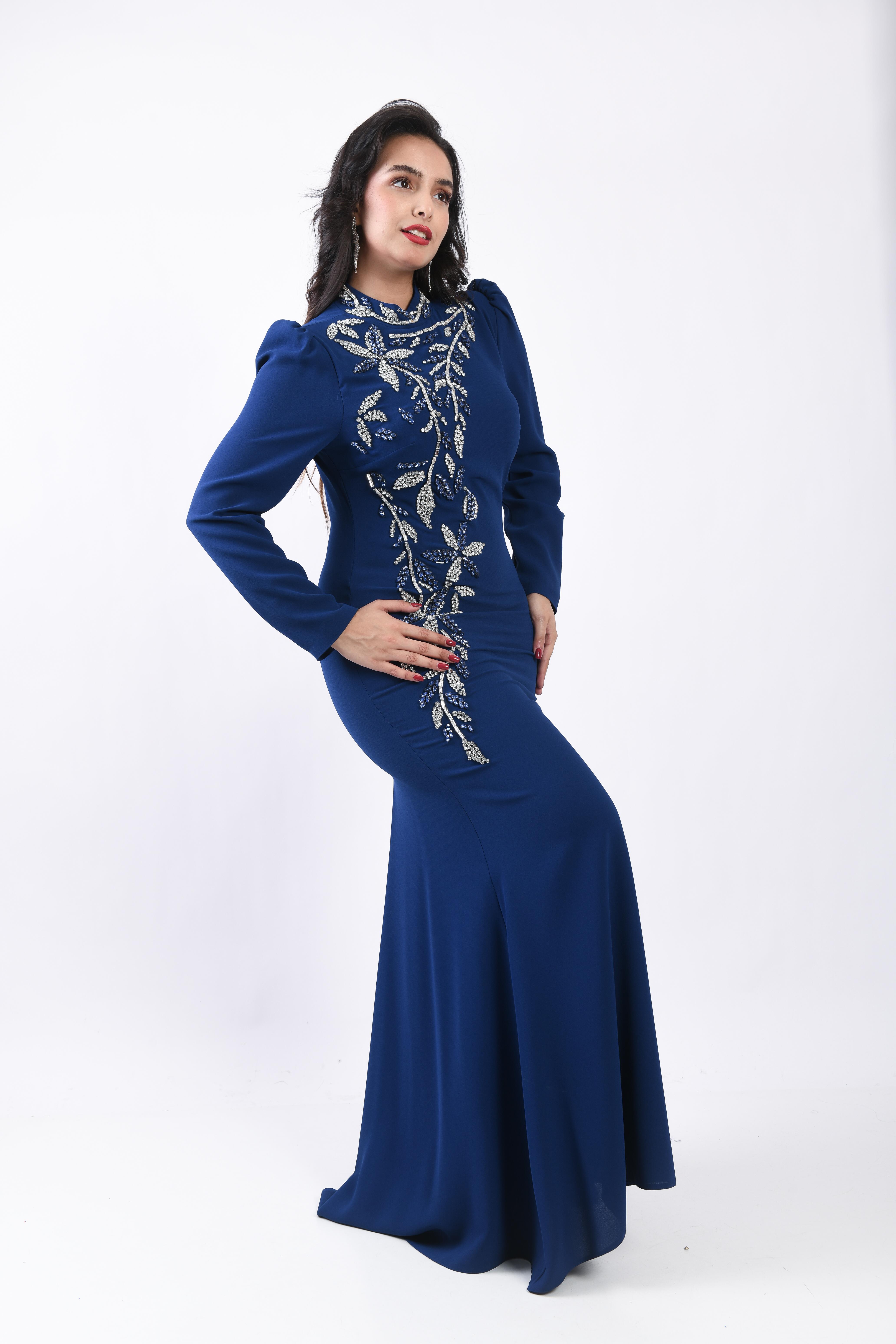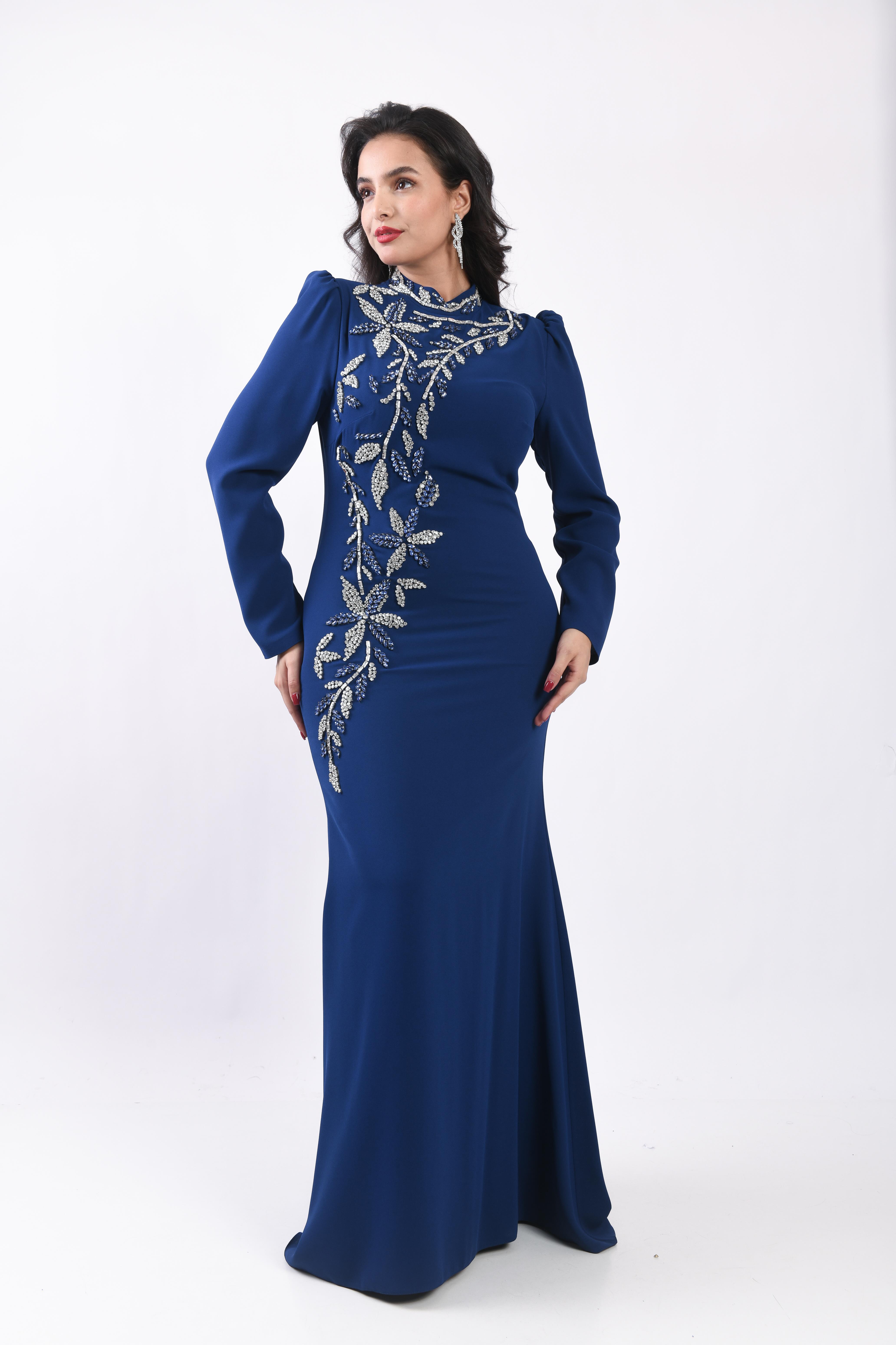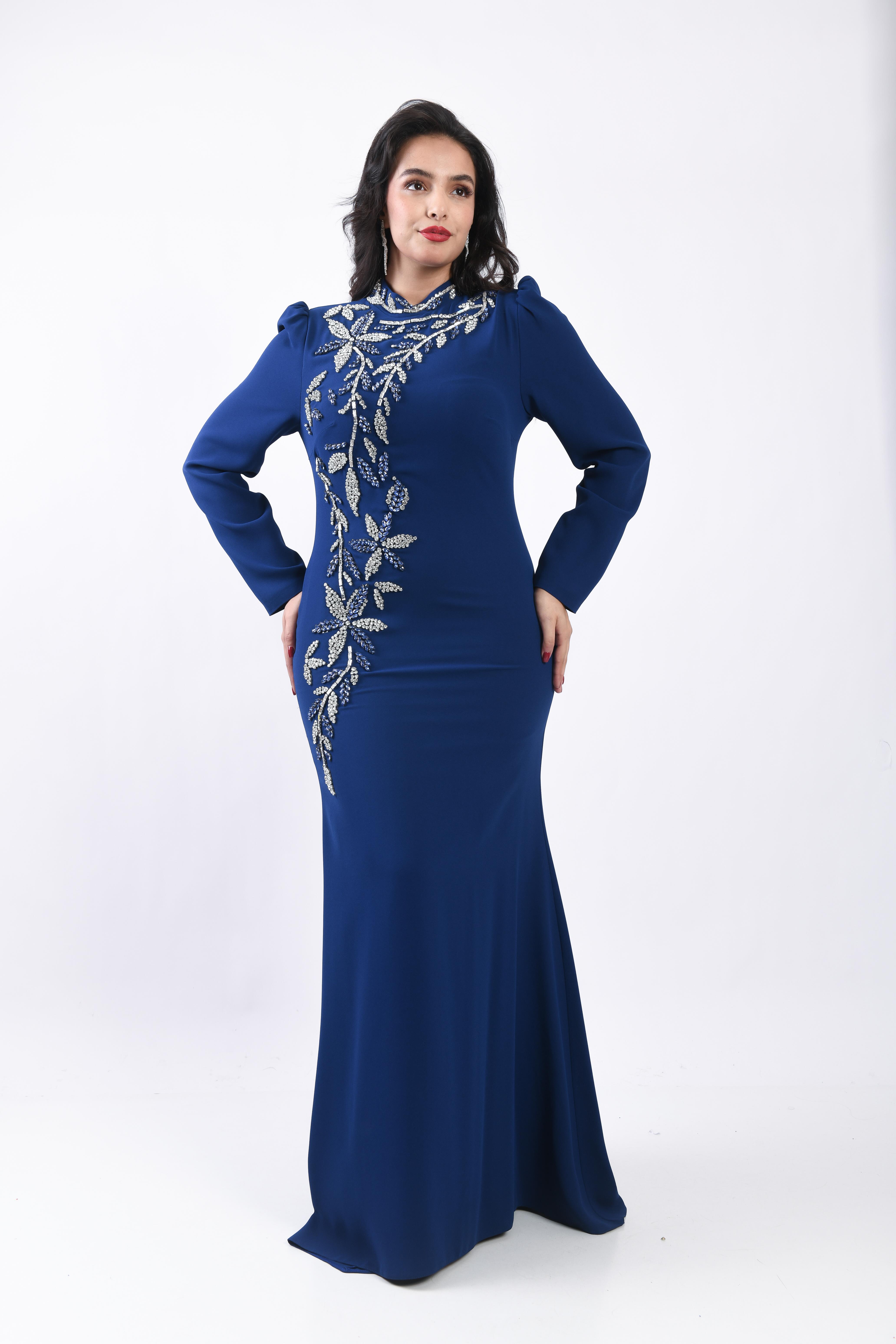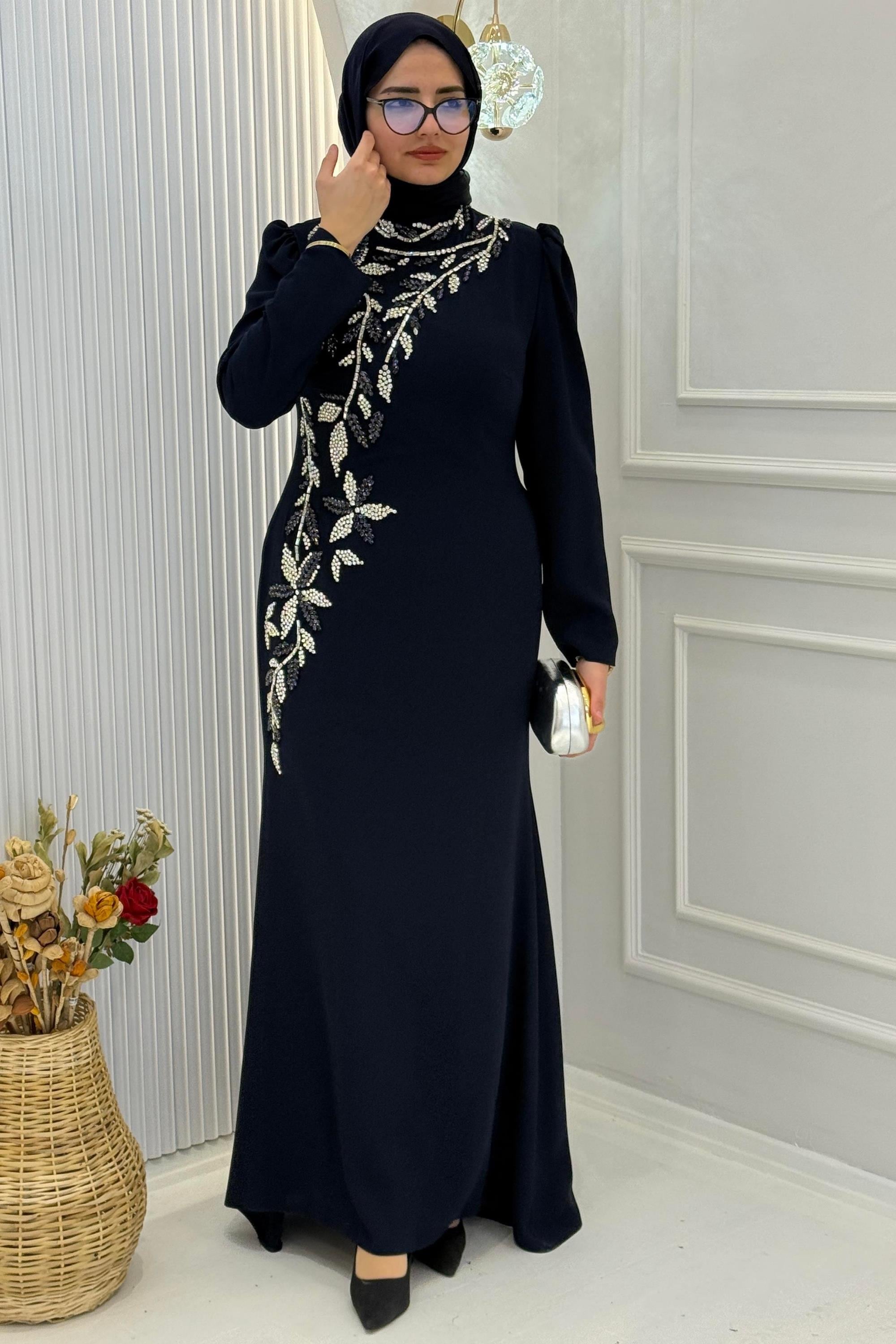 Prenses Omuzlu Asimetrik Taş İşlemeli Uzun Abiye Lacivert OTW3135