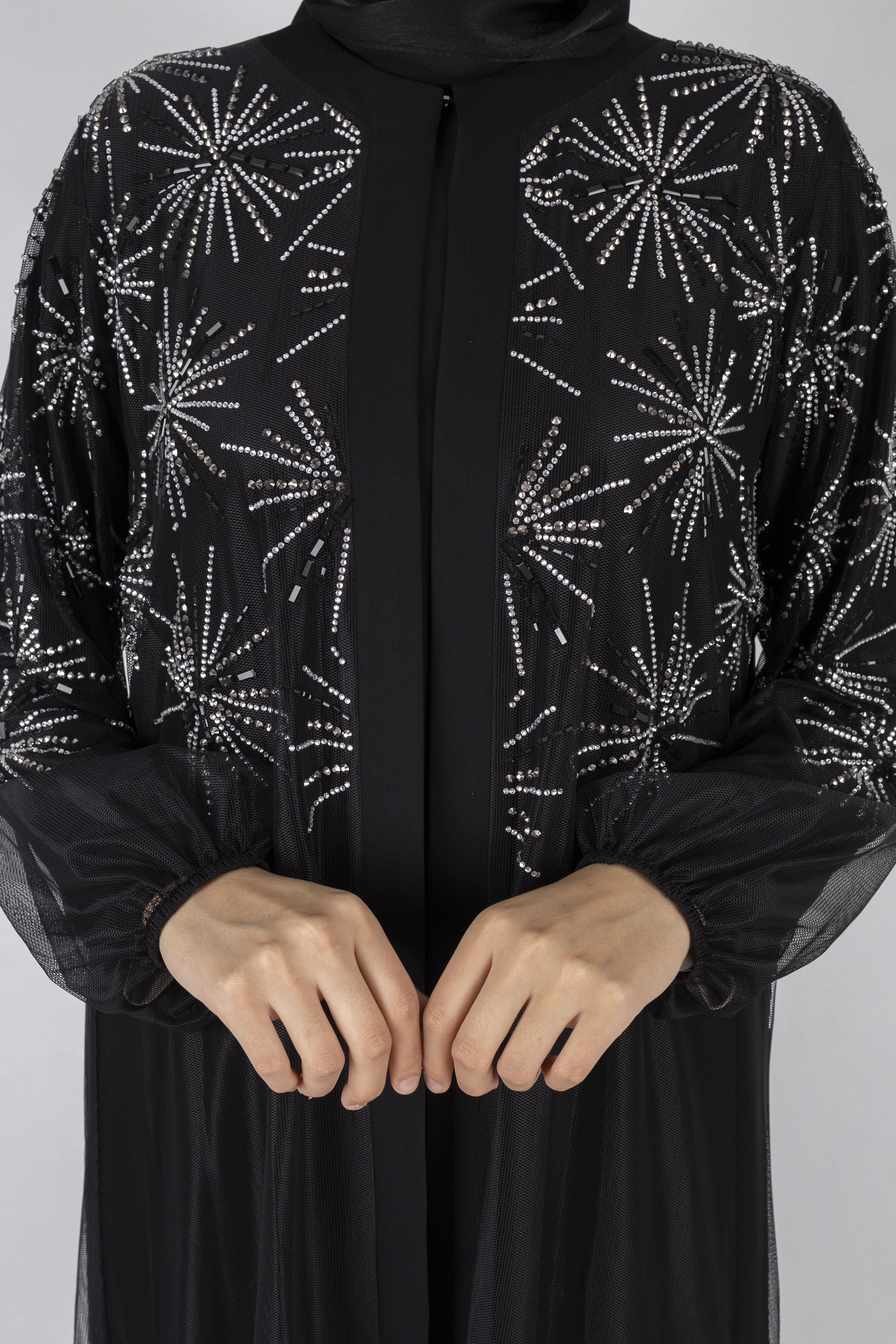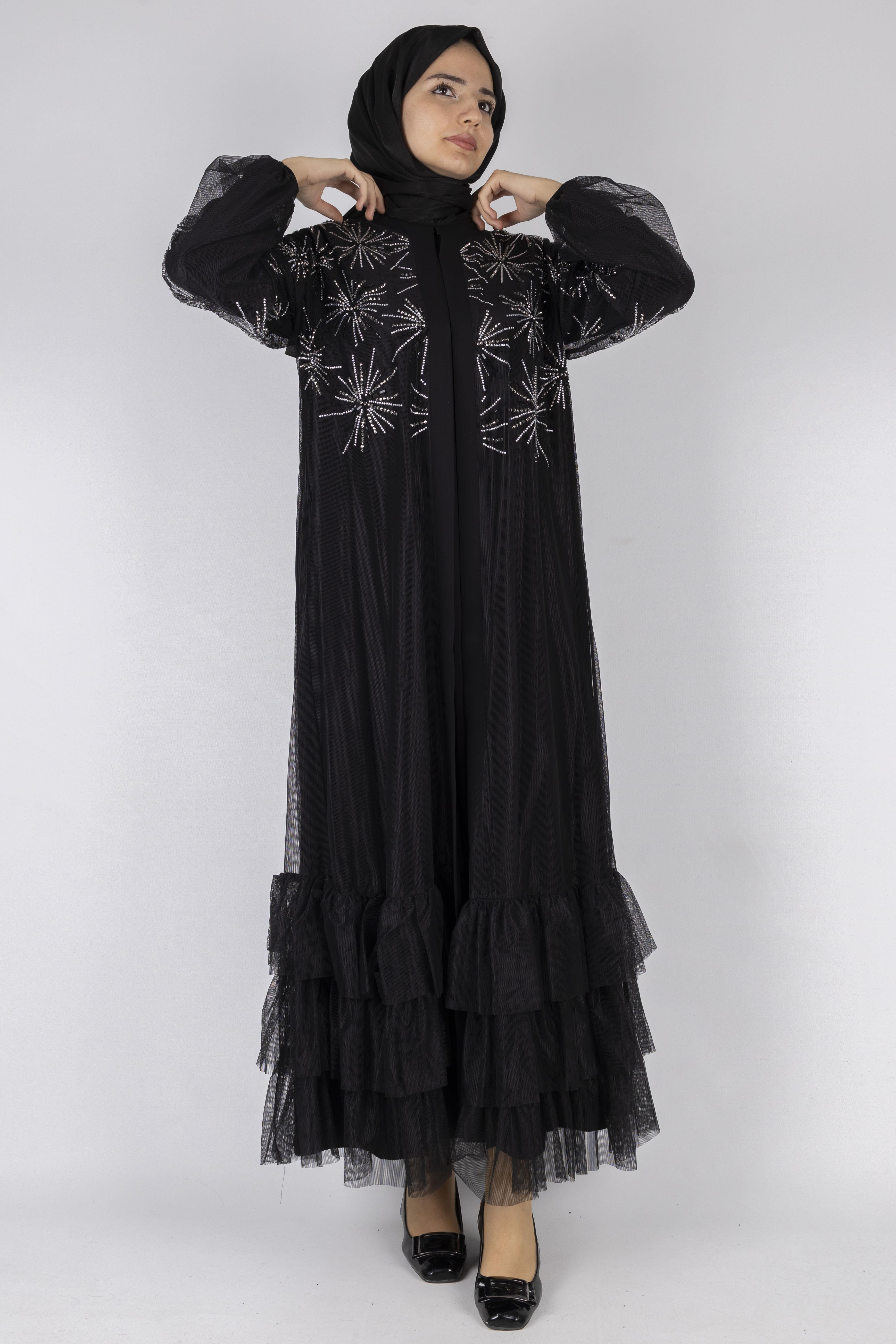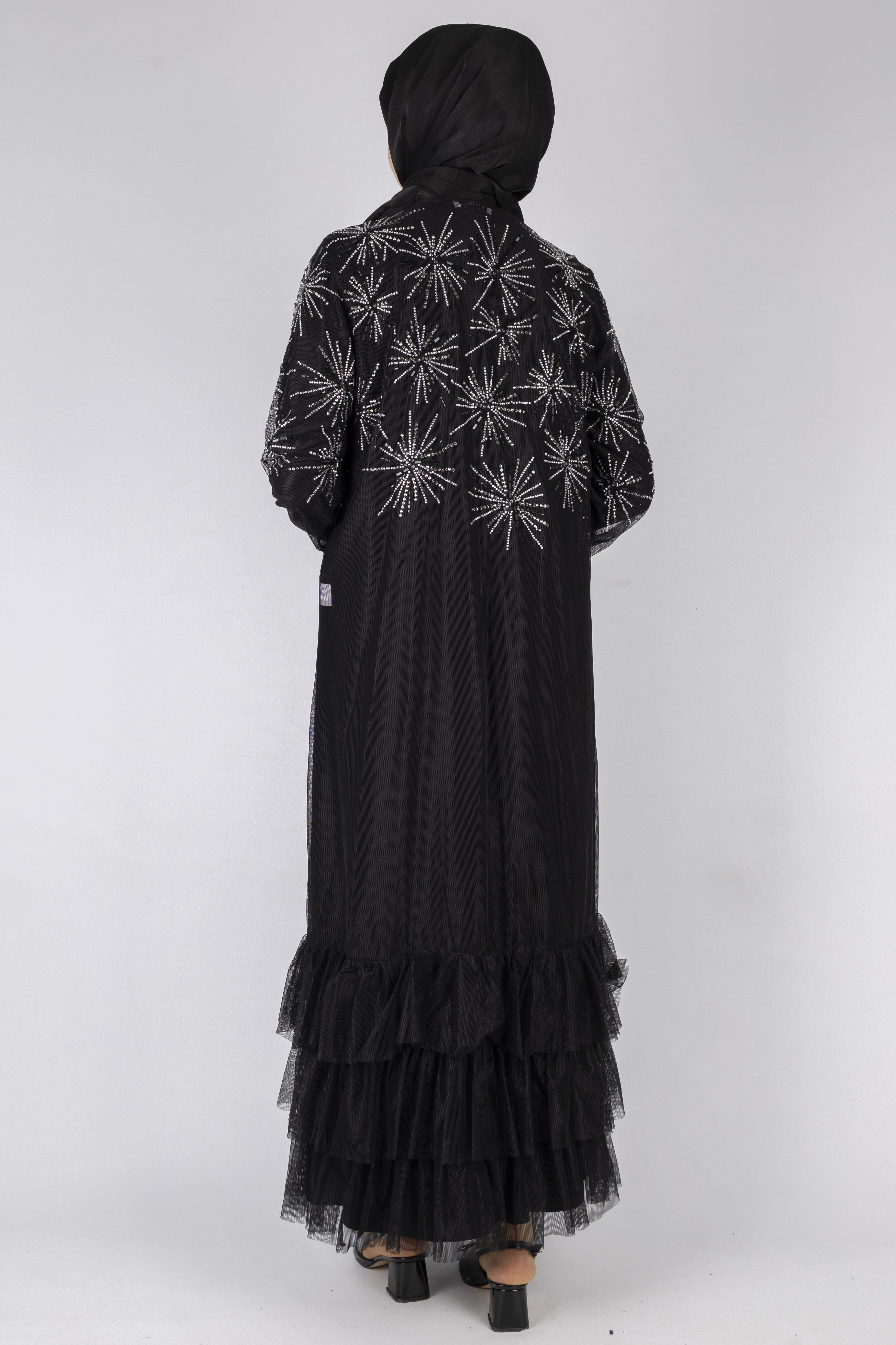 Zarafeti ışıltıyla buluşturan bu taş işlemeli siyah abaya, özel günlerden davetlere kadar asil bir duruş sunar. Üst bölümde yer alan zarif taş detayları abaya’ya göz alıcı bir şıklık katarken, tül kumaş yapısı hafif ve akıcı bir siluet oluşturur. Etek ucundaki katmanlı tül detayı hareketli ve feminen bir görünüm sağlar.