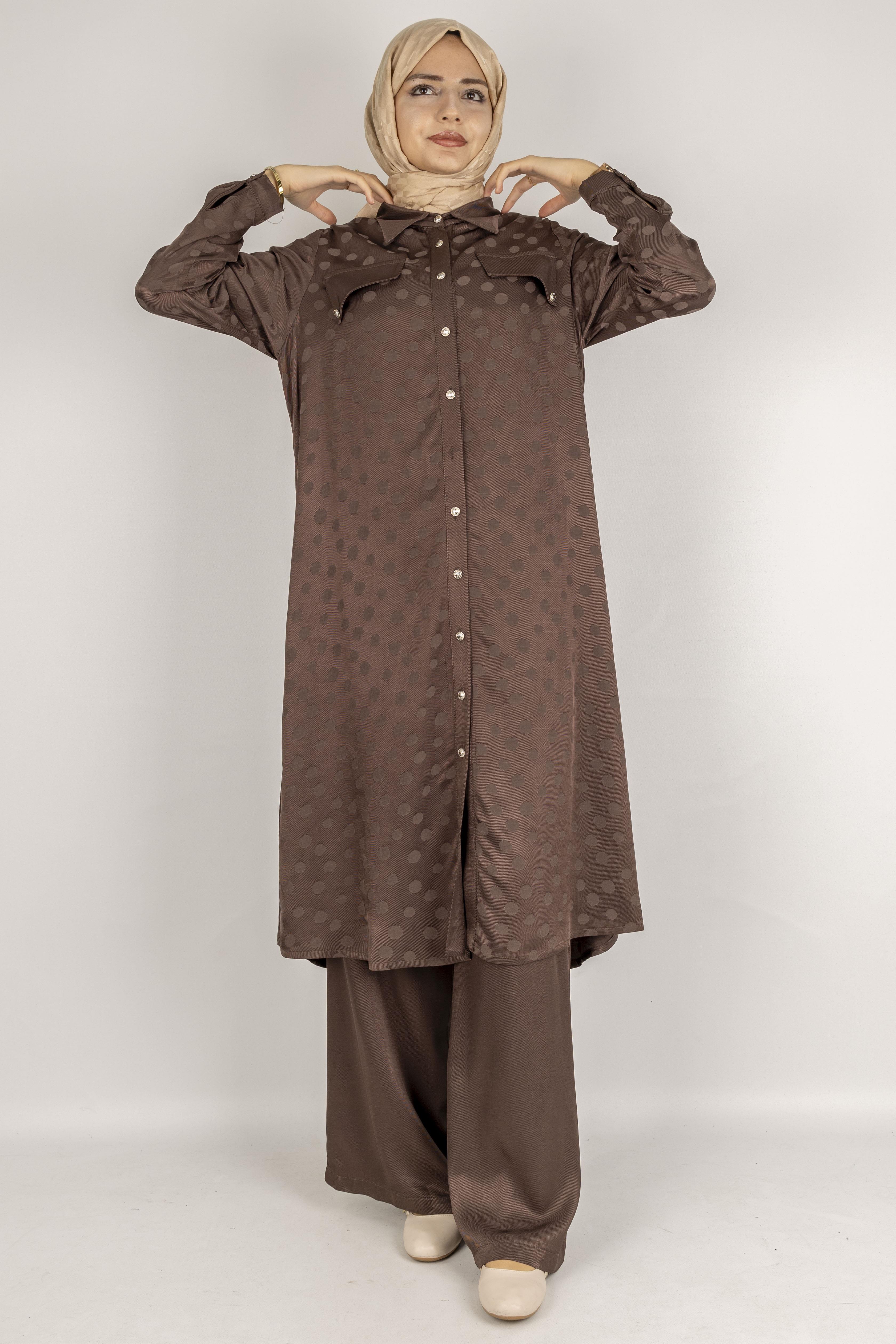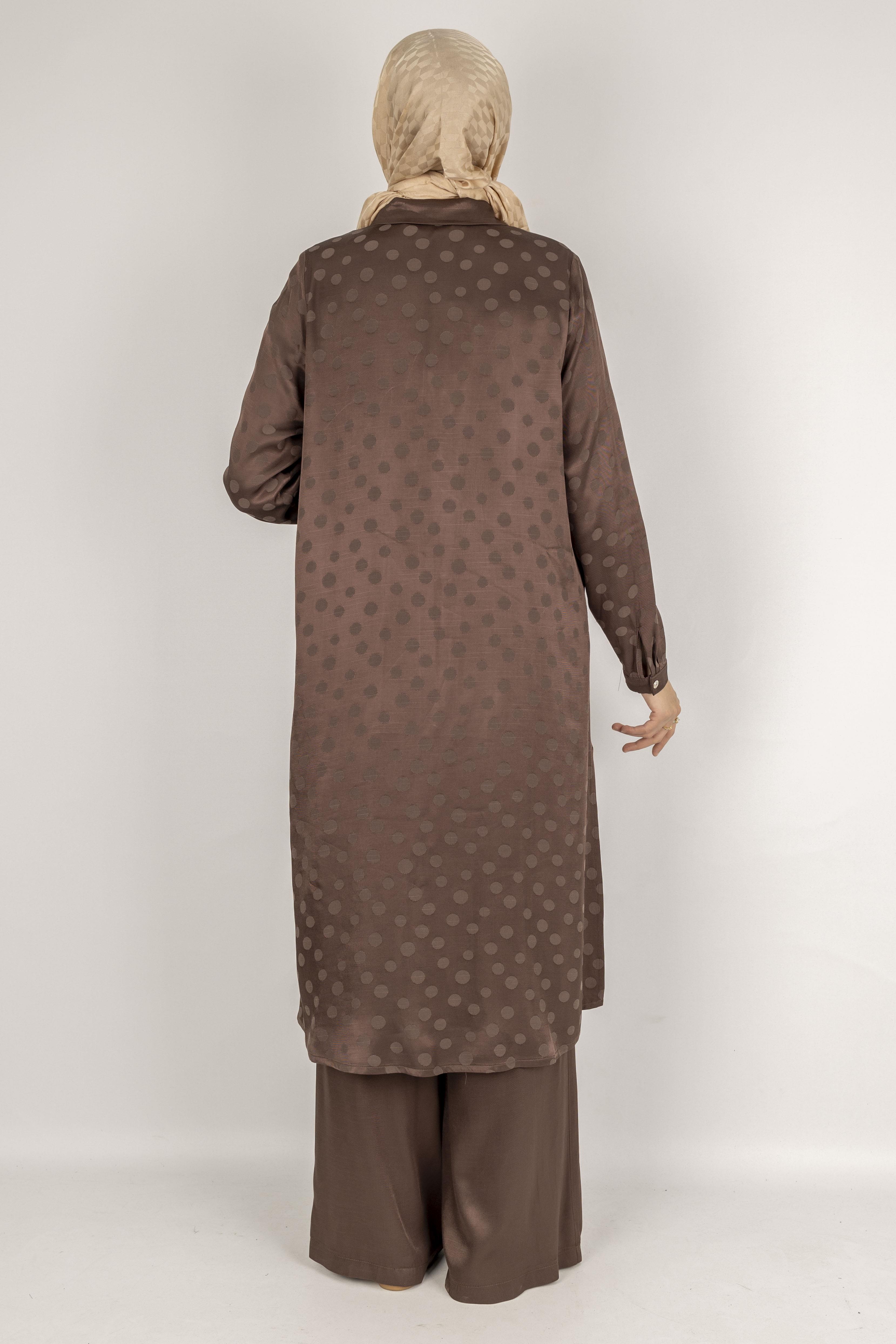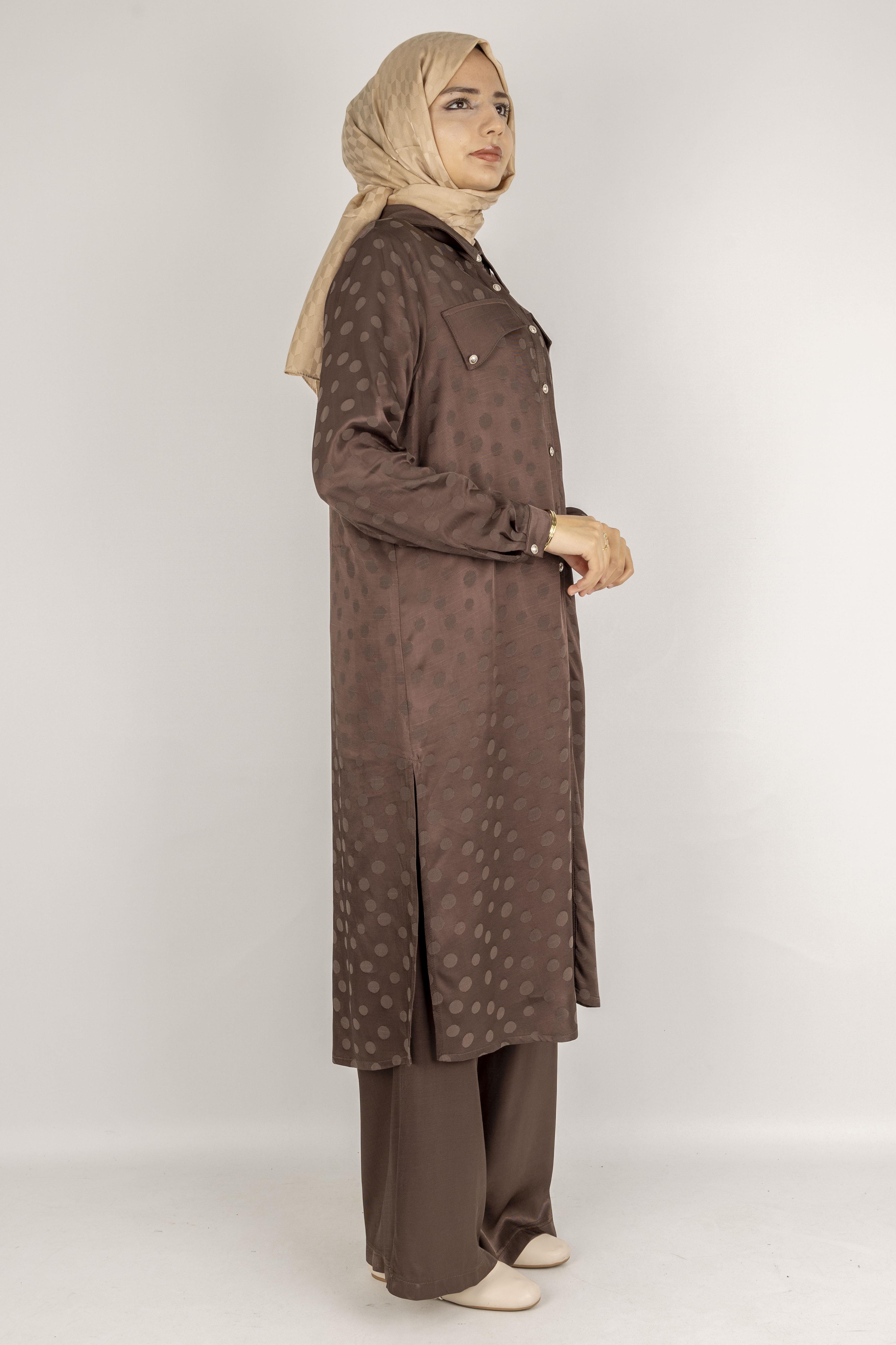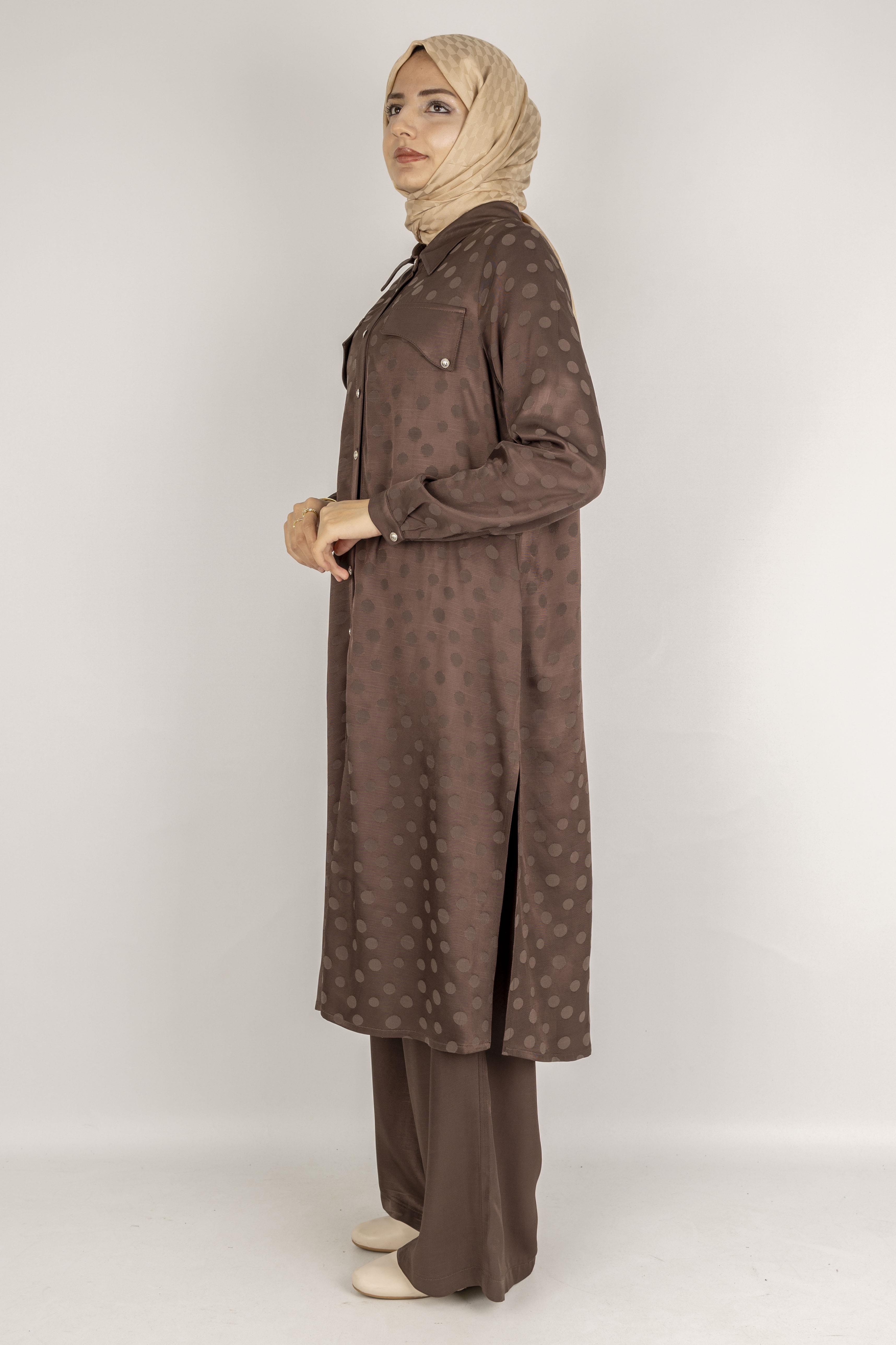 Qupra Kumaş Puantiye Desenli Tesettür Takım Kahve OTW45830
