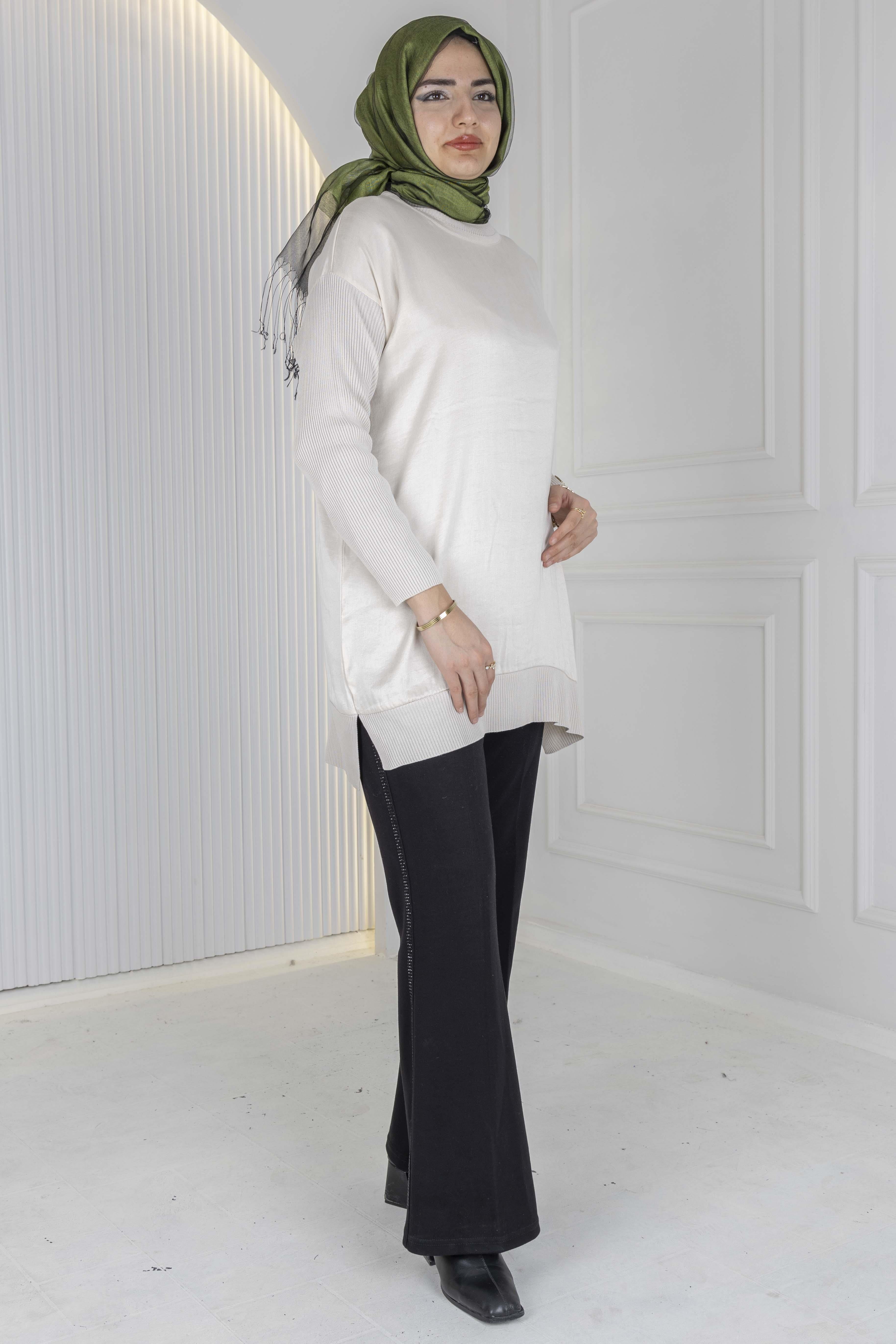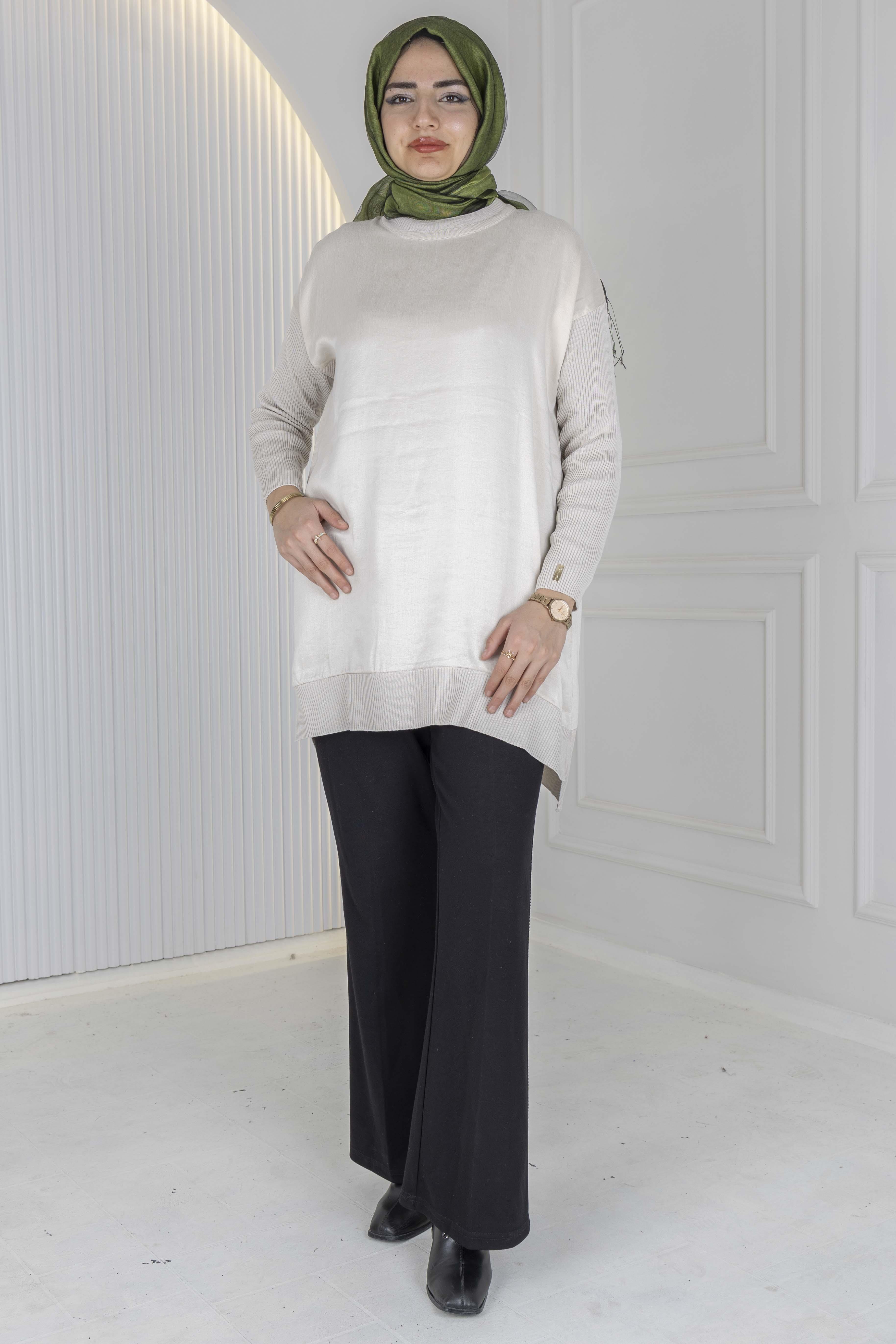 Asimetrik boy yapısı ile modern bir siluet oluşturan tasarımda, arka boyun daha uzun tutulması kalça bölgesinde dengeli ve zarif bir görünüm sunar. Standart beden olarak tasarlanan rahat kalıbı sayesinde farklı vücut tiplerine uyum sağlar.