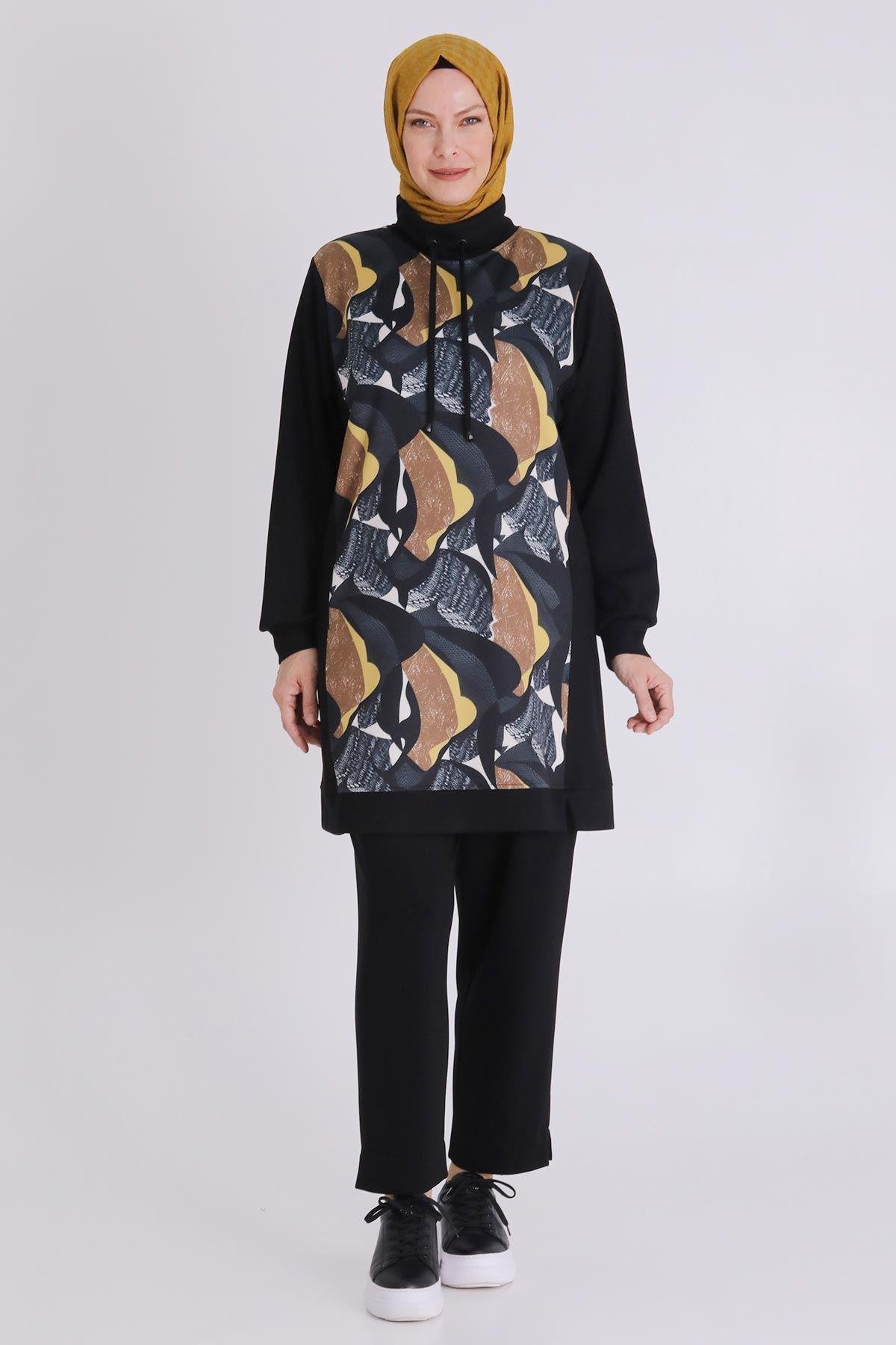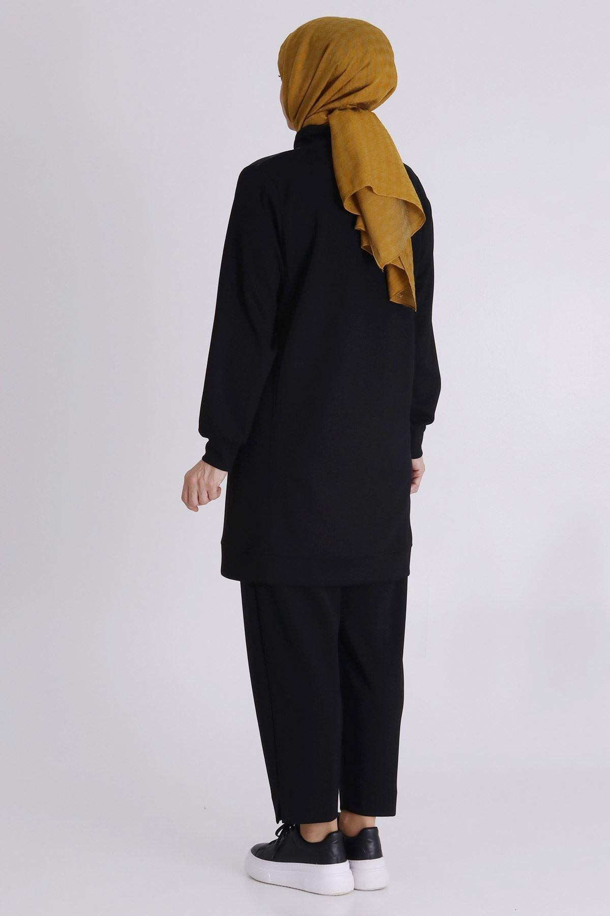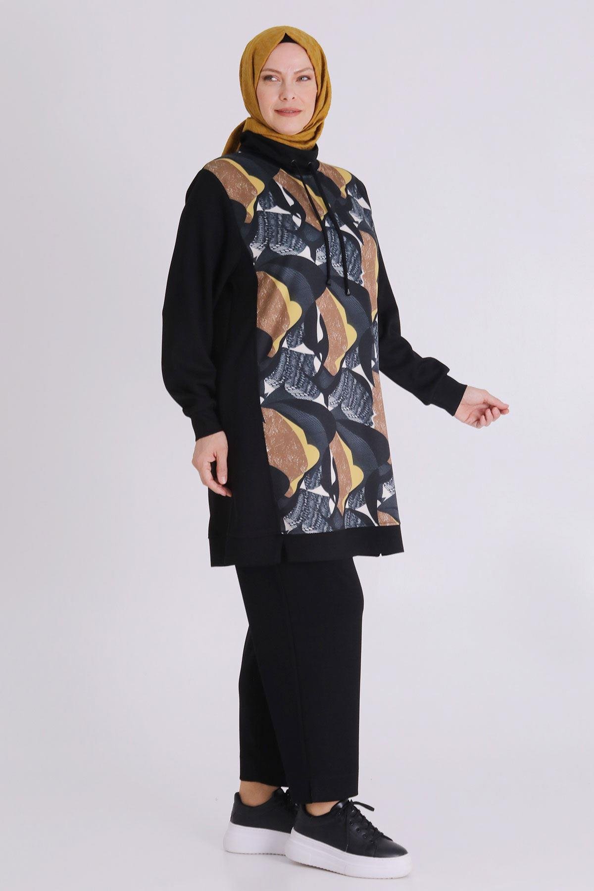 Ürün Detayları: Dik yaka modelimiz desenli kumaş kombinlidir. Pantolon beli lastkili ve iki yandan ceplidir.