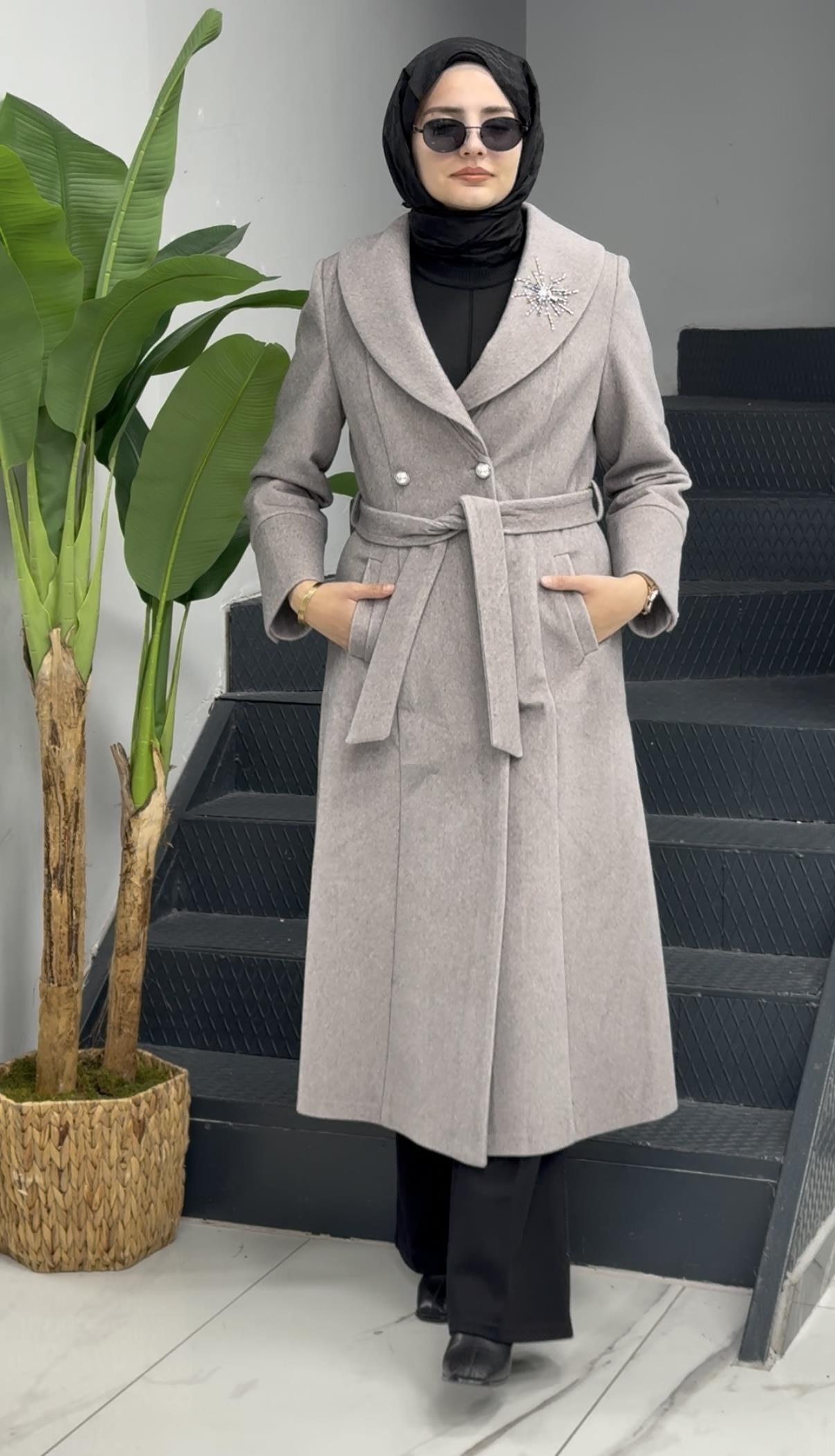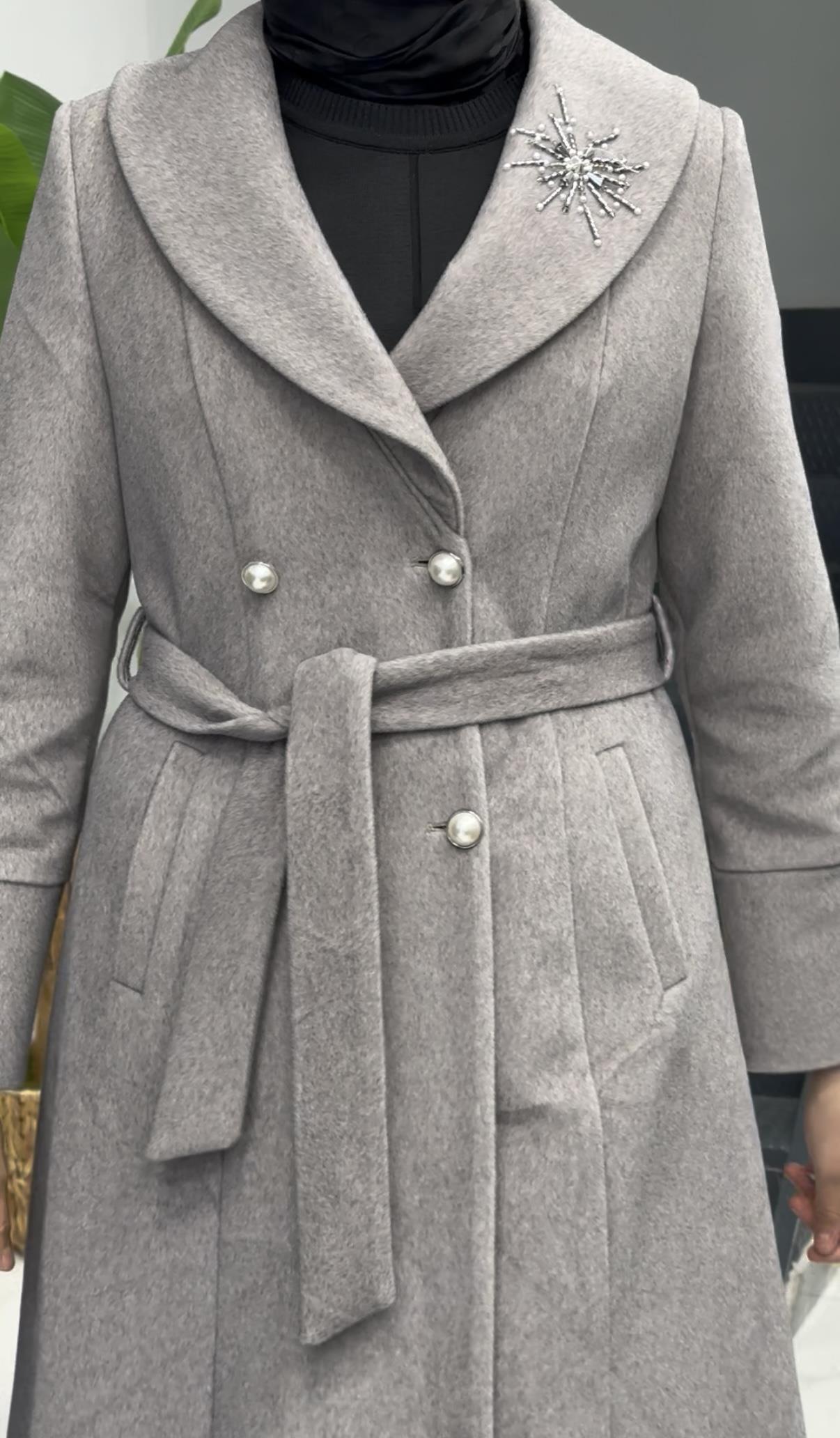 Şal Yaka Kuşaklı Kaşe Kaban Krem OTW3770