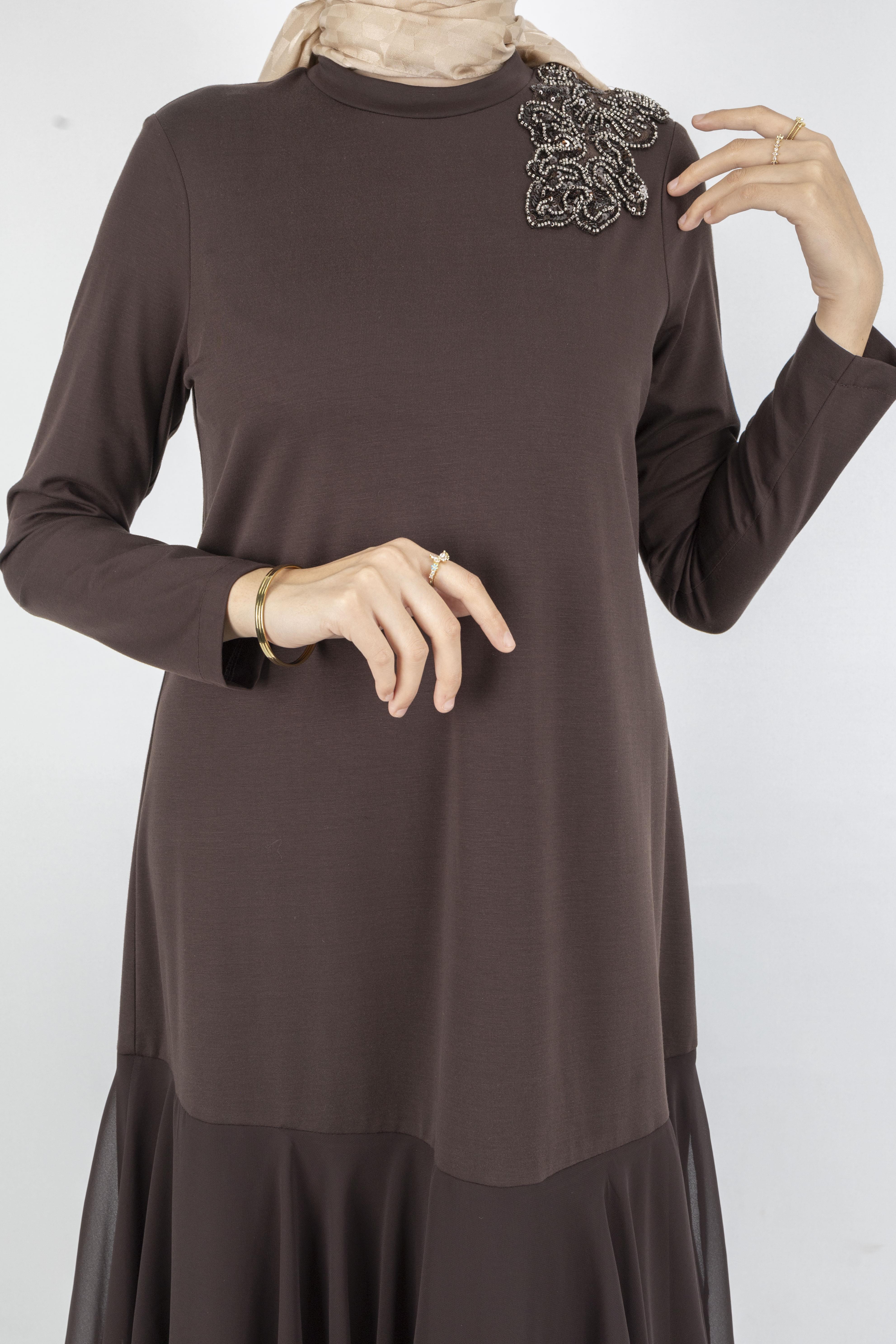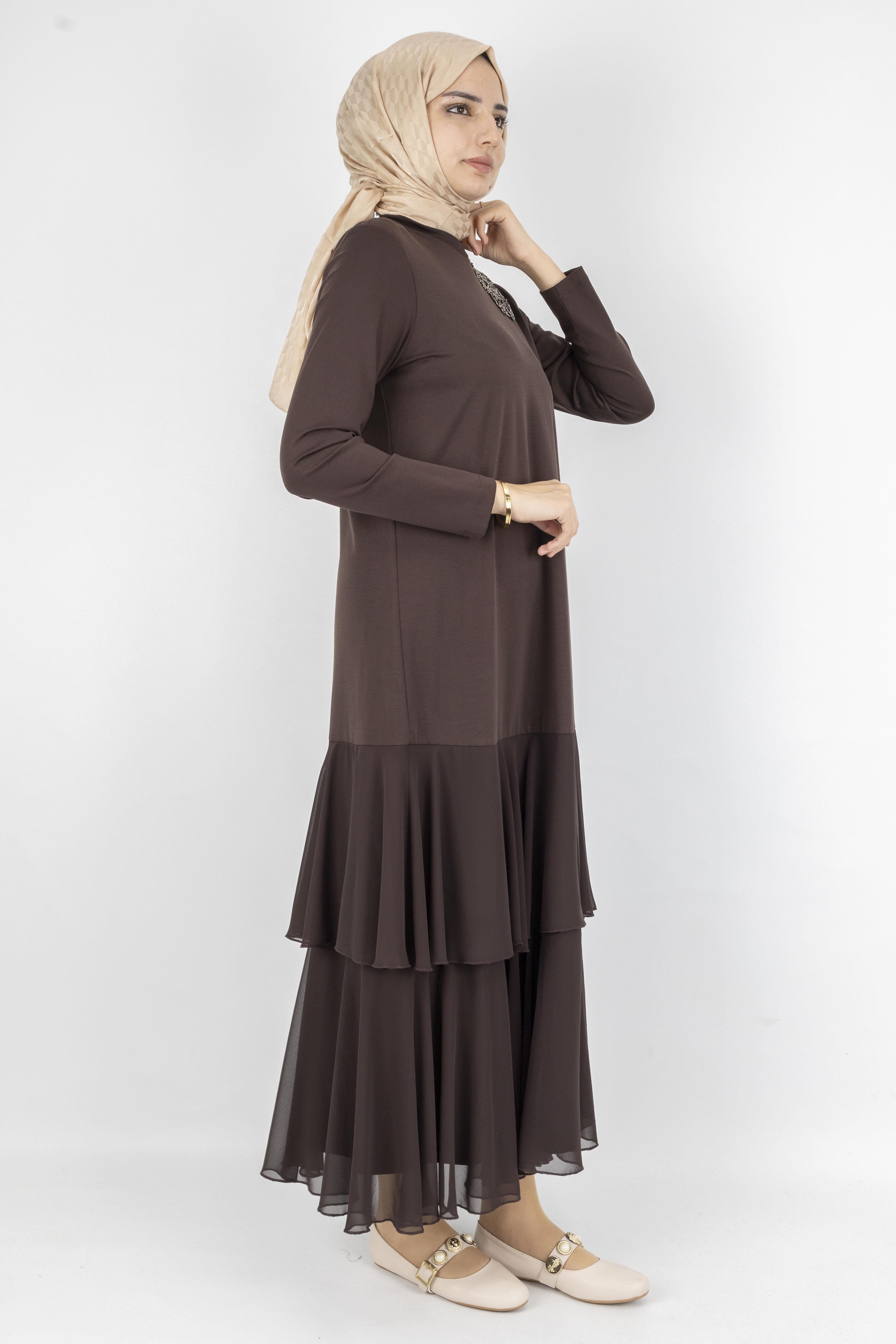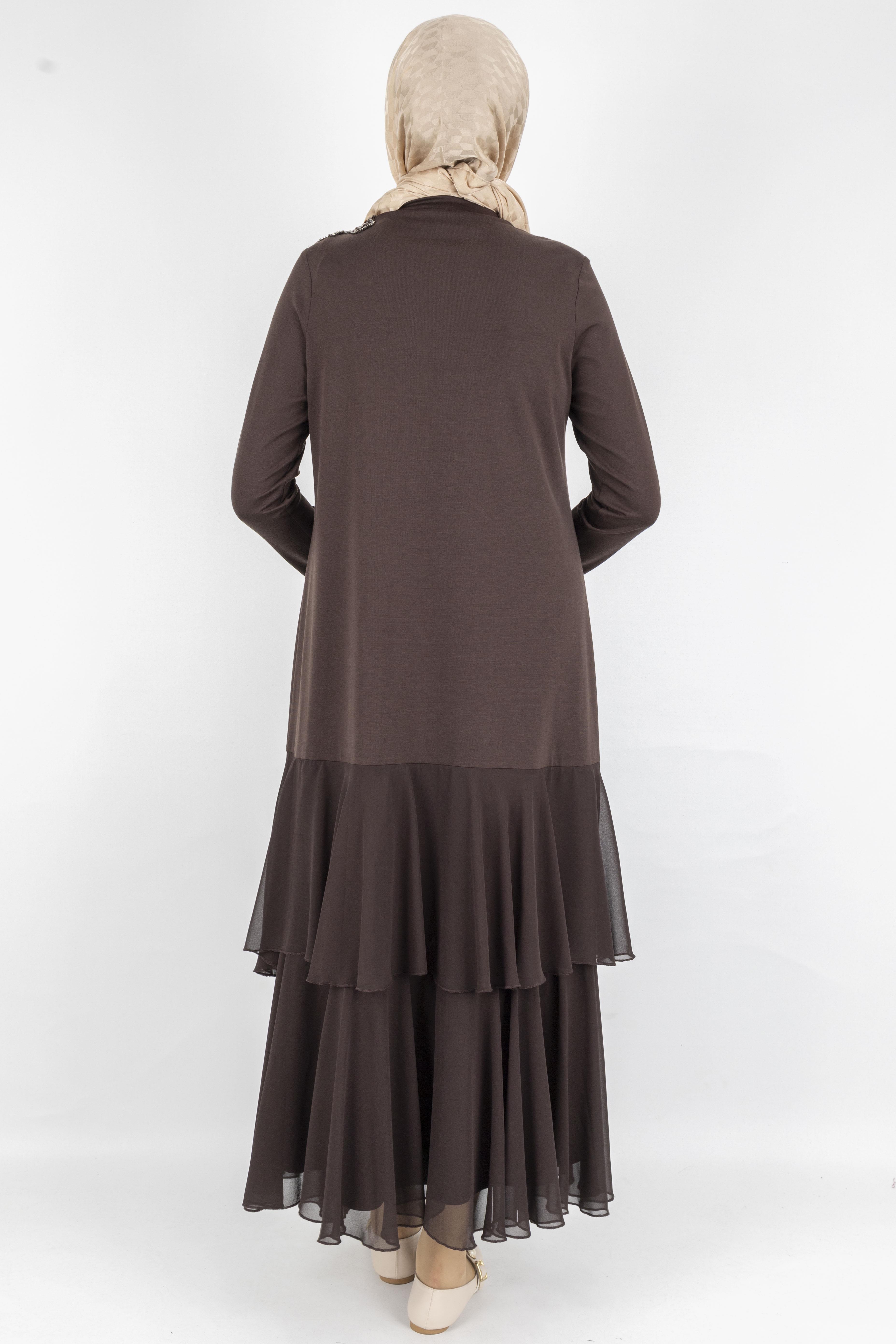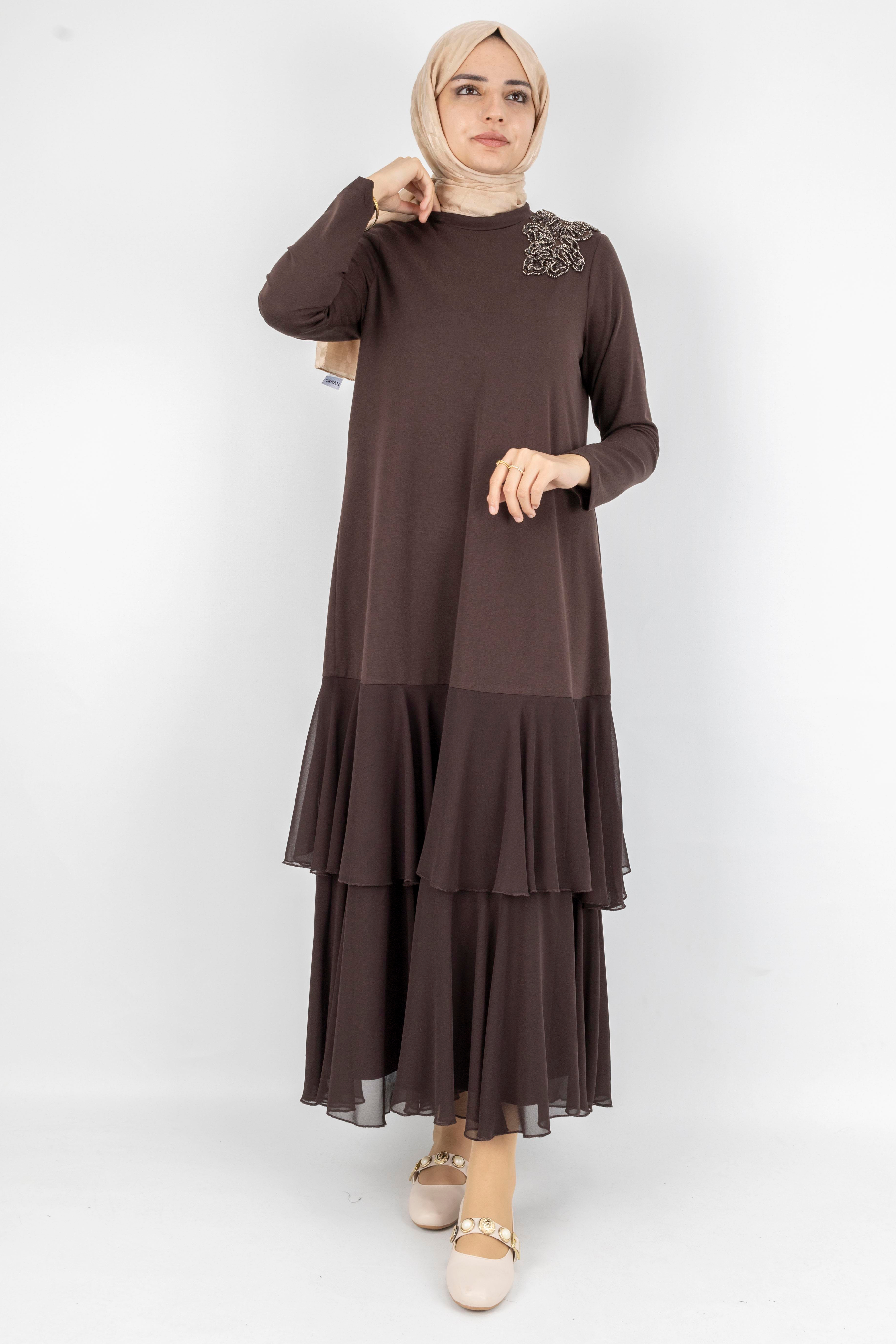 Şifon Katlı Omuz Taşlı Çelik Örme Uzun Elbise Kahve OTW25170