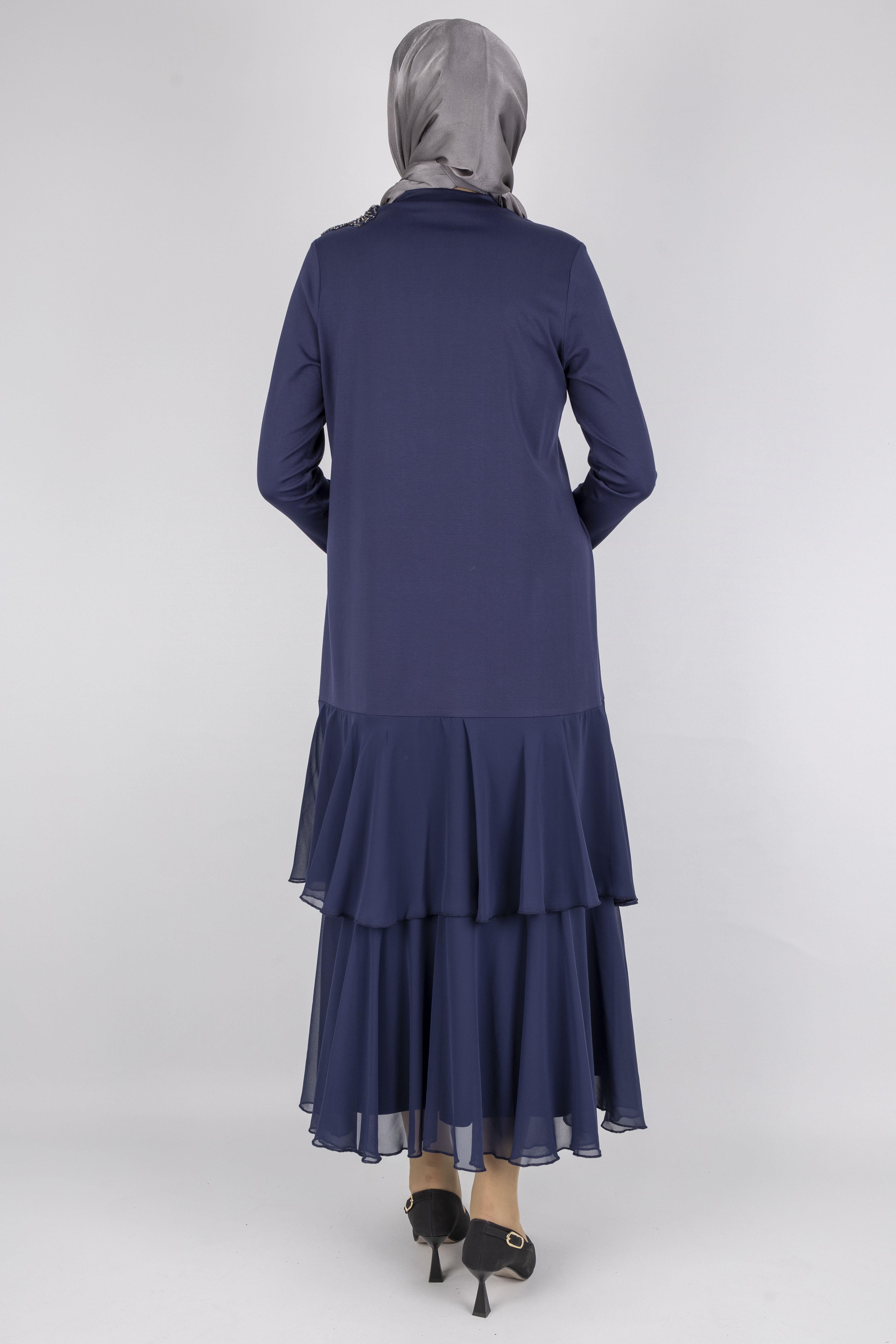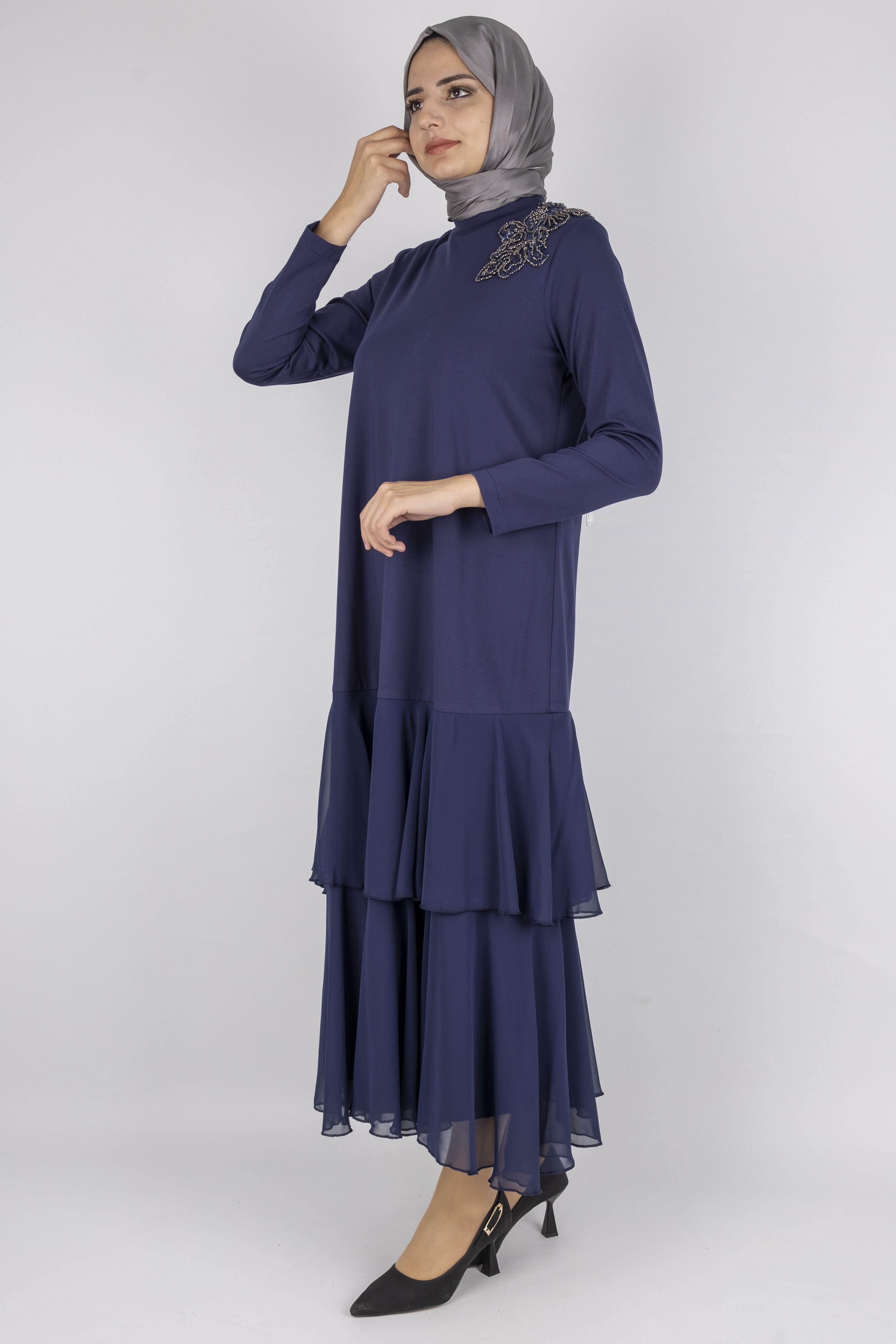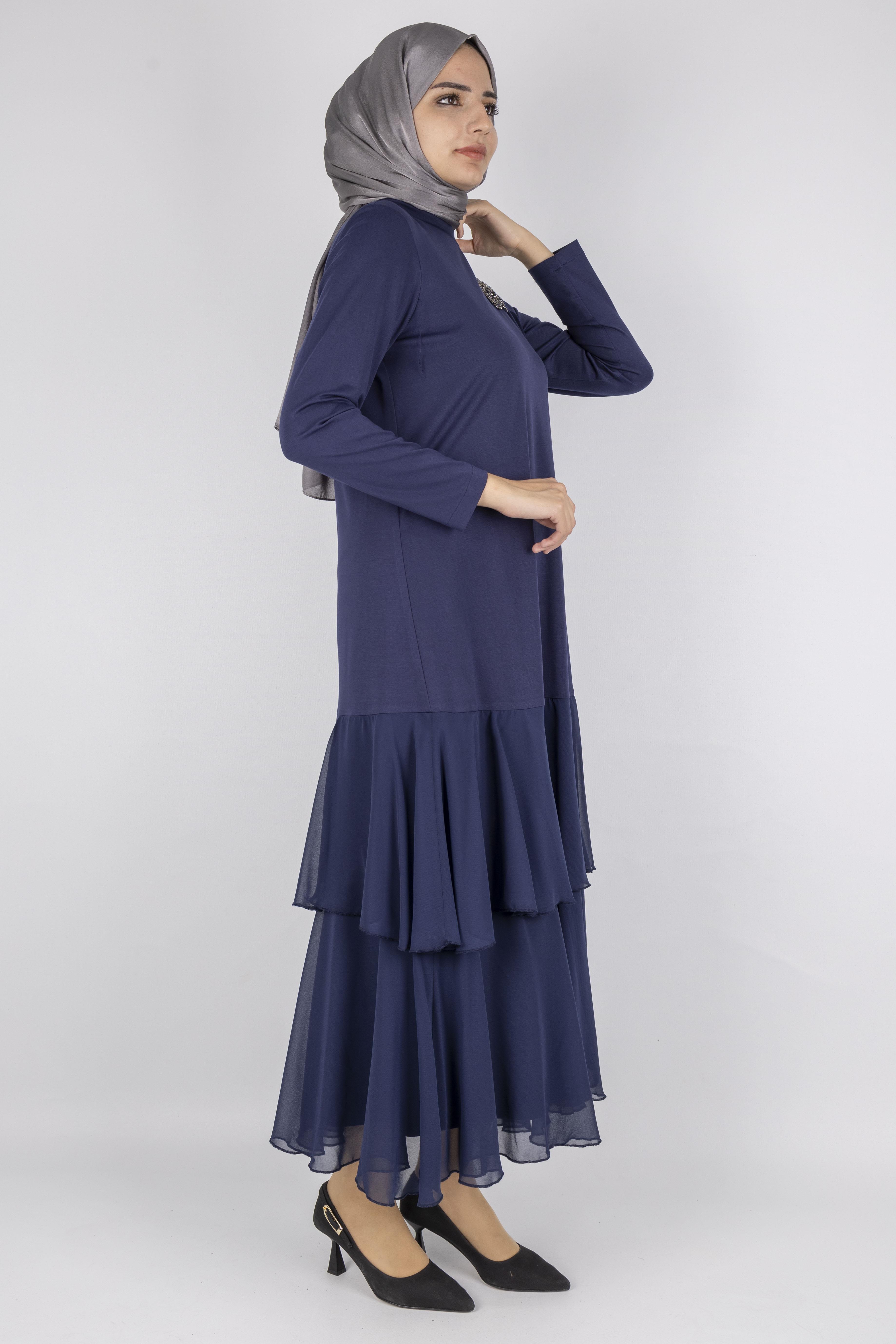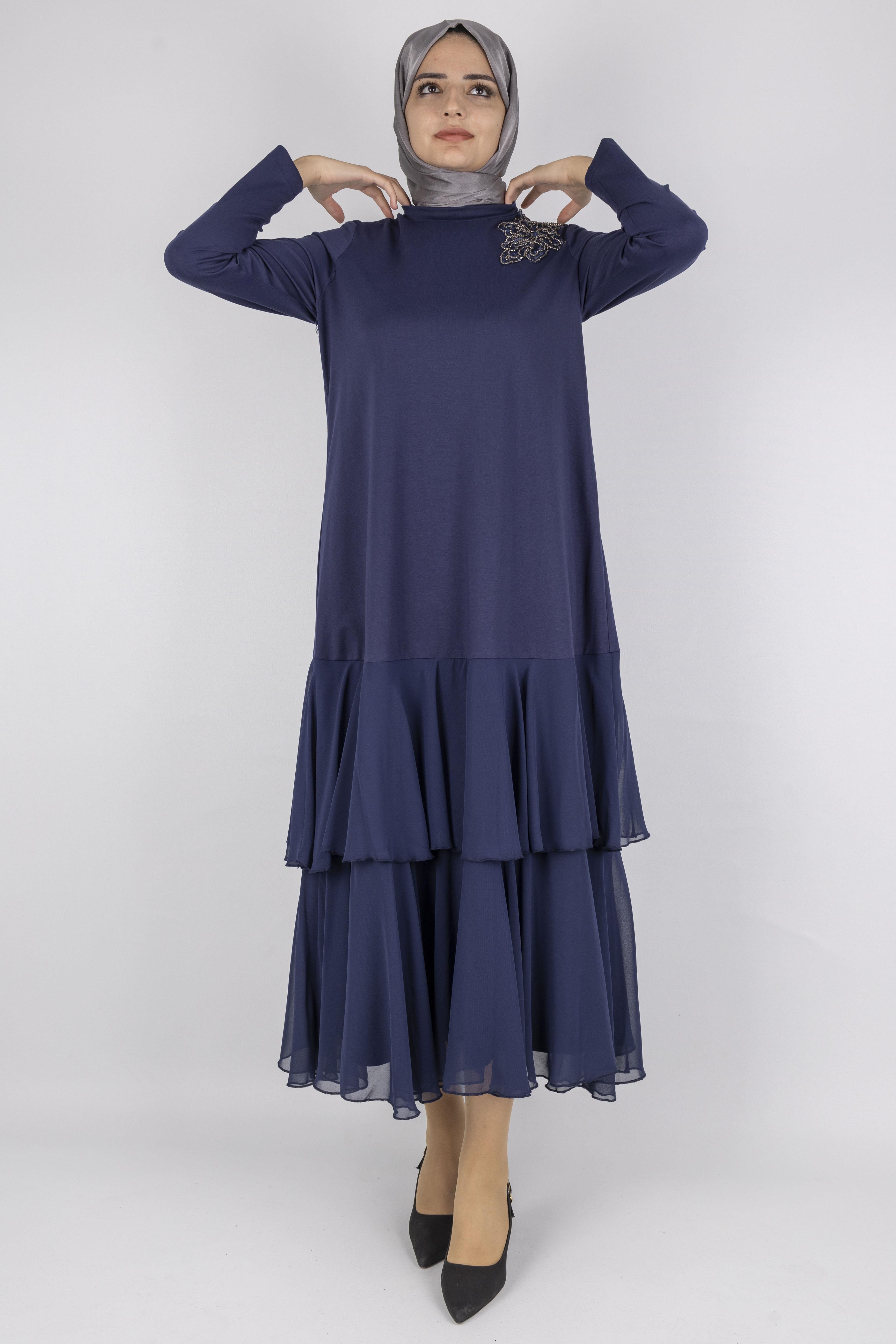 Zarafeti sade şıklıkla buluşturan bu elbise, üst kısmında kullanılan çelik örme esnek kumaşı ile gün boyu konfor sağlarken, alt kısmındaki kat kat şifon etek tasarımı ile feminen ve akıcı bir görünüm sunar.