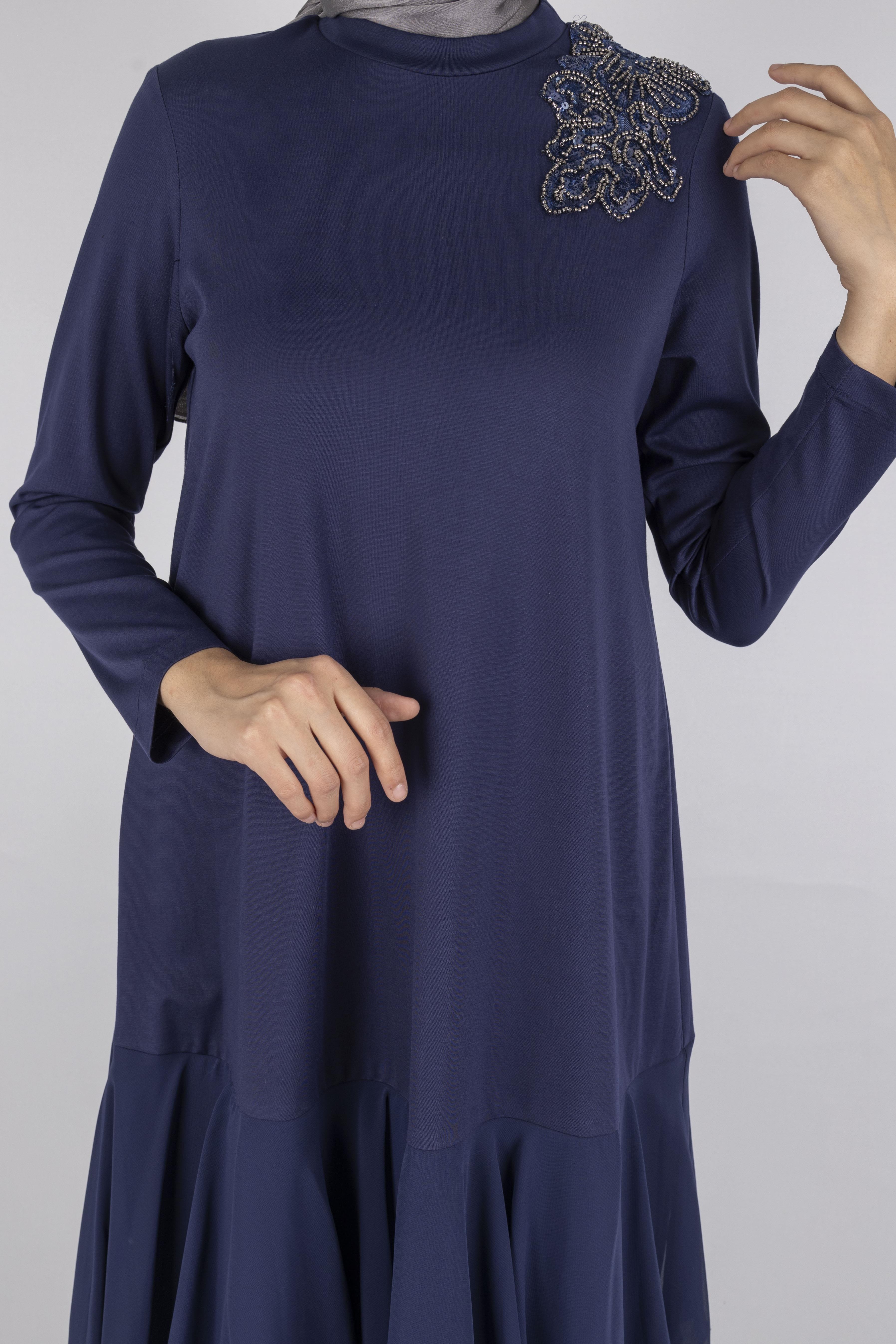 Omuzda yer alan zarif detay ürüne modern bir dokunuş katarken, elbisenin dökümlü formu hem günlük hem özel davet kombinlerine uyum sağlar. Hareket ettikçe uçuşan şifon katlar romantik bir siluet oluşturur.