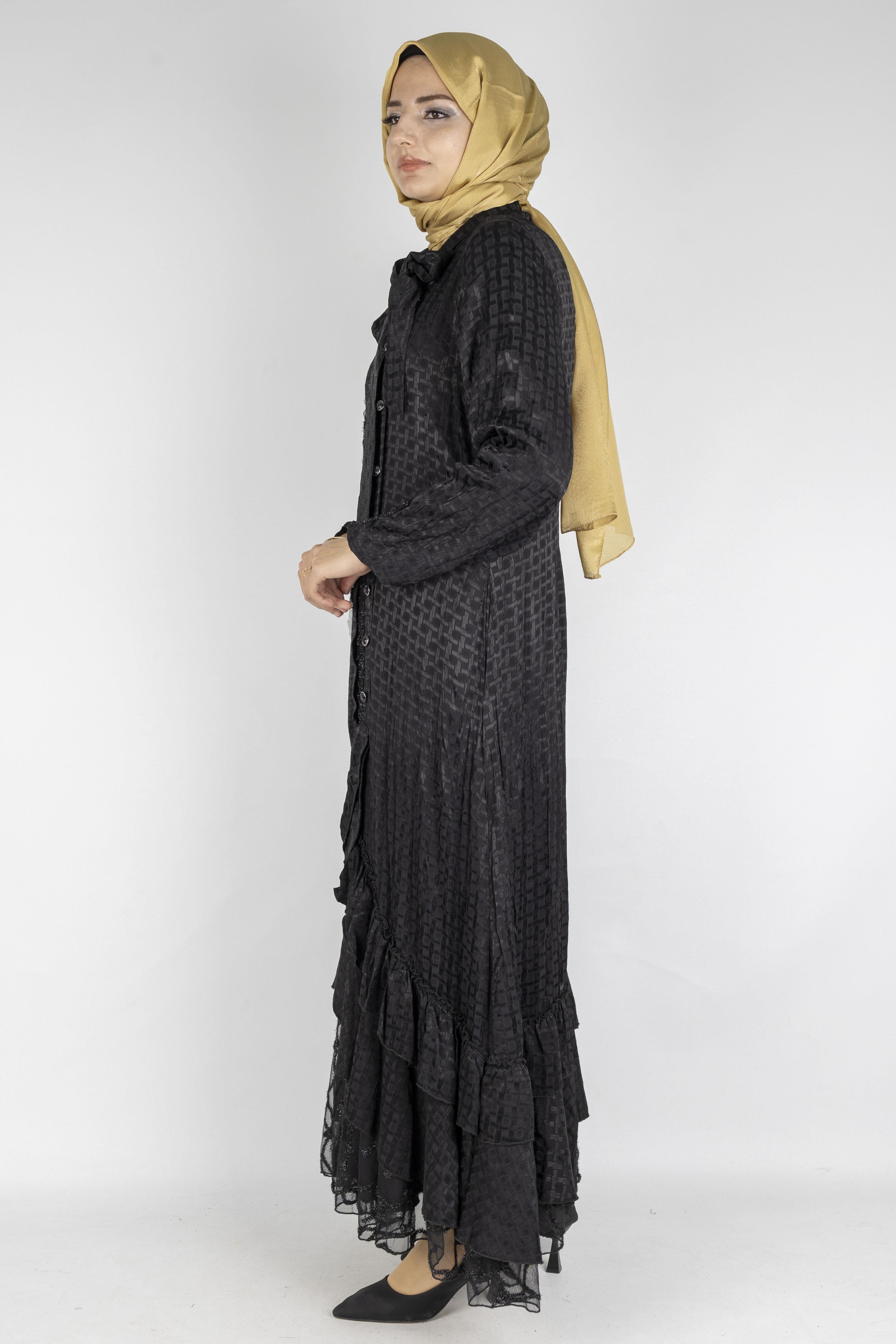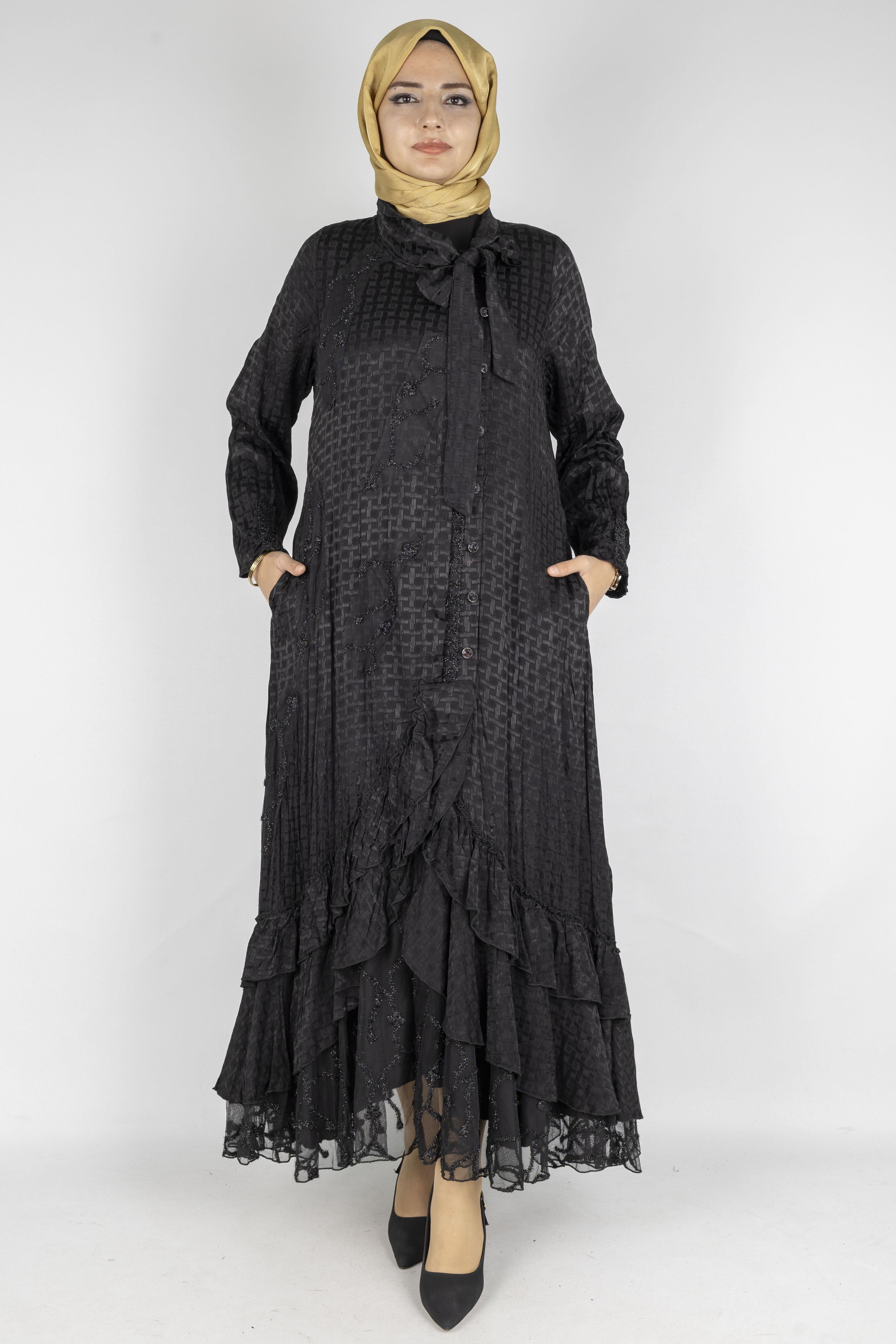 Modern ve zarif çizgileriyle dikkat çeken bu uzun elbise, özel günlerden günlük kombinlere kadar geniş kullanım alanı sunar. Yumuşak dokulu viskon cupra kumaşı, dökümlü yapısıyla vücuda rahat oturur ve konforlu bir kullanım sağlar. Ön kısmındaki düğme detayları ve hafif volanlı etek formu, modele feminen bir görünüm kazandırır.