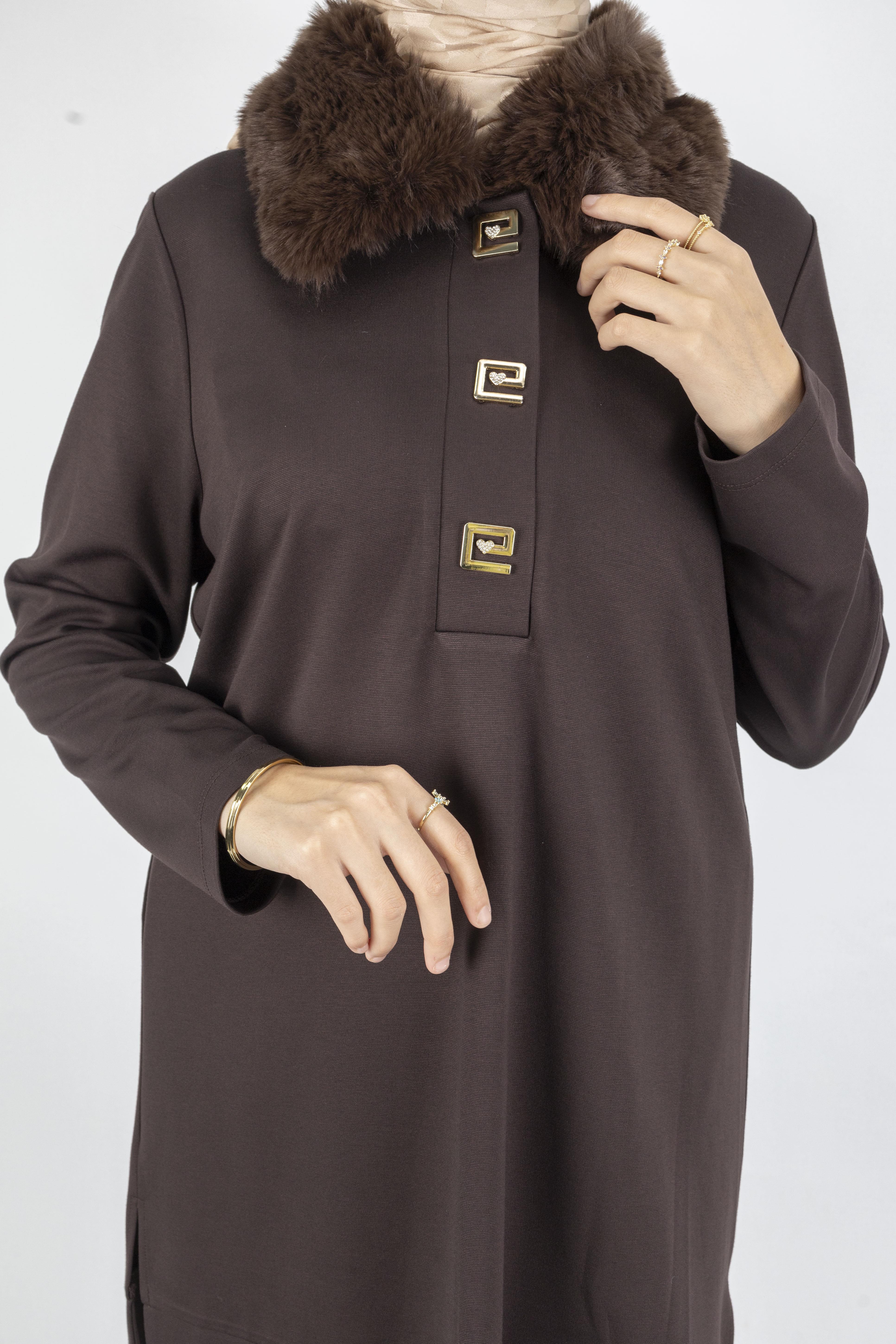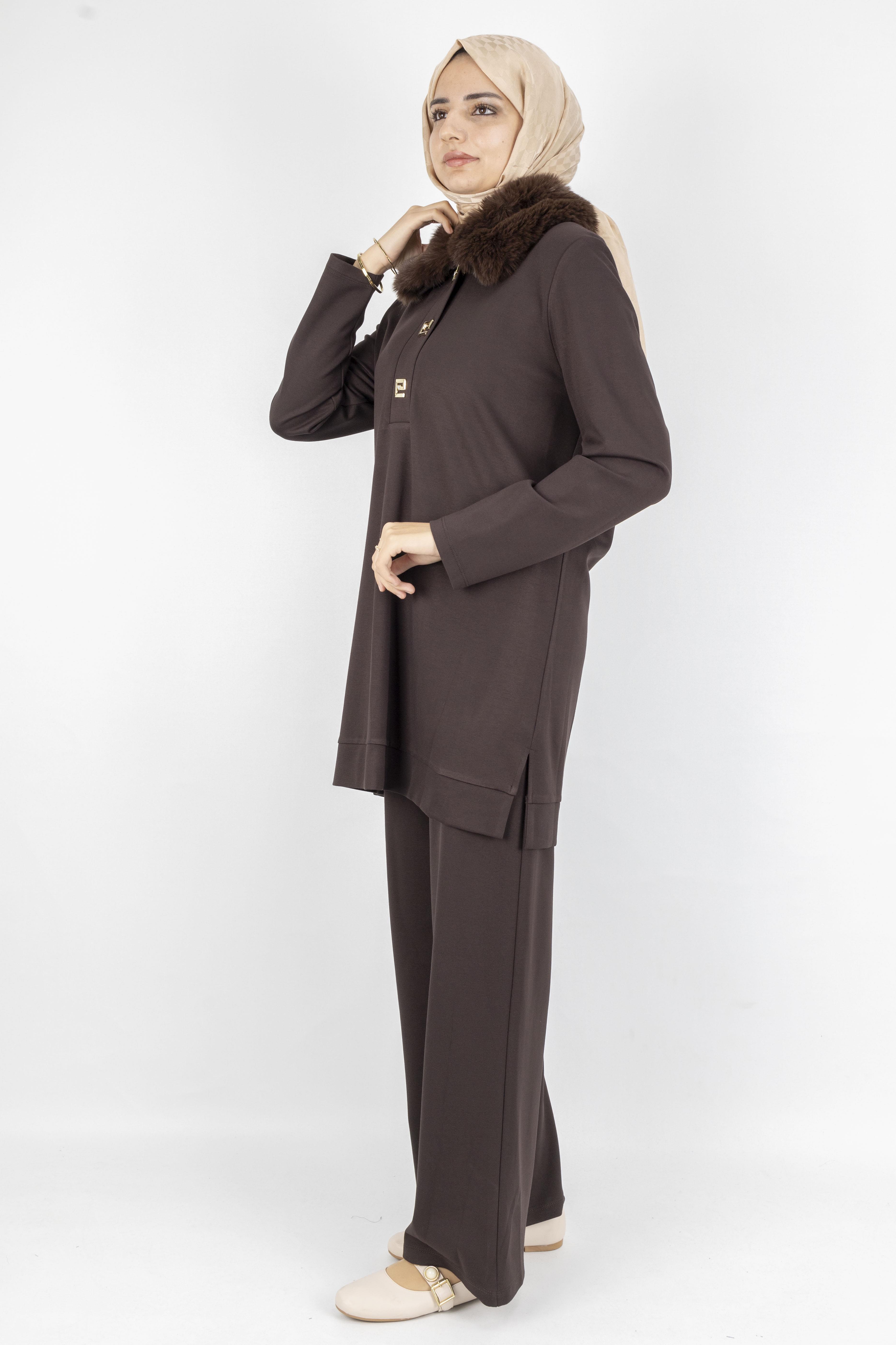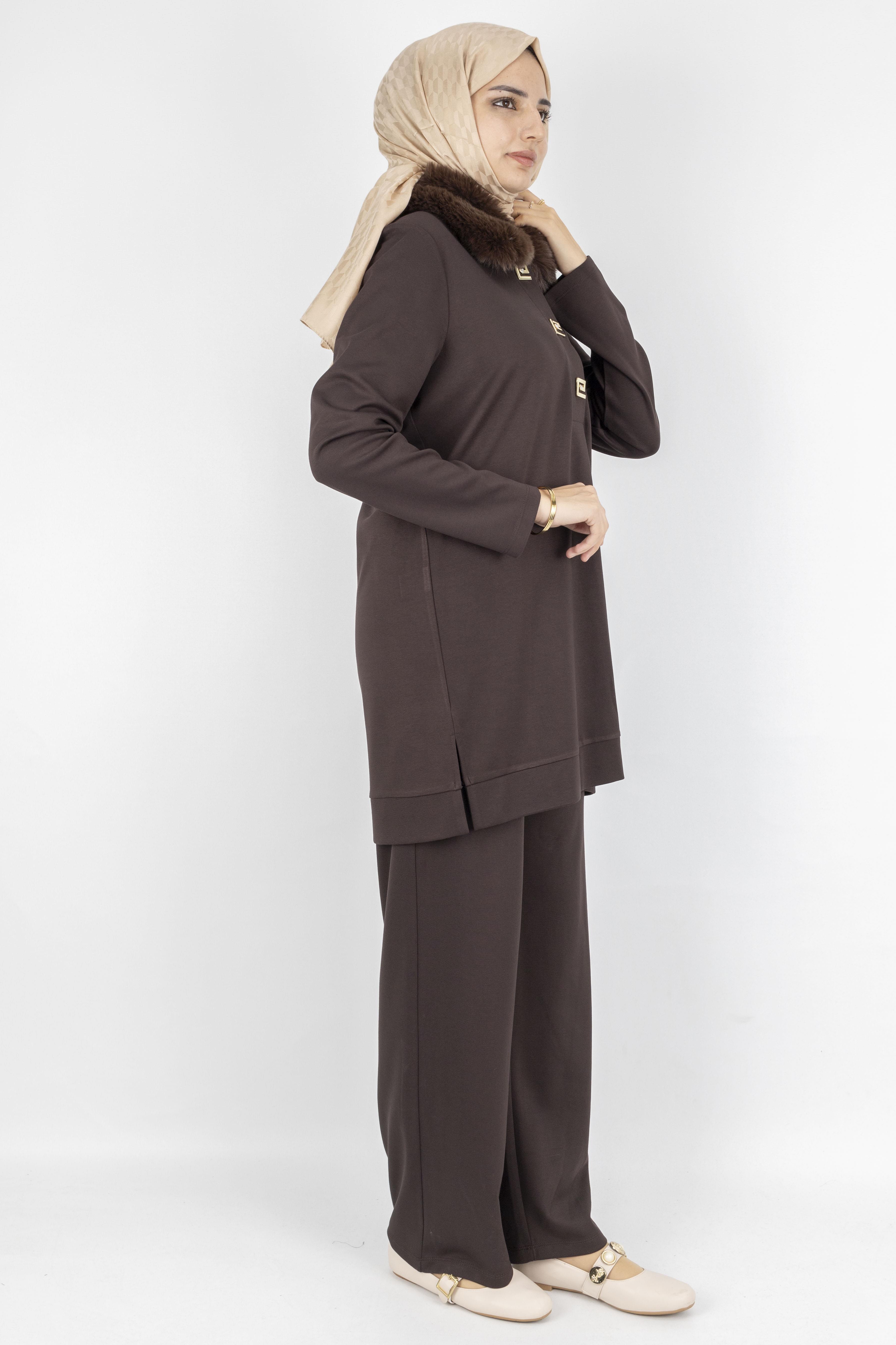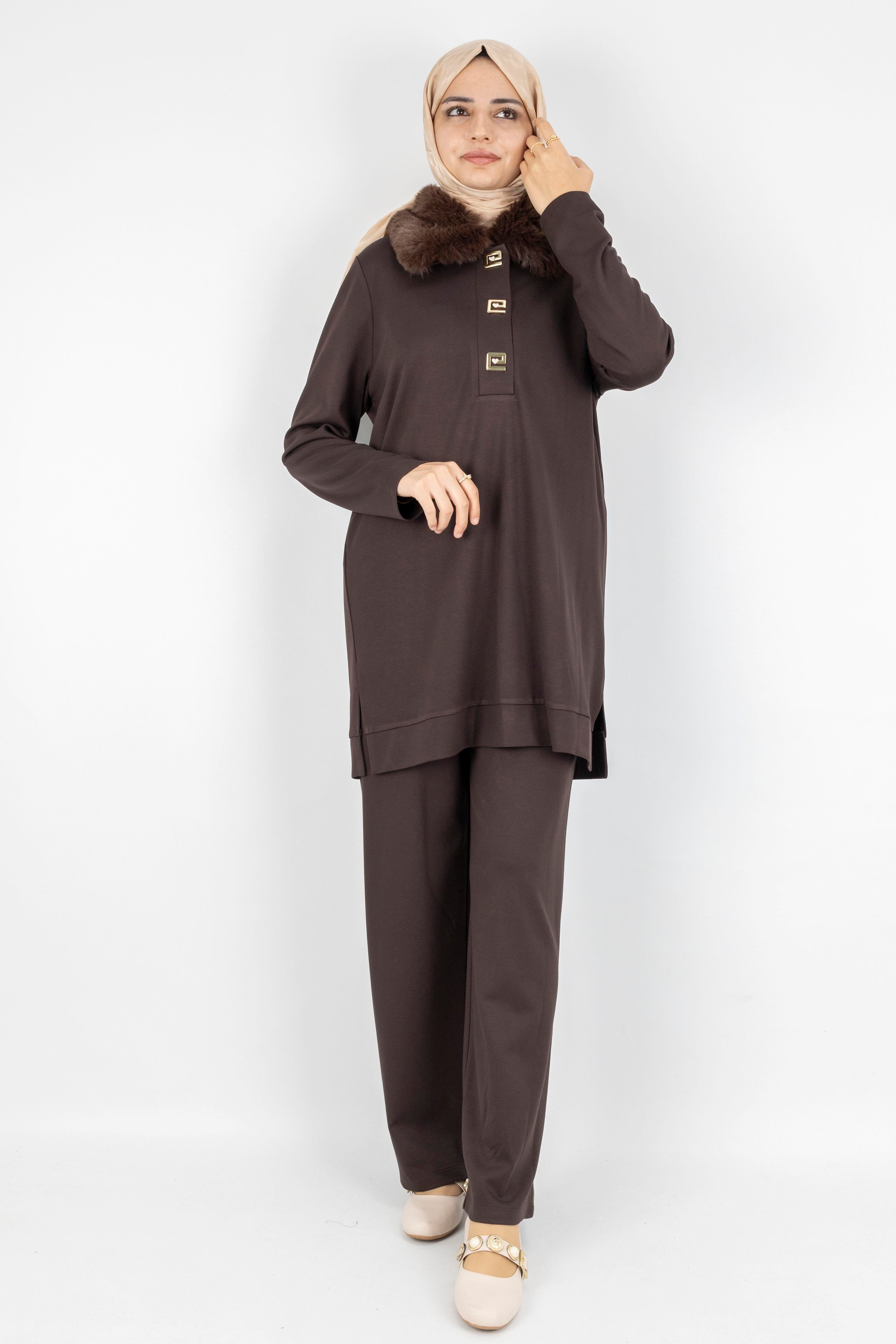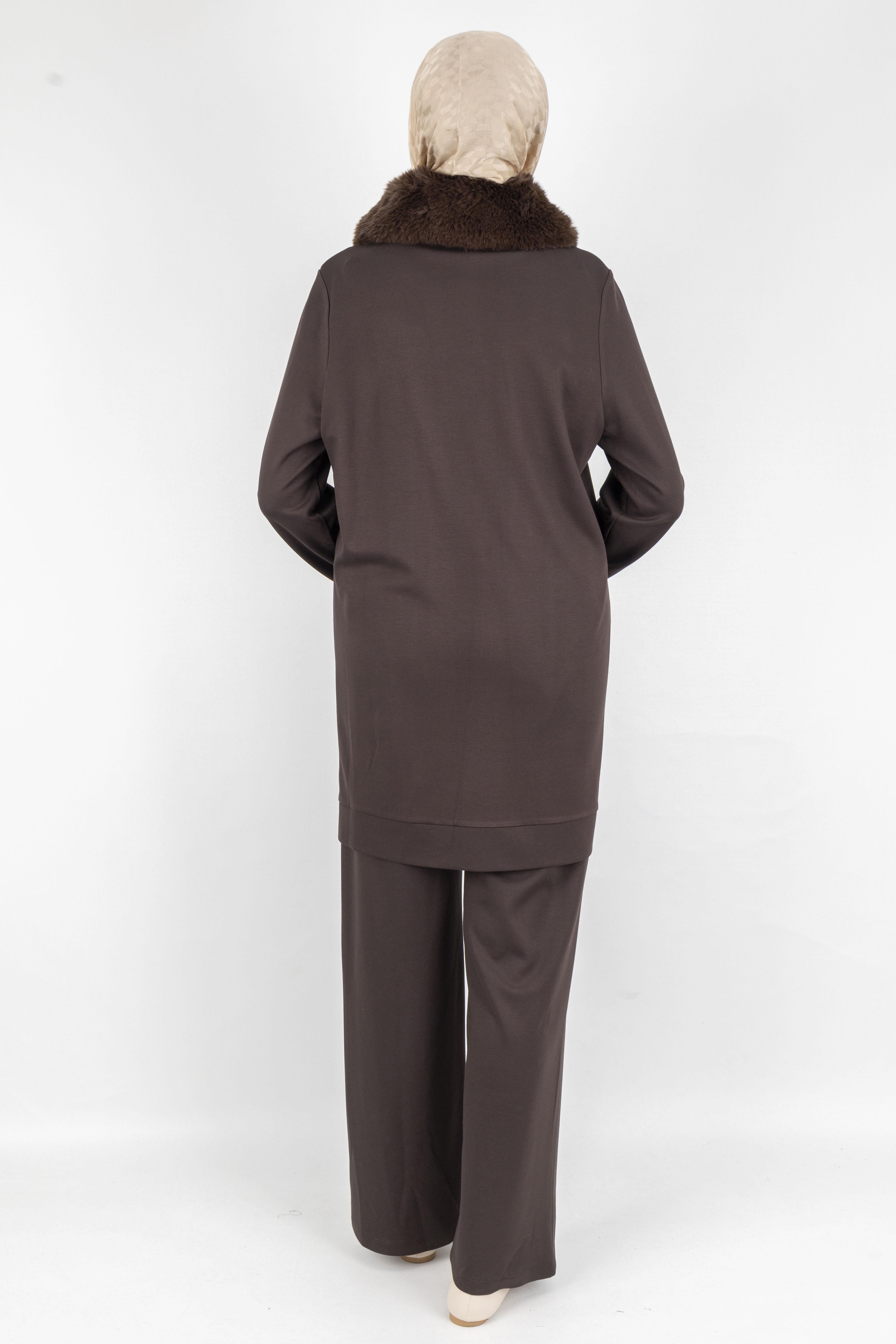 Şık Kürk Yaka ve Düğme Detaylı Tesettür İkili Takım Kahve OTW2687