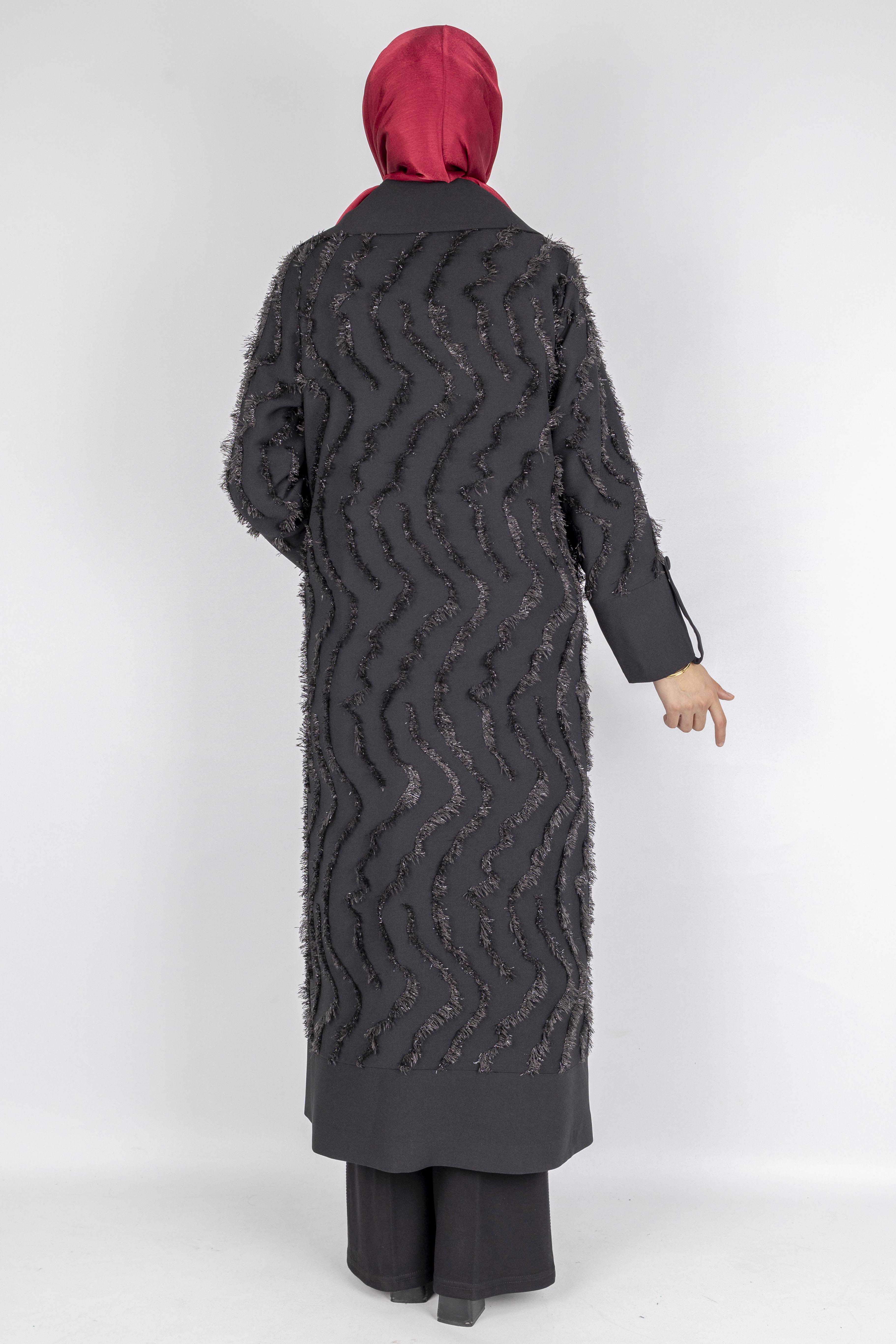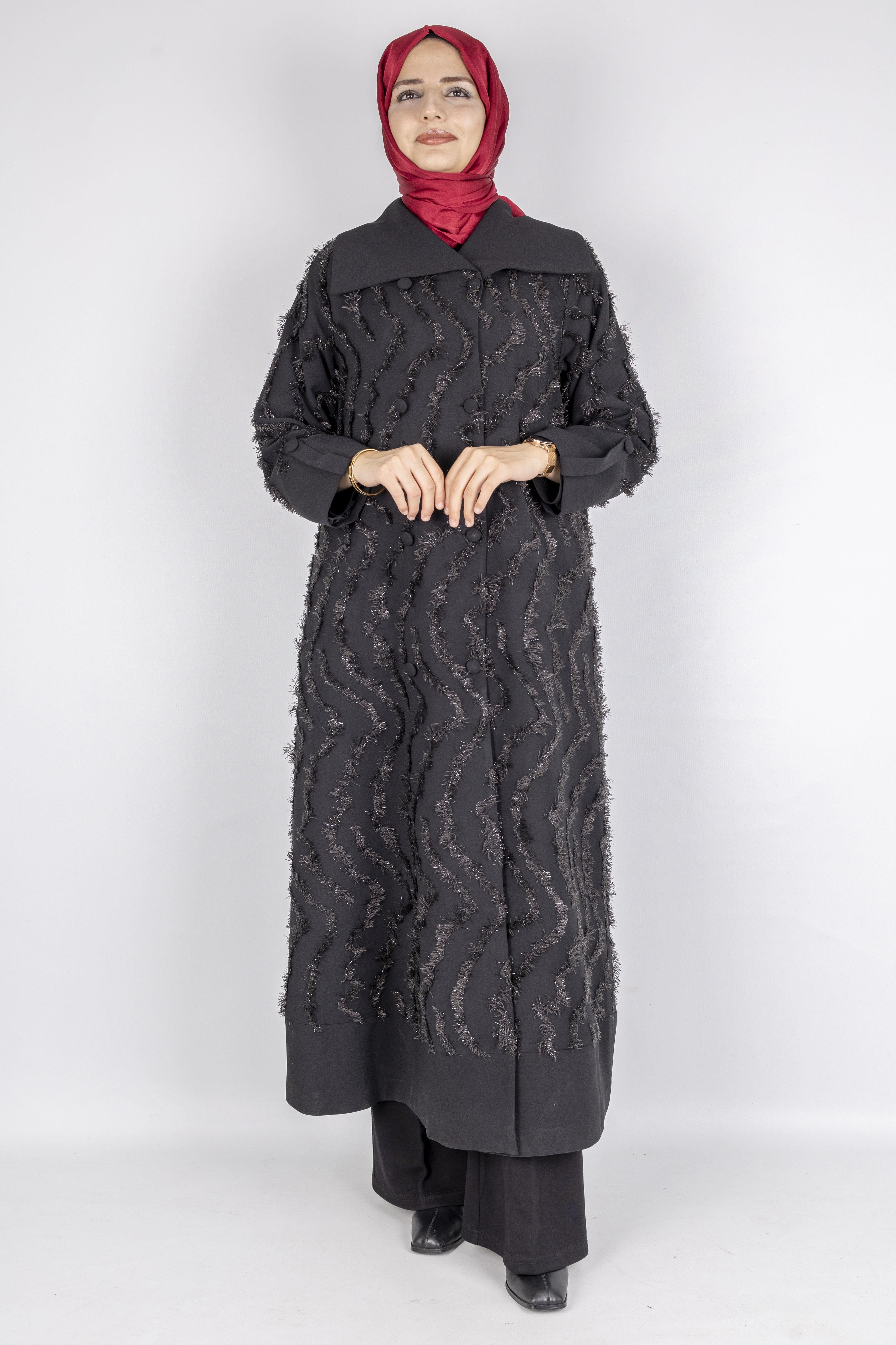 Astarlı yapısıyla konforu artıran bu şık kap modeli, püskül dokulu kumaşıyla klasik zarafete modern bir dokunuş katar. Düğme detayları ve dökümlü formu sayesinde hem özel günlerde hem günlük şıklıkta rahatlıkla tercih edilebilir. Yumuşak dokusu, kaliteli dikişi ve özenli kalıbı ile tesettür dış giyimde asil bir görünüm sunar.