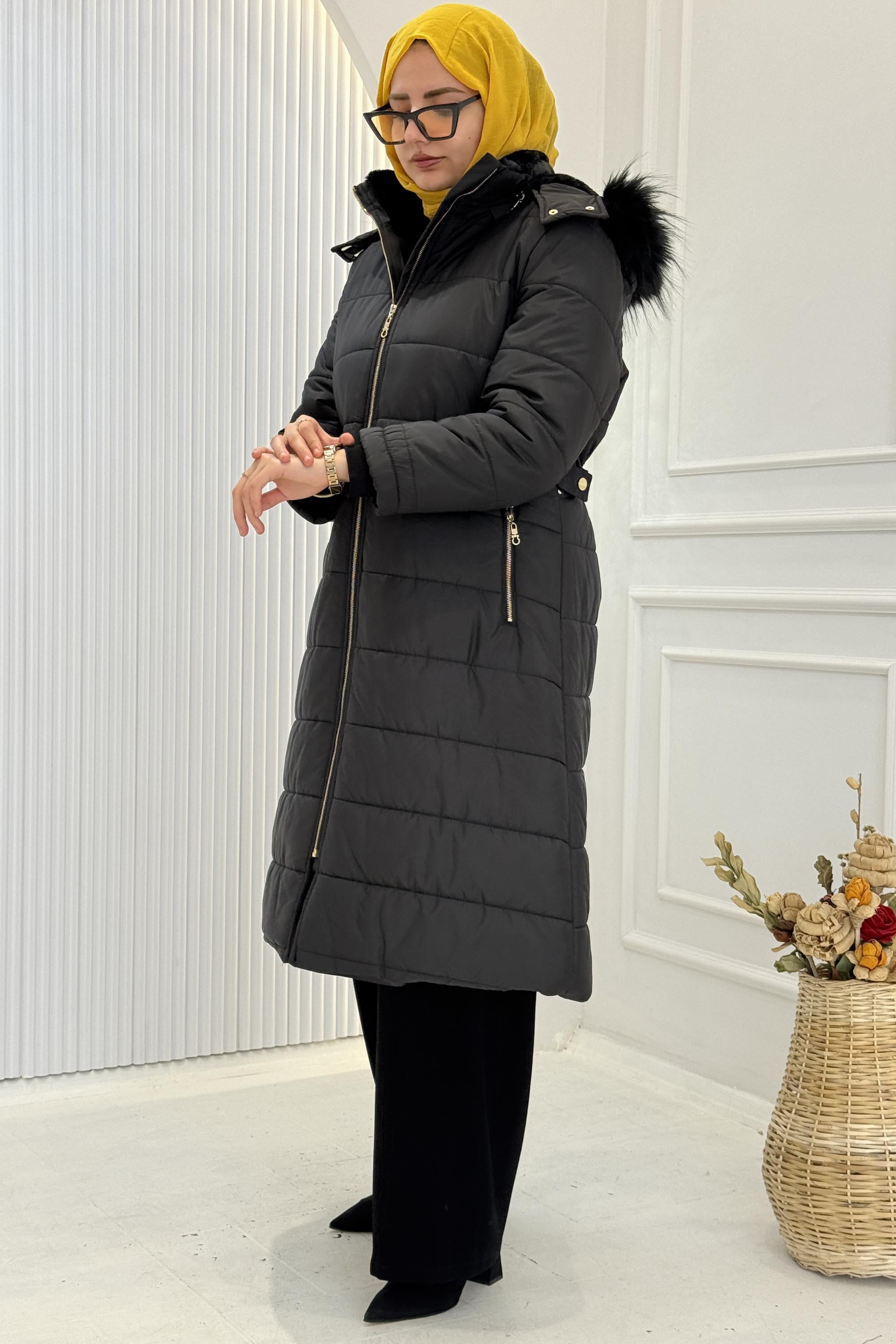 Tesettür giyime uygun formu ile elbise, tunik ve pantolon kombinleriyle rahatlıkla tercih edilebilir. Kış sezonu için kullanışlı, sade ve zamansız bir dış giyim alternatifidir.