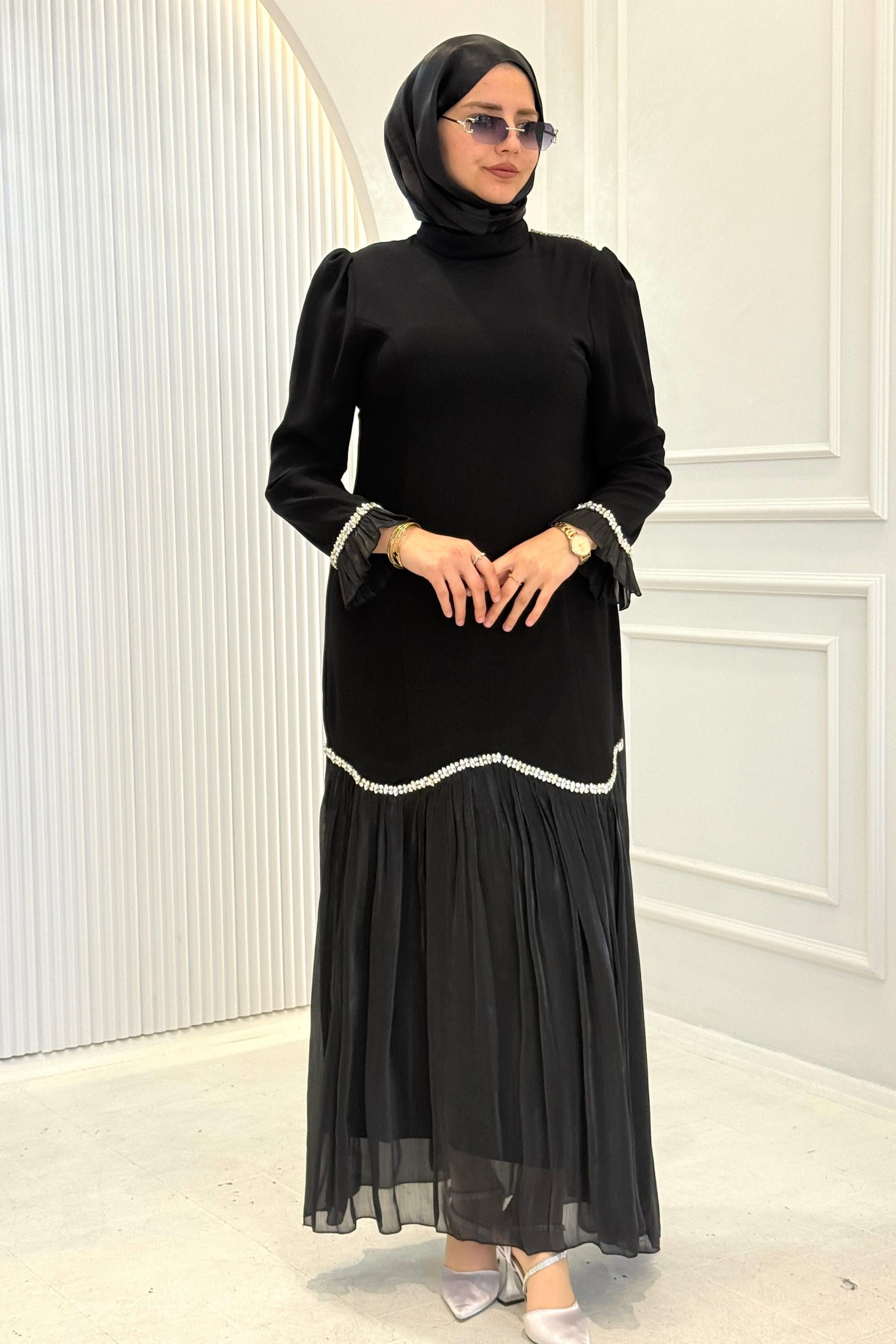 Taş Biyeli Şifon Pileli Janjan Abiye Elbise Siyah OTW4858