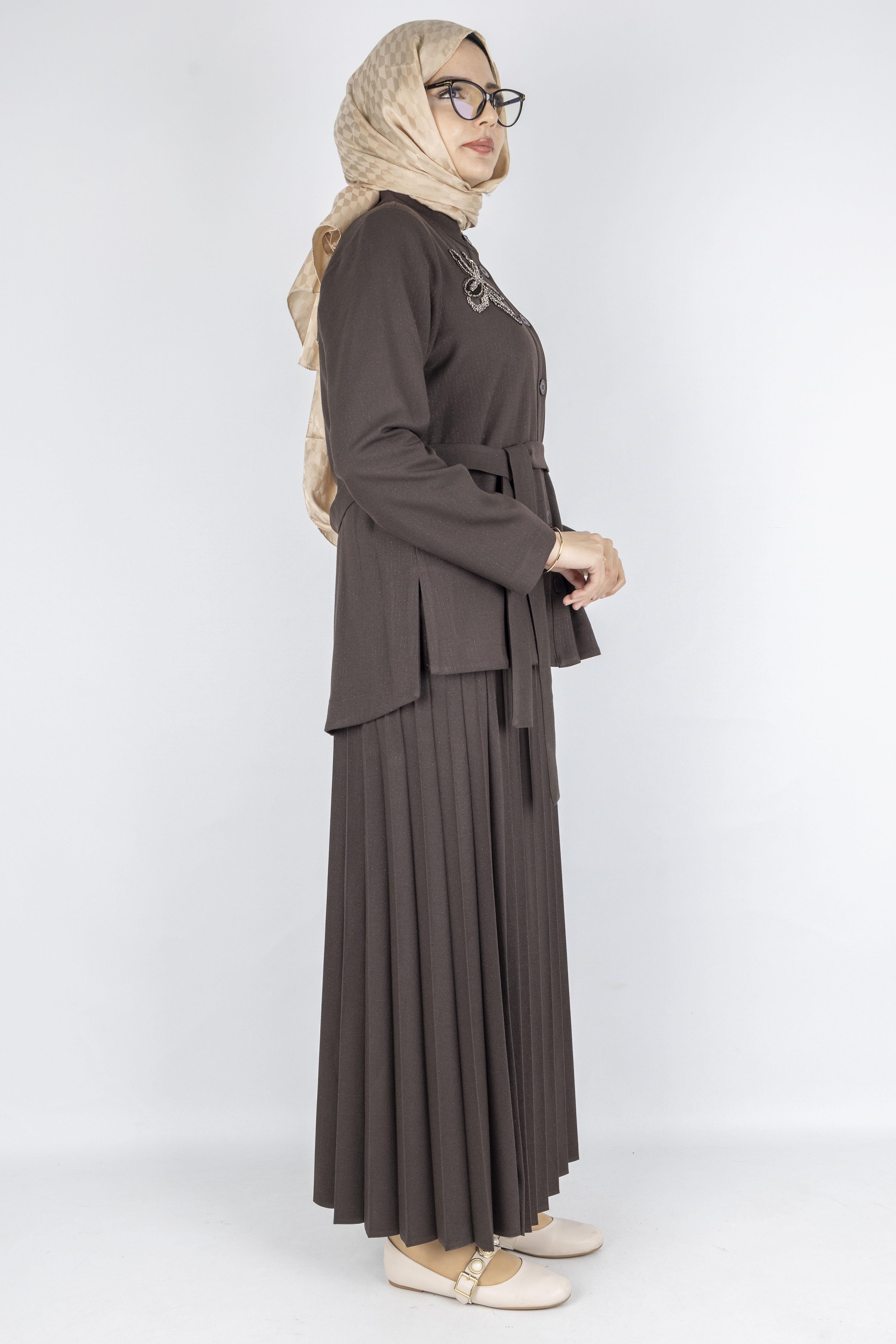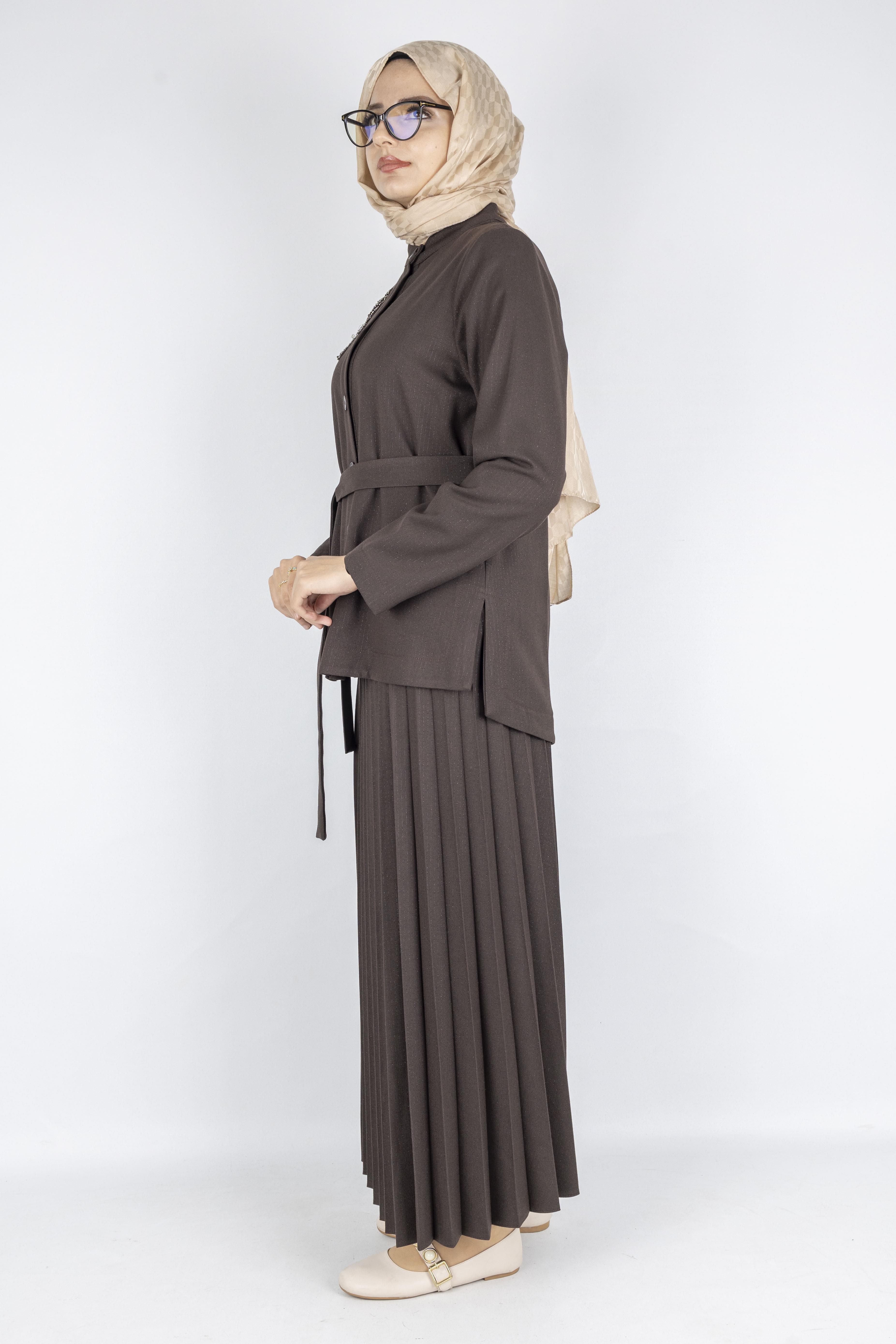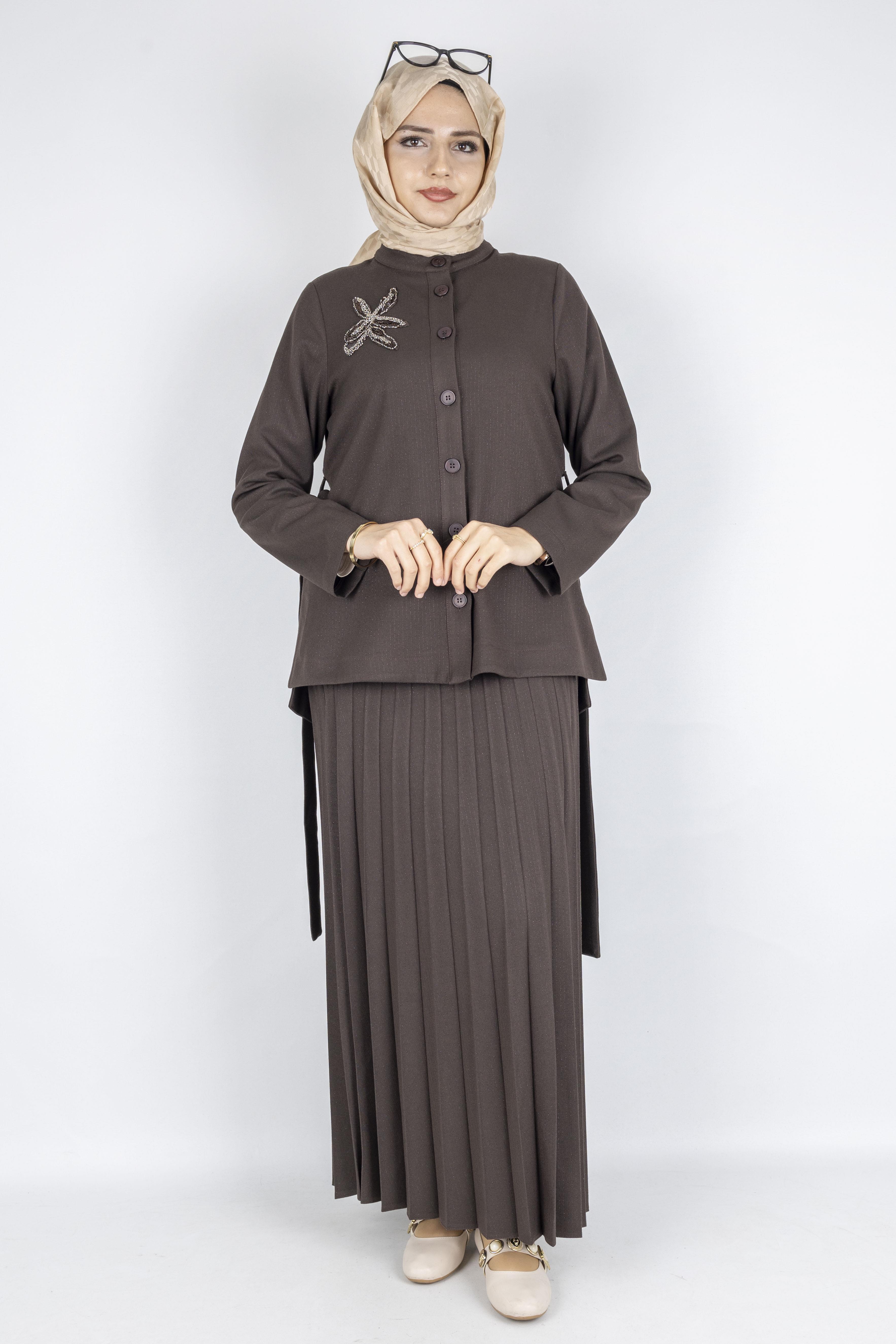 95 cm boyundaki pileli etek ise akıcı duruşu, hafif dokusu ve geniş kesimiyle hem hareket özgürlüğü hem de şık bir siluet sunar. Takım olarak satılan bu model, büyük beden uyumludur ve üç mevsim kullanım için uygundur.