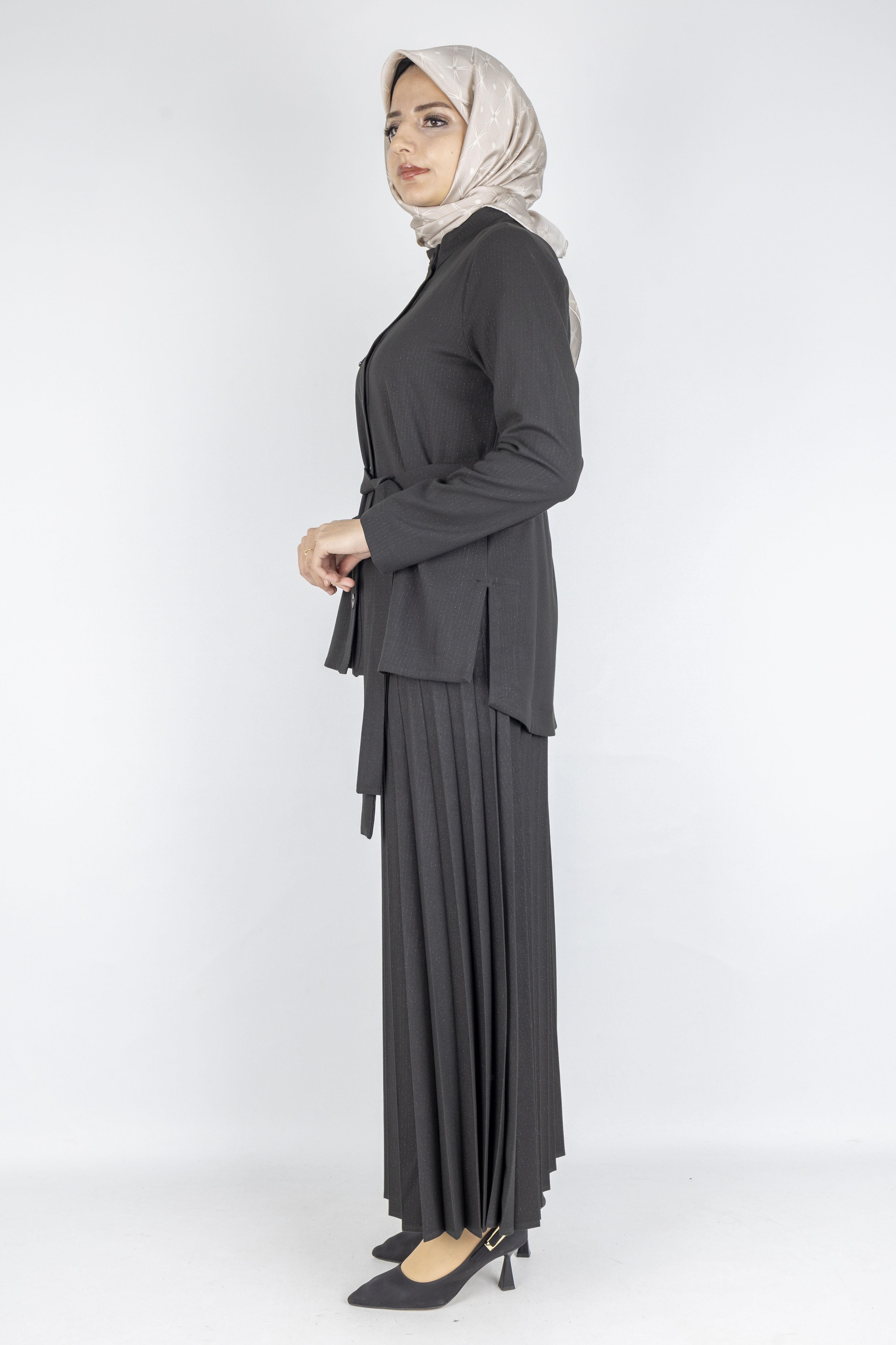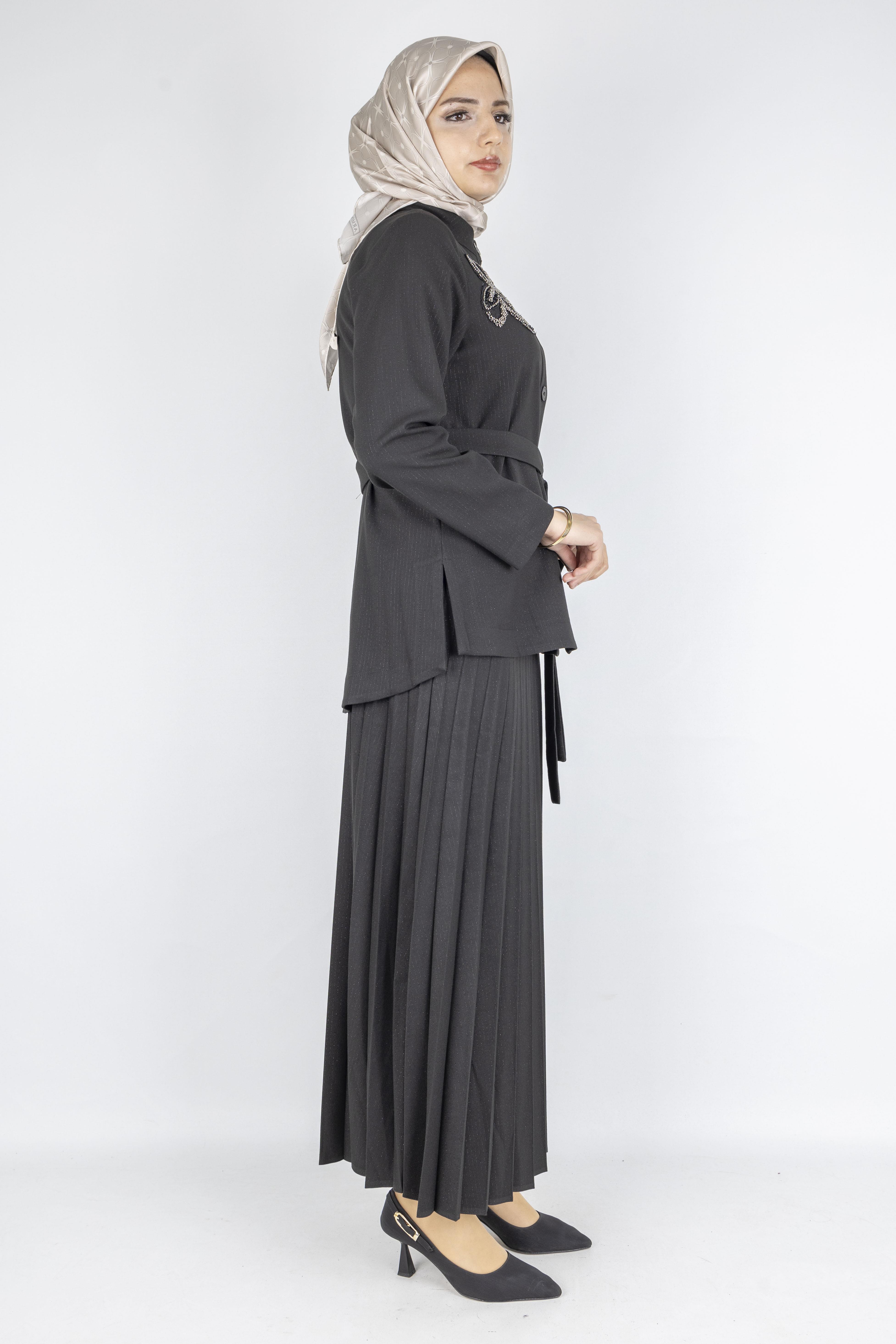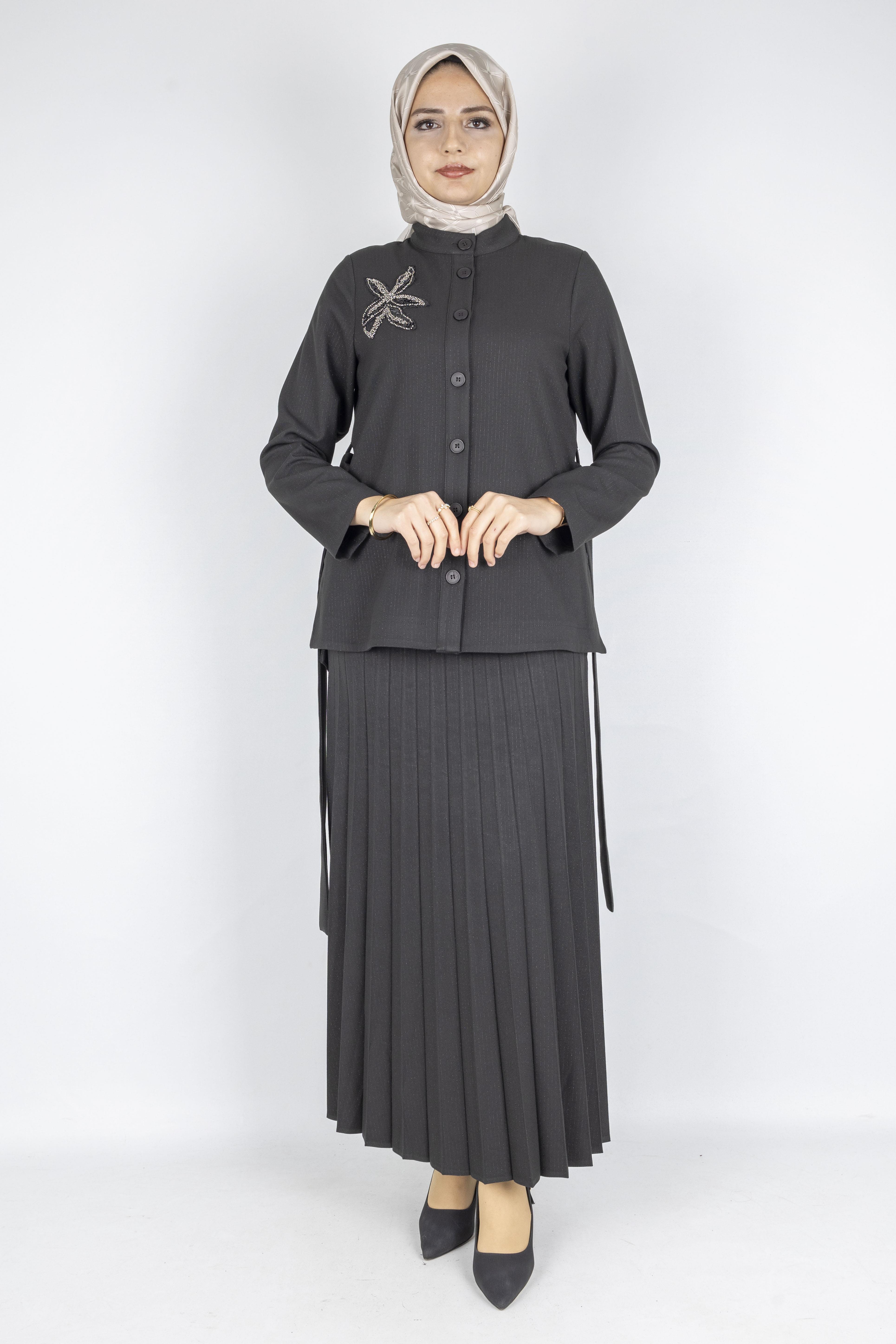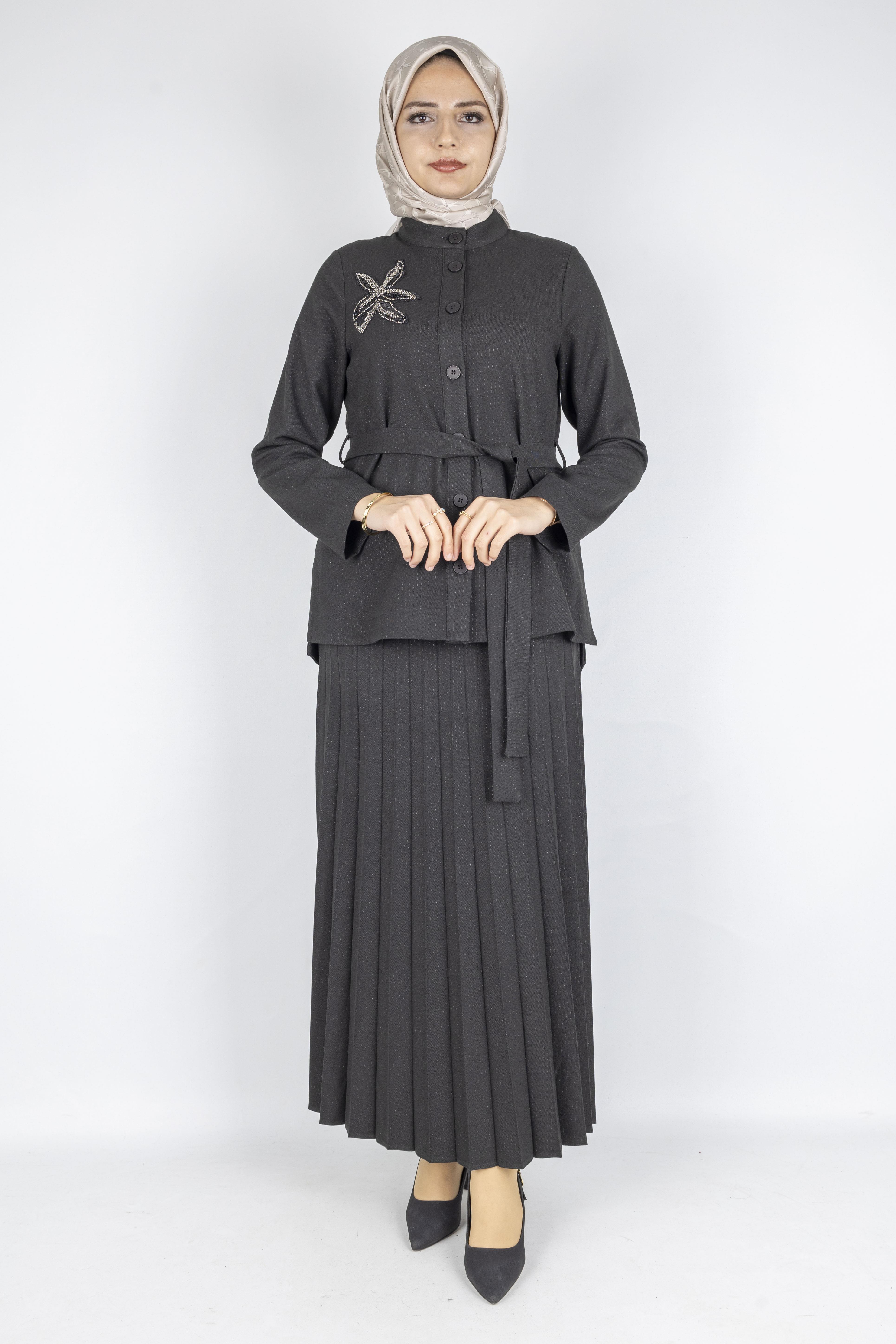 Taş Detaylı Pliseli Tesettür Takım Siyah OTW25556 Taş Detaylı Pliseli Tesettür Takım Kahve OTW25556