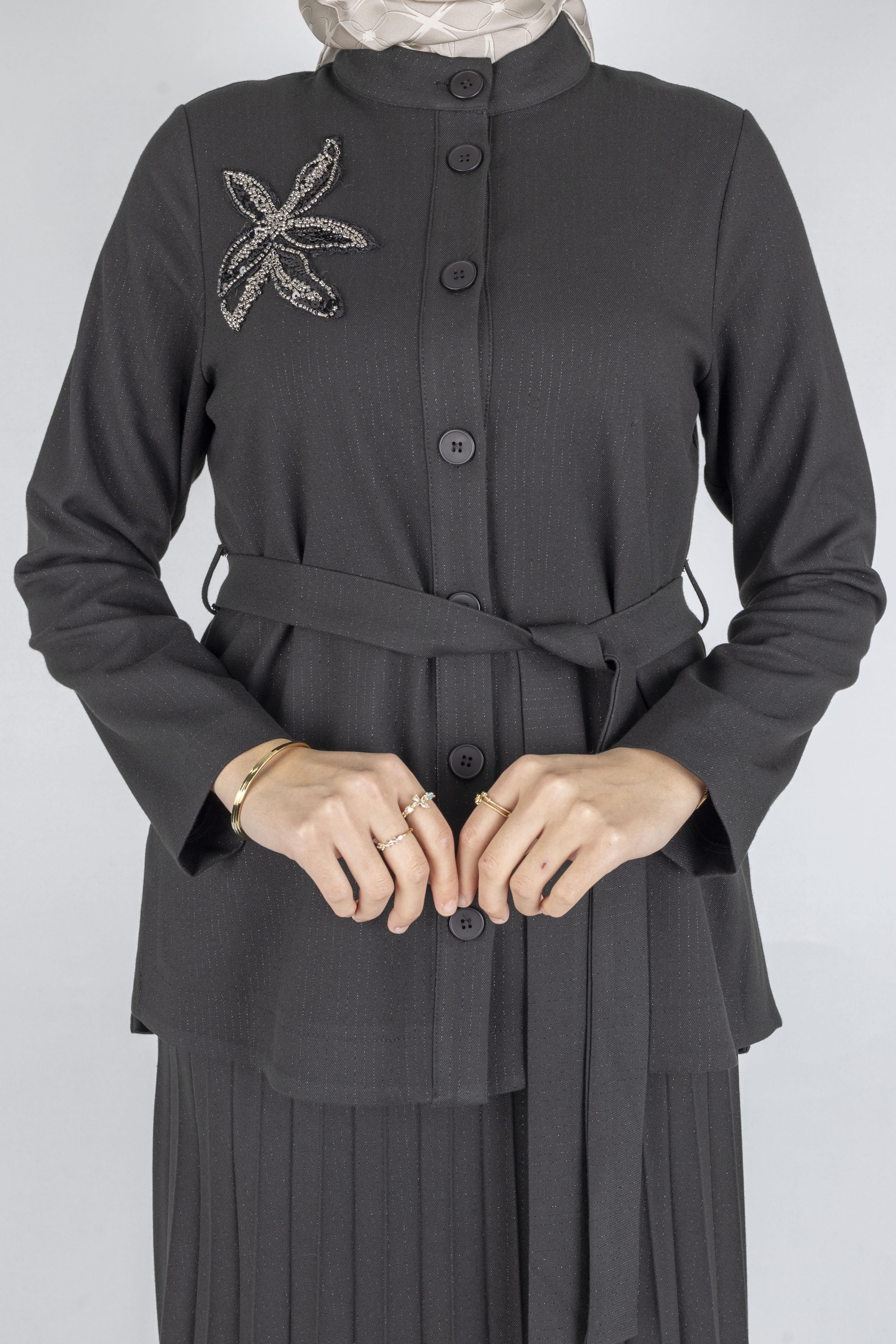 Taş Detaylı Pliseli Tesettür Takım Siyah OTW25556