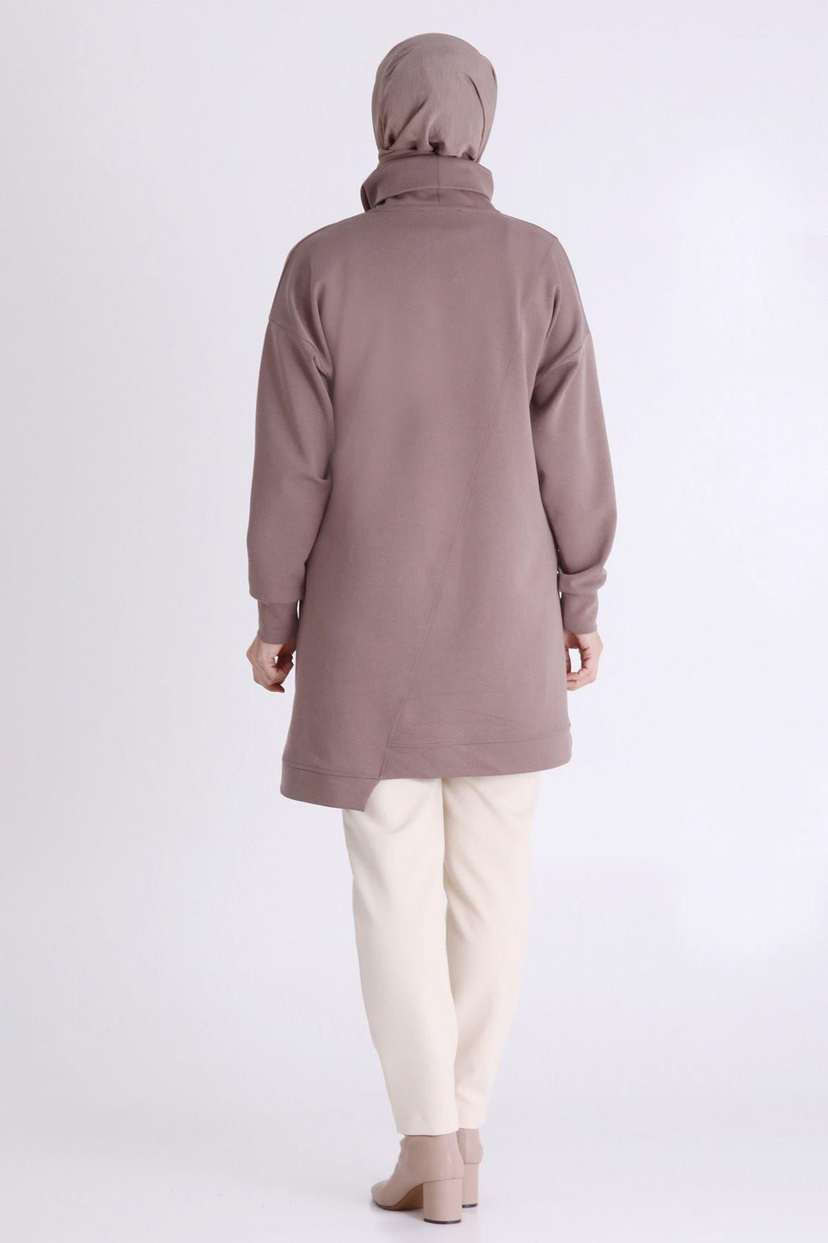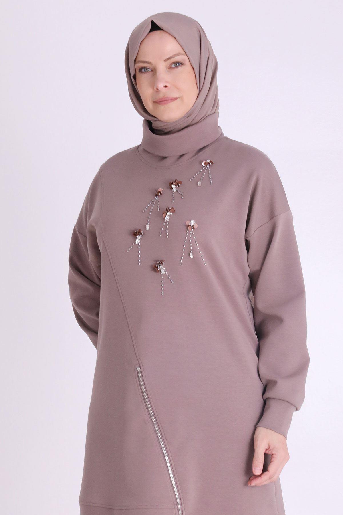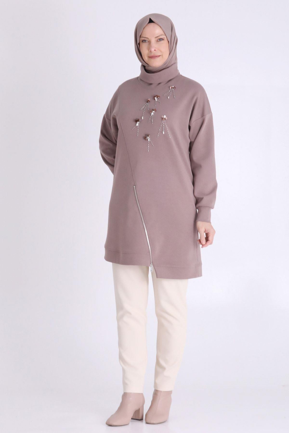Behrem Taş İşlemeli Asimetrik Fermuar Detaylı Büyük Beden Tesettür Tunik Kestane OTW20127