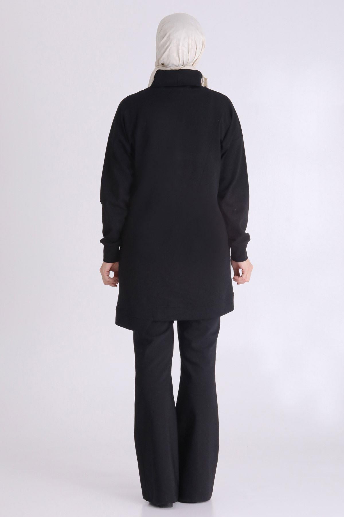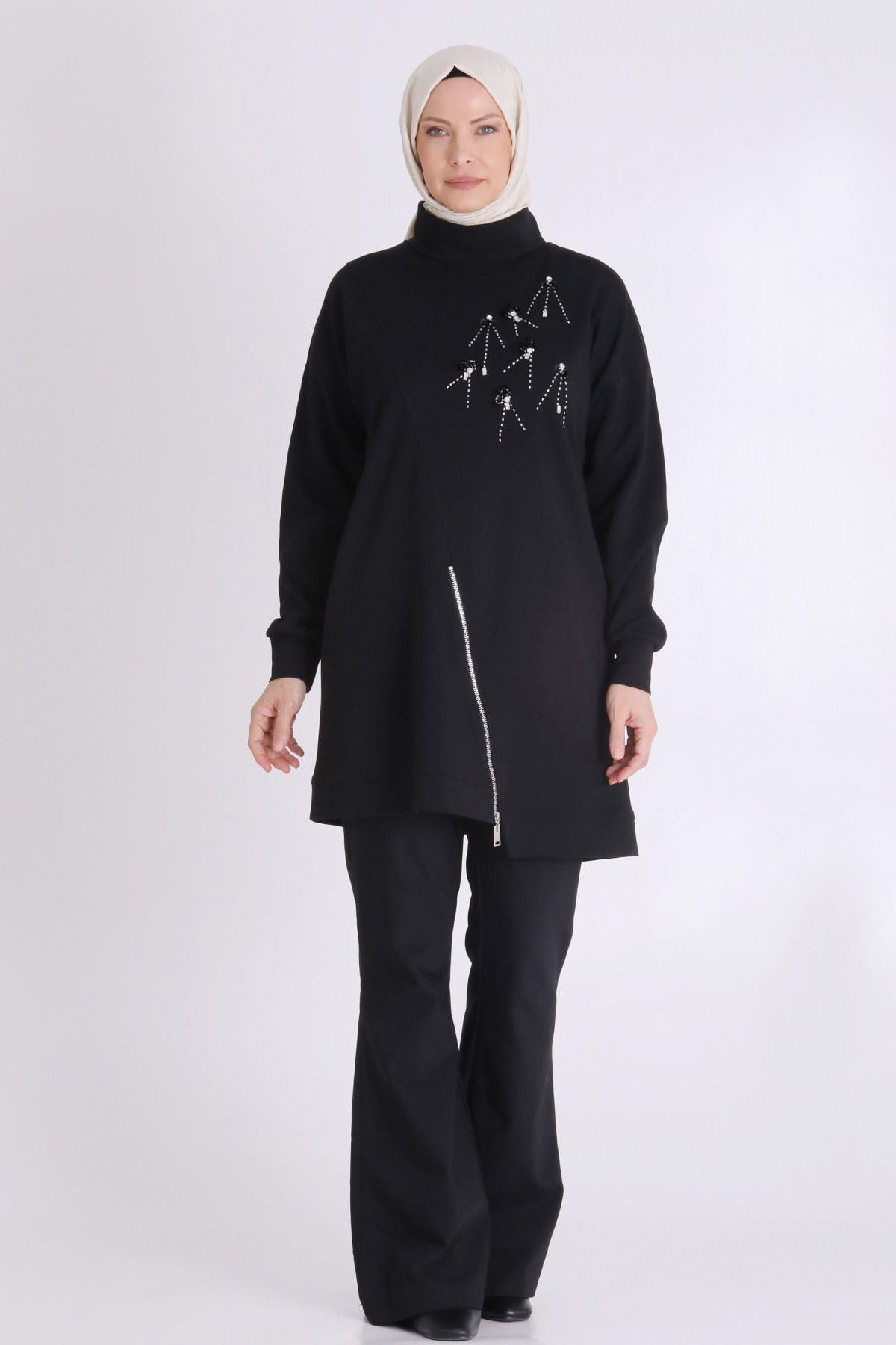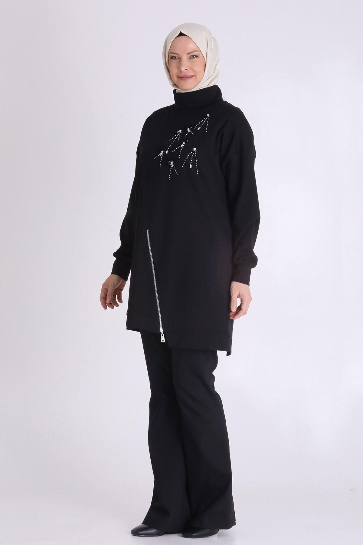 Büyük Beden Tesettür Tunik Ürün Detayları: Dik yaka, düşük kol modelimiz fermuar aksesuarlı ve işleme detaylıdır. Kumaş Türü: Pamuk Örme Kumaş İçeriği: %80 Pamuk - %20 Polyester