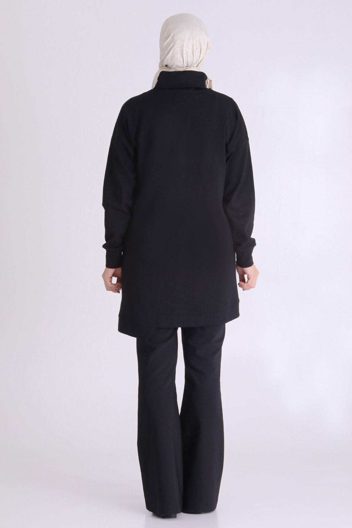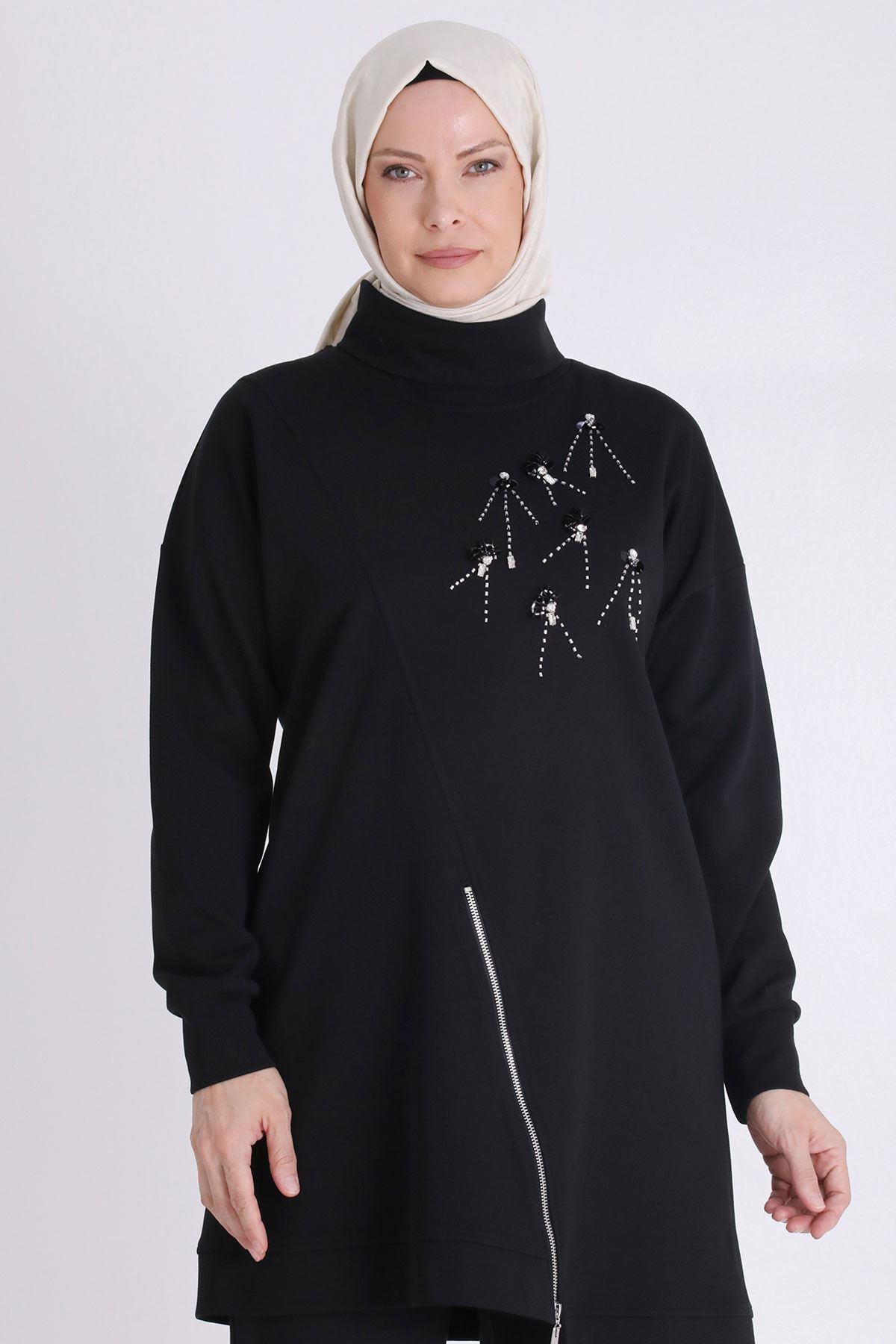 Taş İşlemeli Asimetrik Fermuar Detaylı Büyük Beden Tesettür Tunik Siyah OTW20127