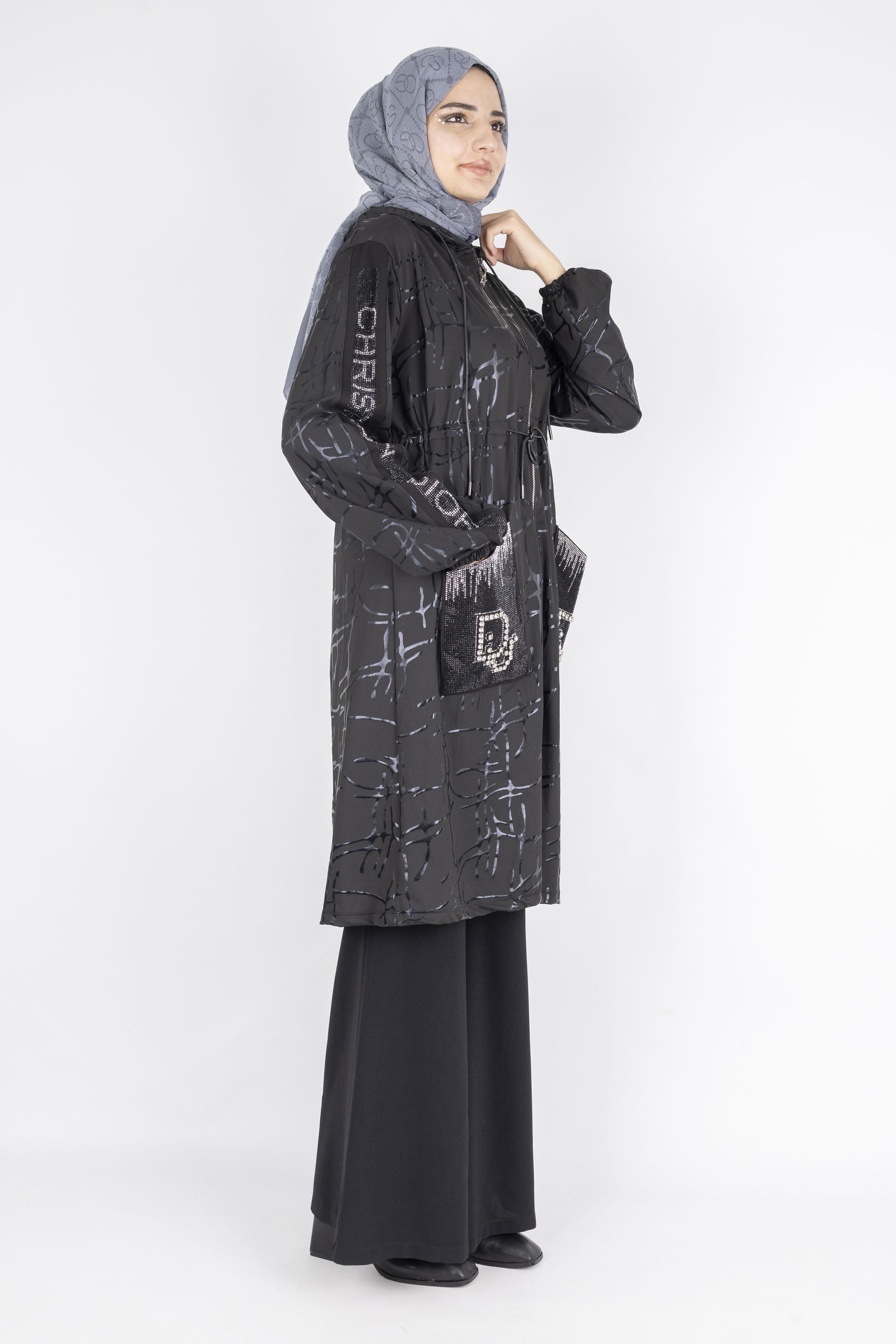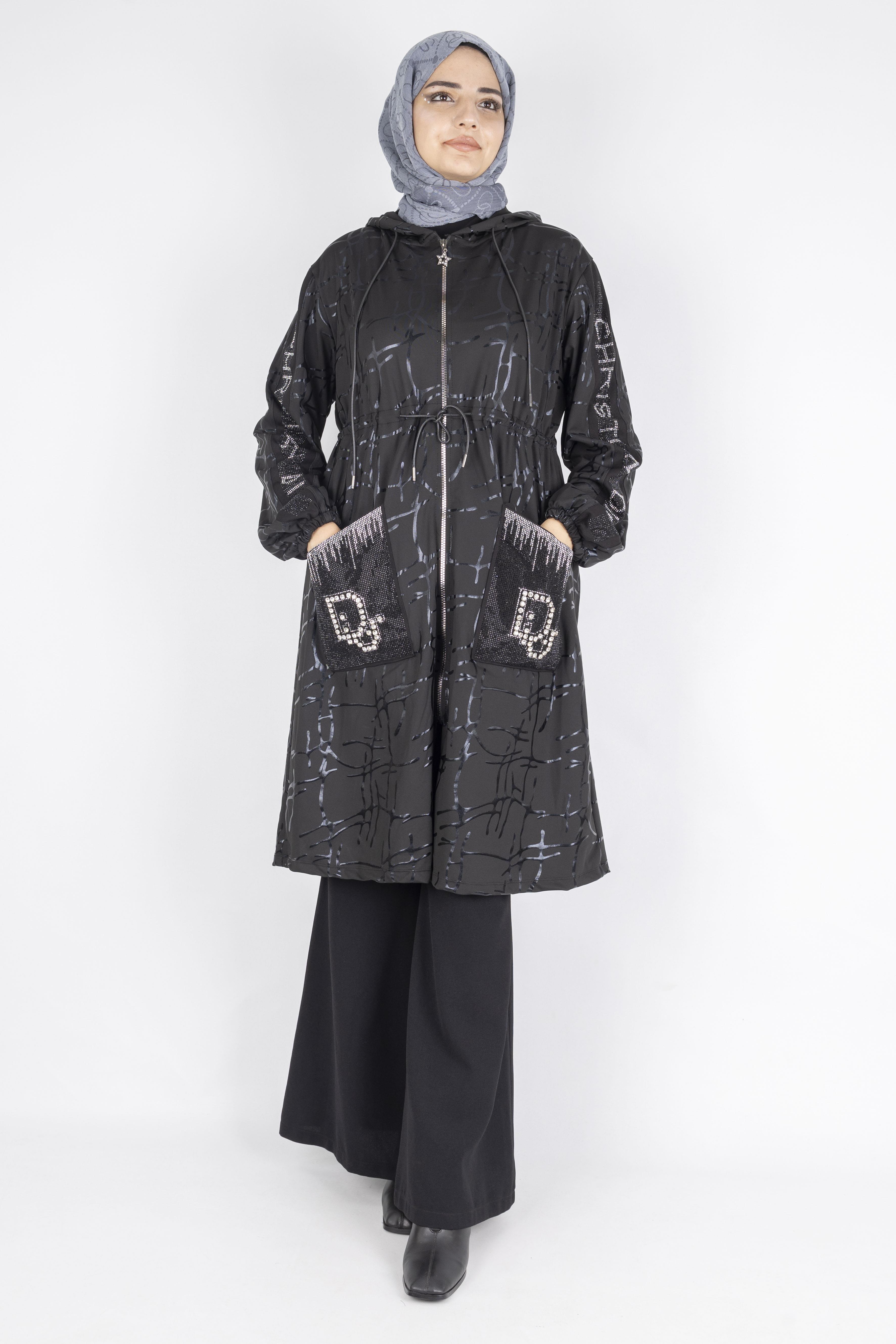 Taş İşlemeli Cepli Fermuarlı Tesettür Kap Siyah OTW1005