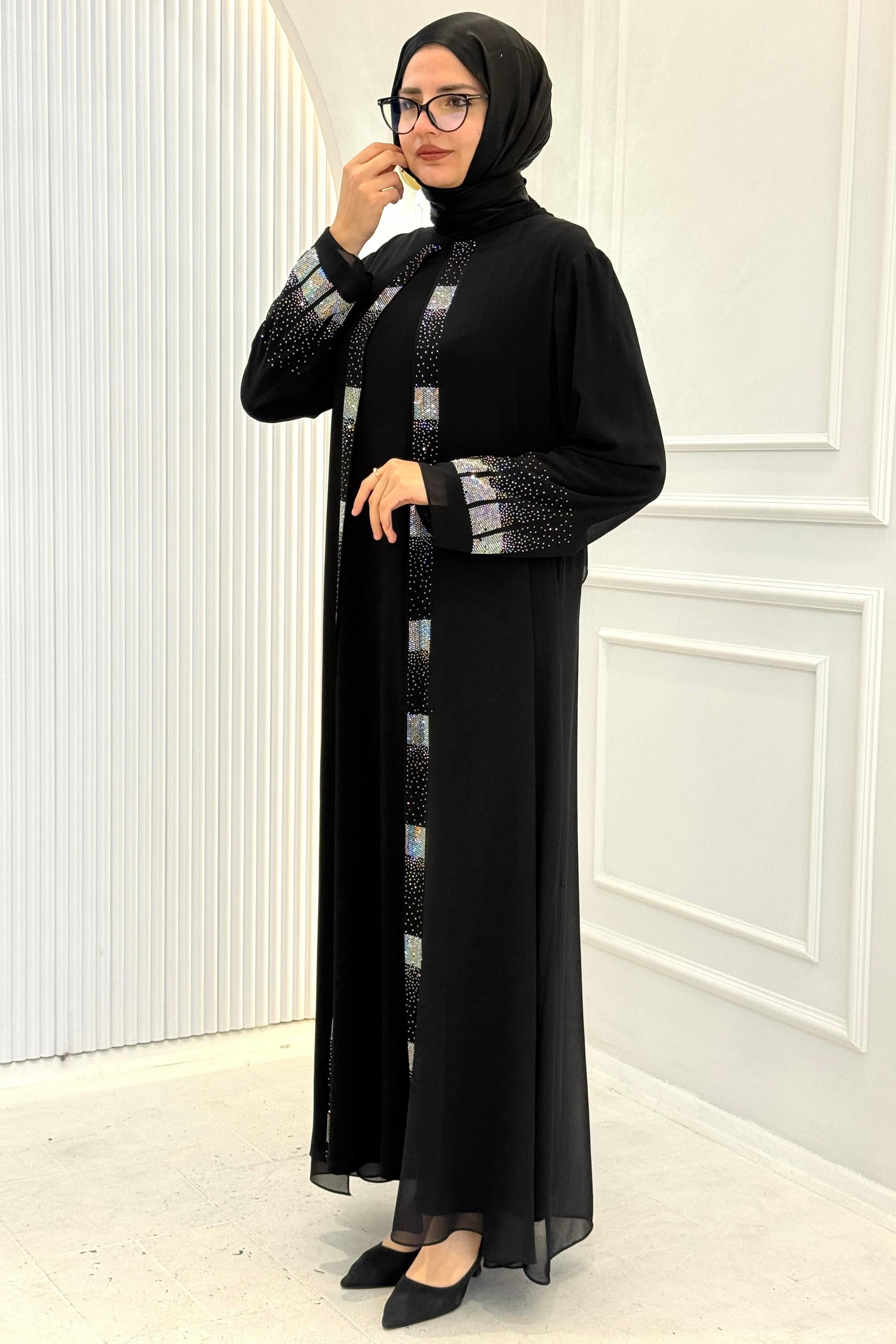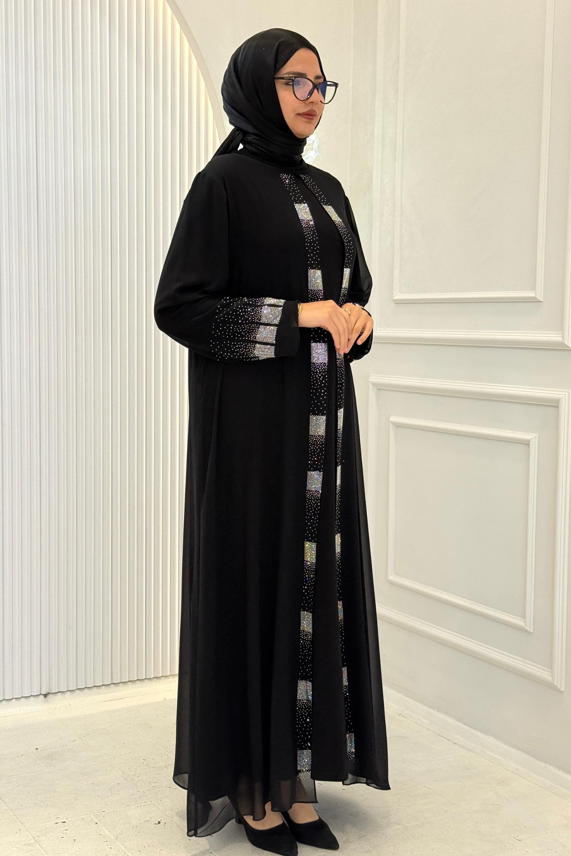Zarif ve güçlü bir duruş arayanlar için tasarlanan bu abiye elbise, ön kısmındaki dikey taş detaylarıyla boyu daha uzun ve silüeti daha ince gösterir.