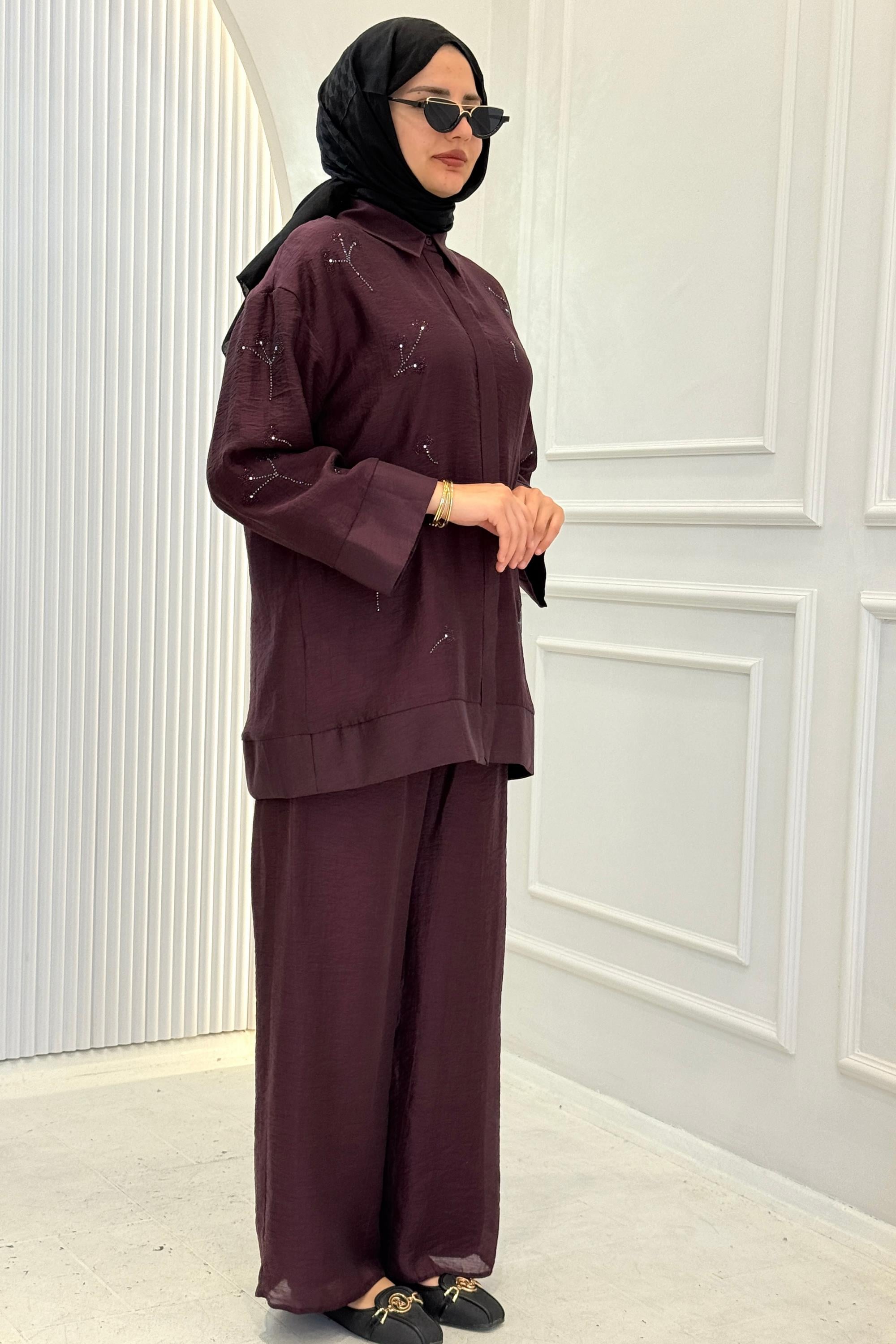 Taş İşlemeli Tesettür Takım Siyah OTW8640 Taş İşlemeli Tesettür Takım Bordo OTW8640