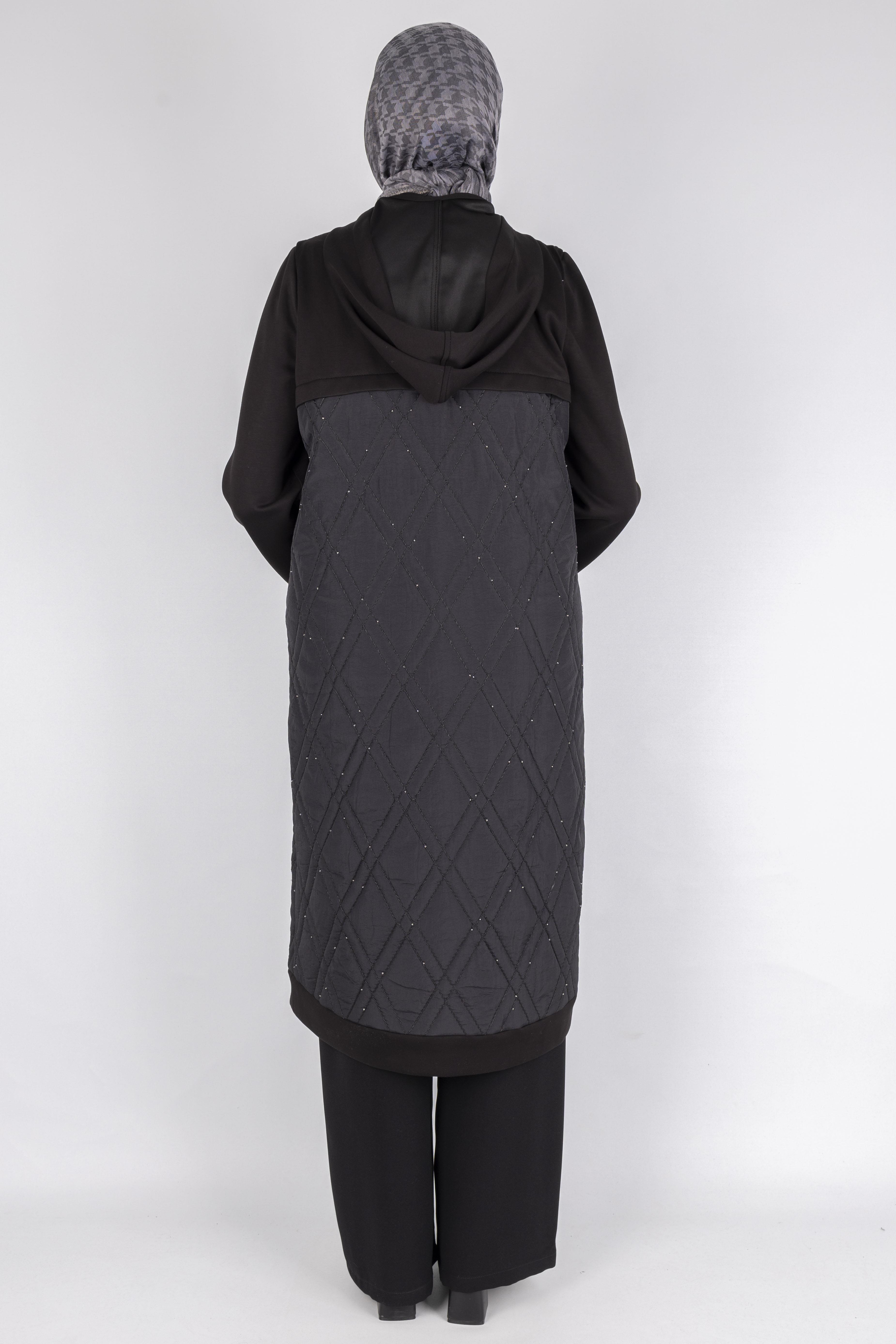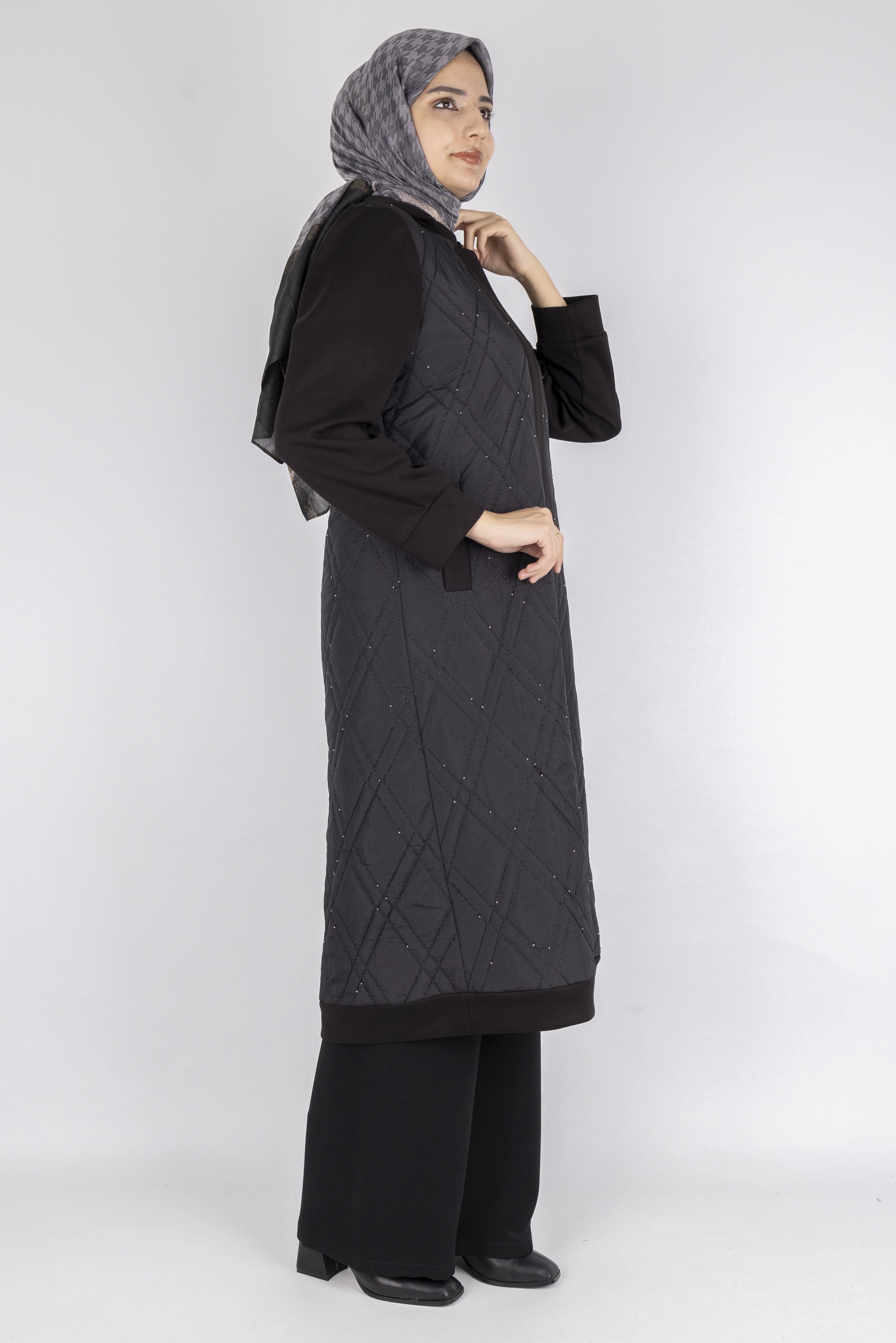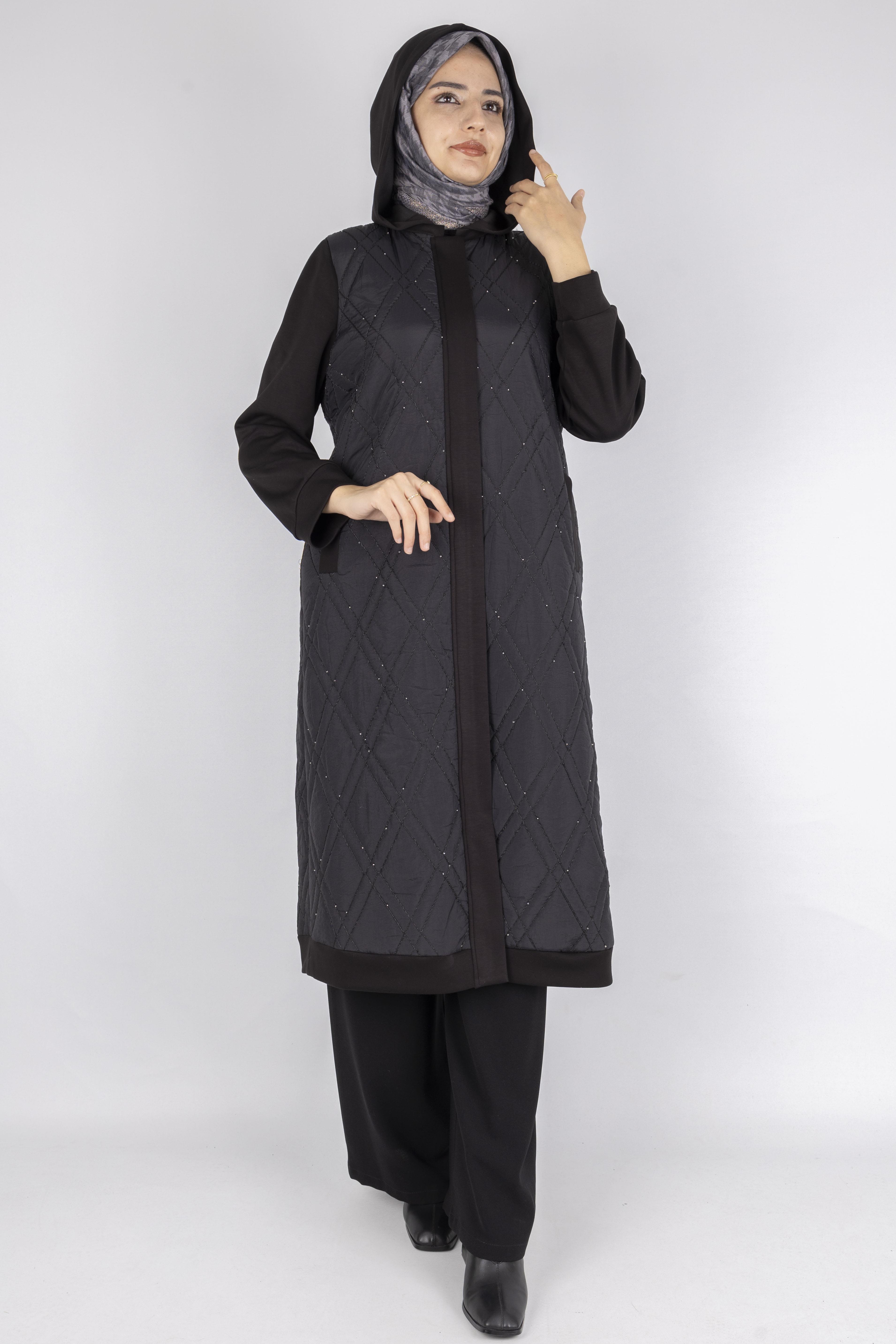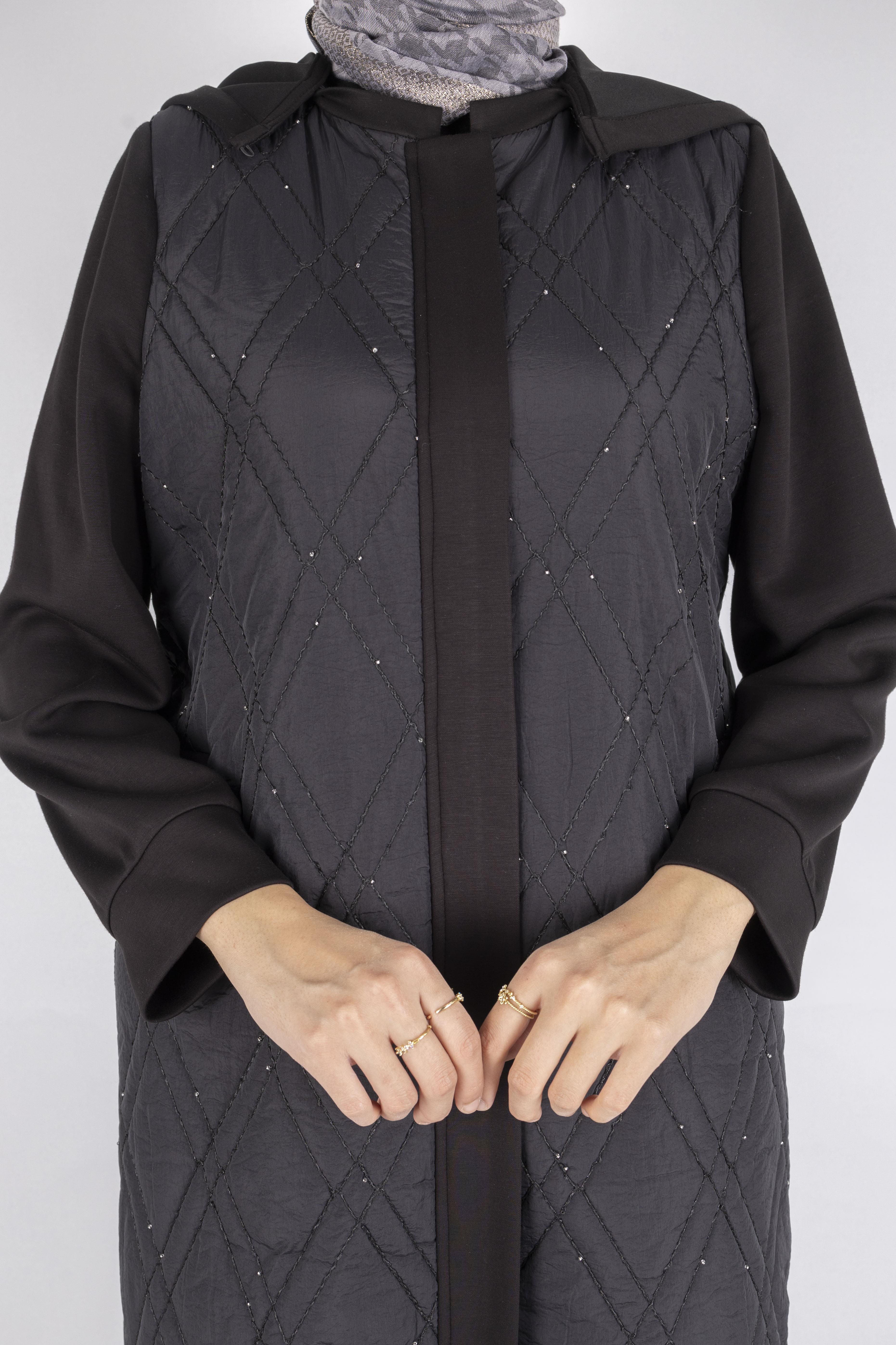 42-52 Beden Siyah Kapitone Tesettür Kap – Fermuarlı ve Şık Tasarım