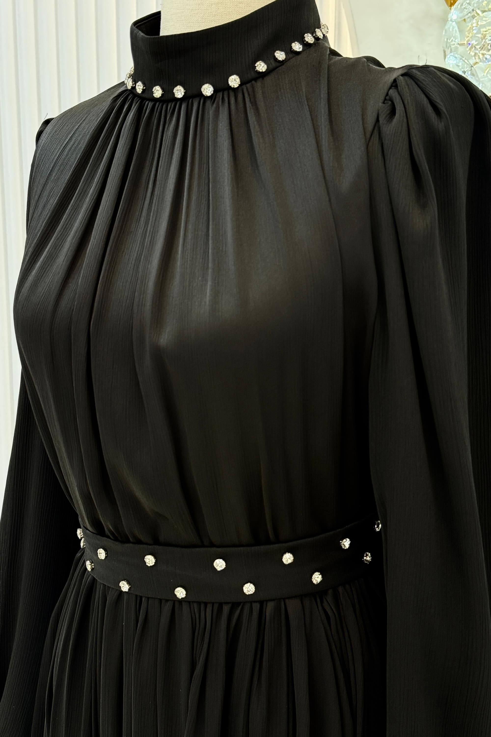Taş Yakalı Kemer Detaylı Piliseli Tesettür Abiye Elbise Siyah OTW4591