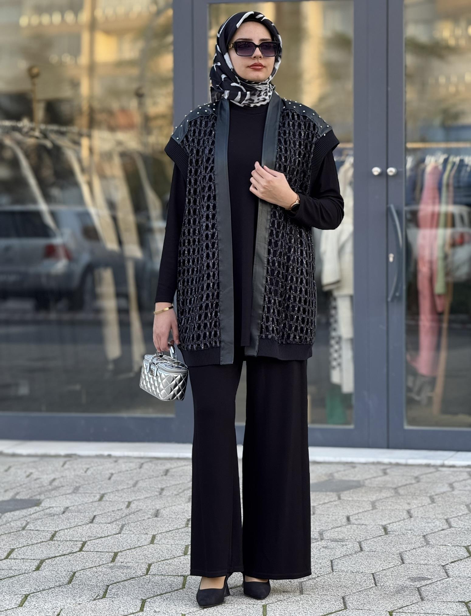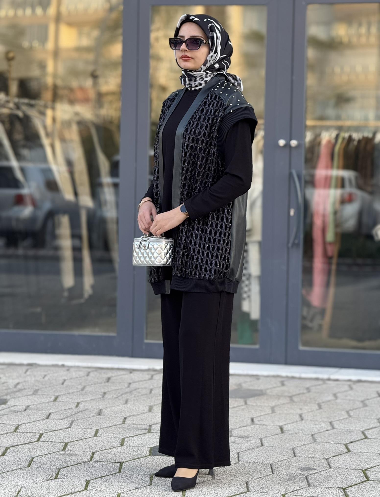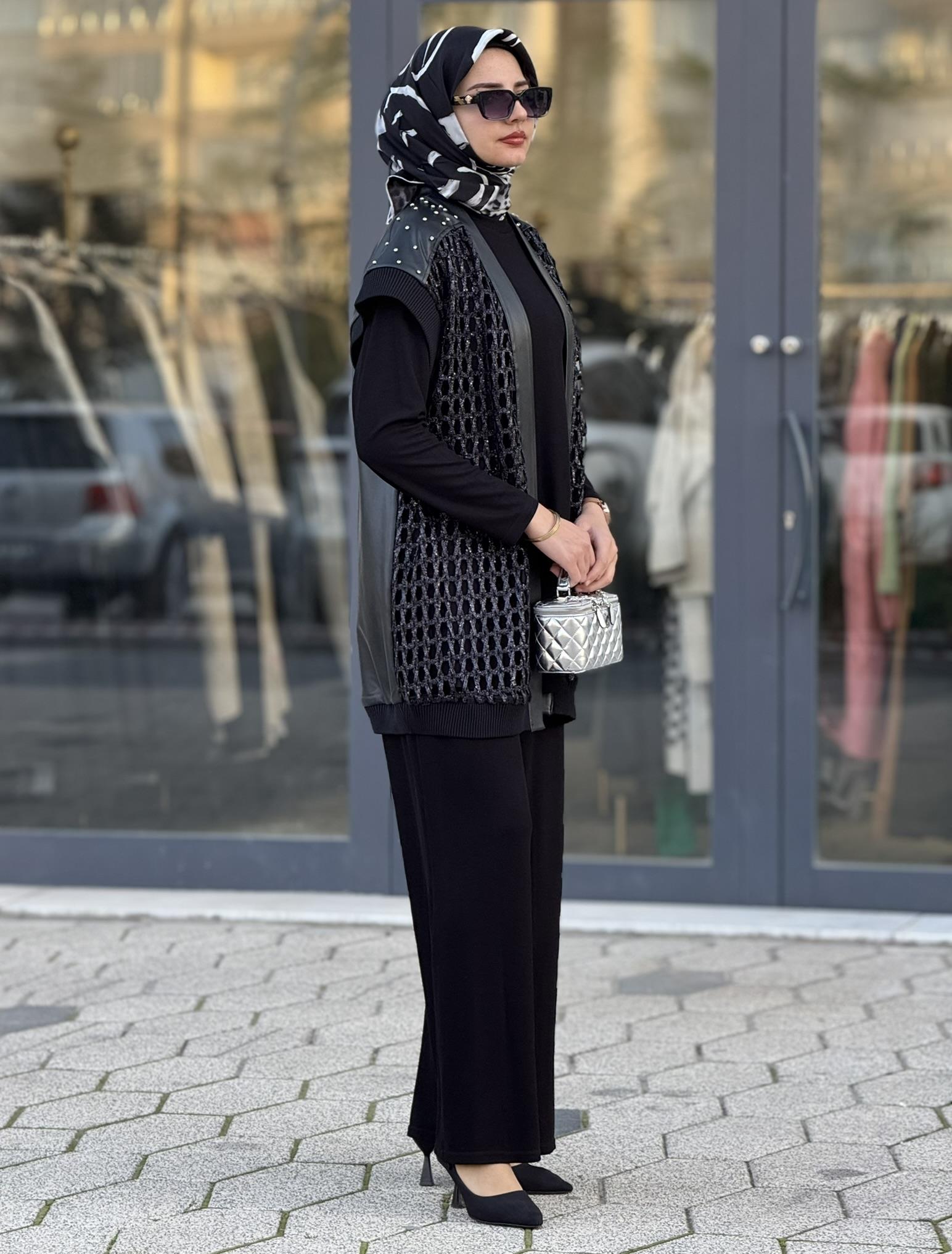 Şıklığı ve konforu bir arada sunan bu üçlü takım, örme triko kumaşın yumuşak dokusunu modern file yelek ve deri detaylarla tamamlıyor. Omuz kısmındaki taş süslemeleri tasarıma zarif bir ışıltı katarken, rahat kesimi sayesinde gün boyu konfor sağlar. Hem günlük kullanıma hem de özel kombinlere kolayca uyum sağlayan bu takım, tesettür stiline modern ve iddialı bir dokunuş ekler.