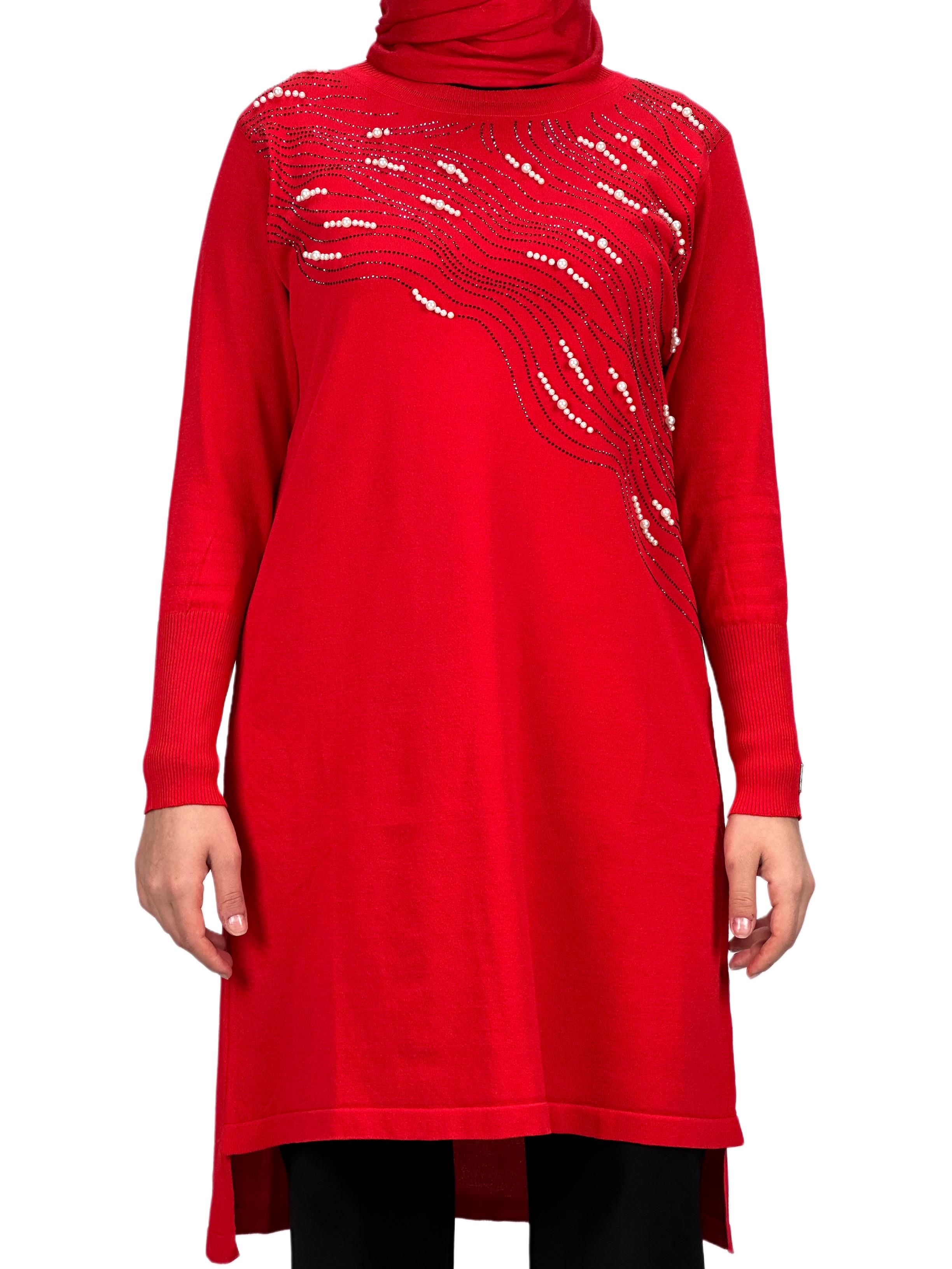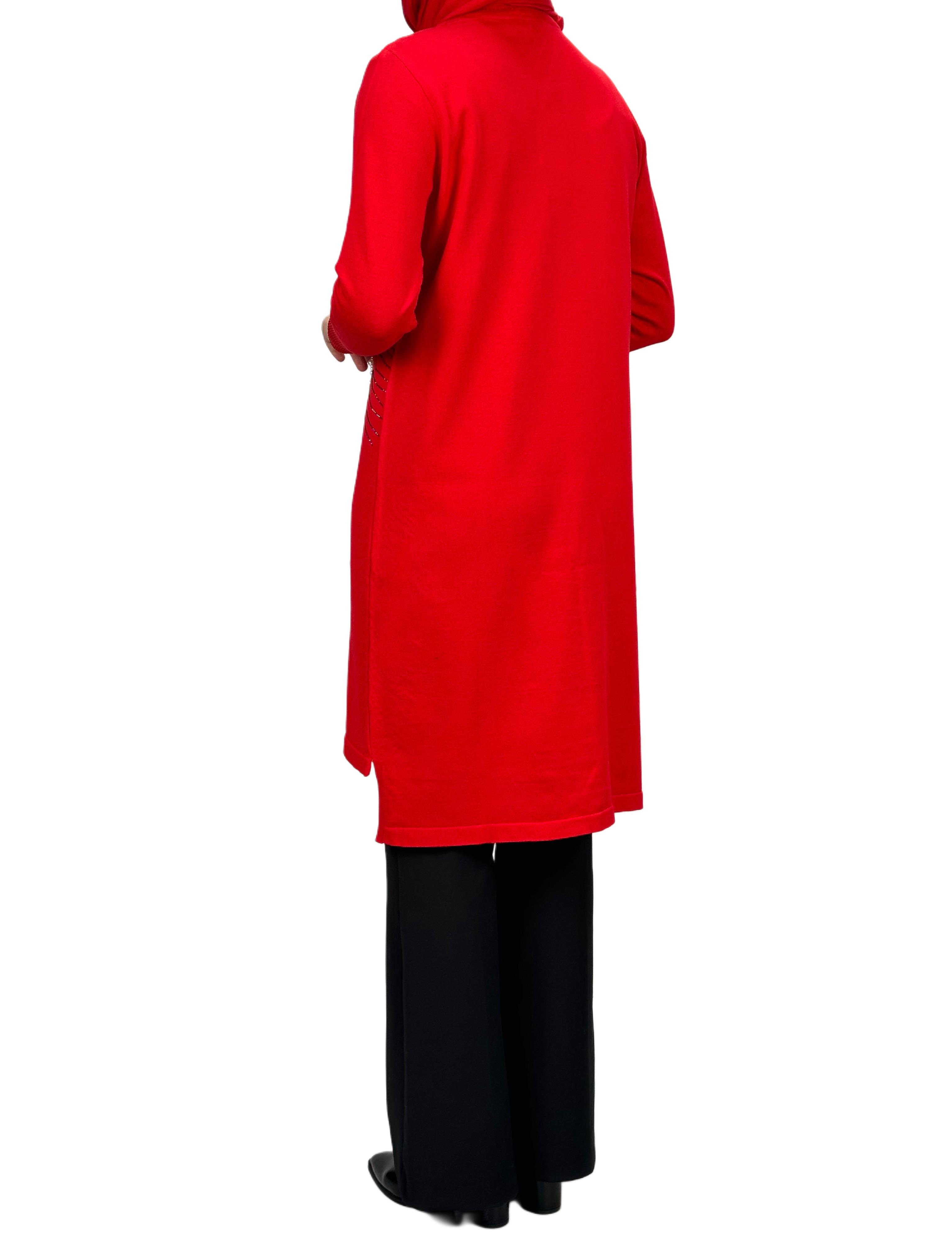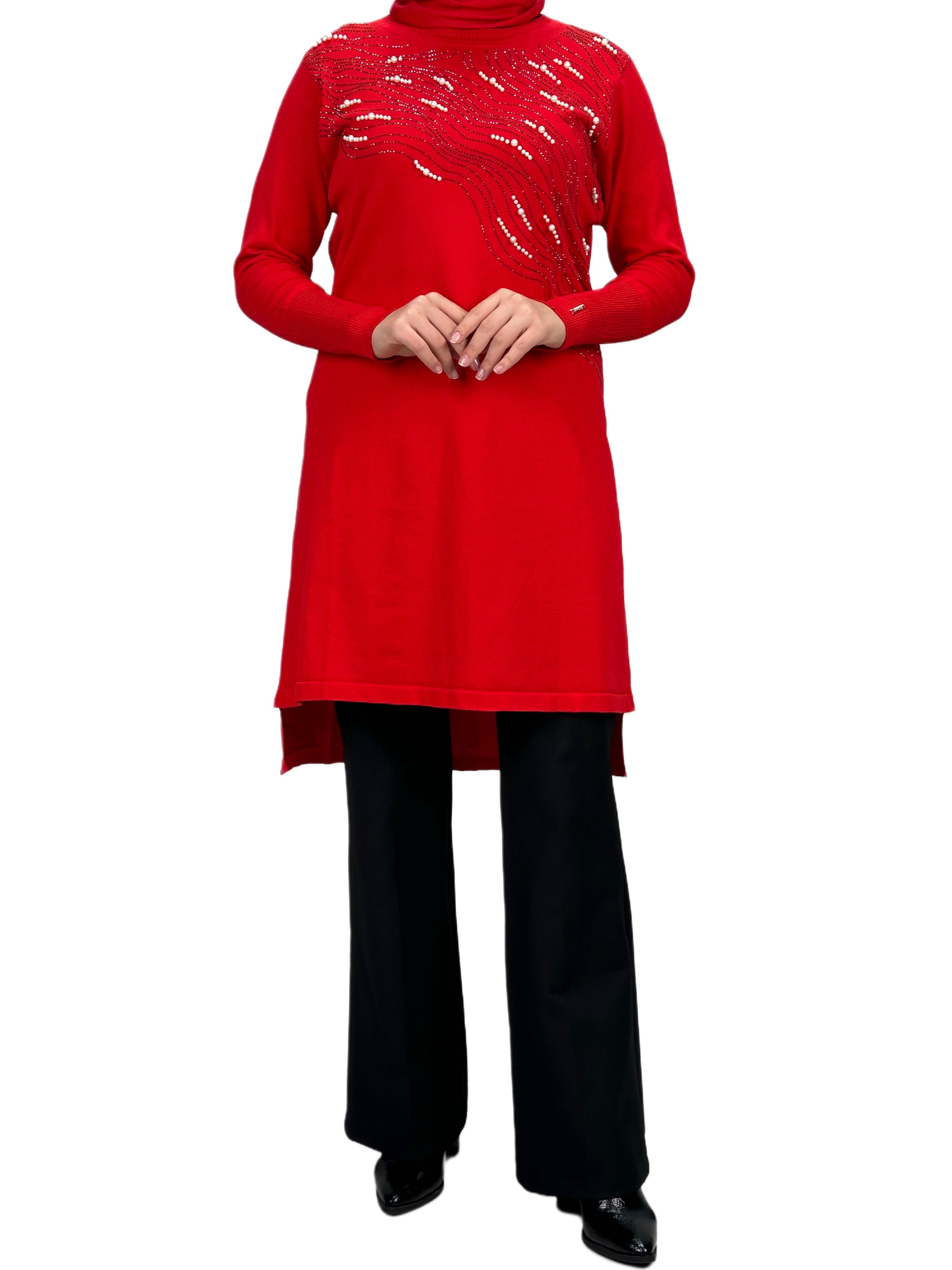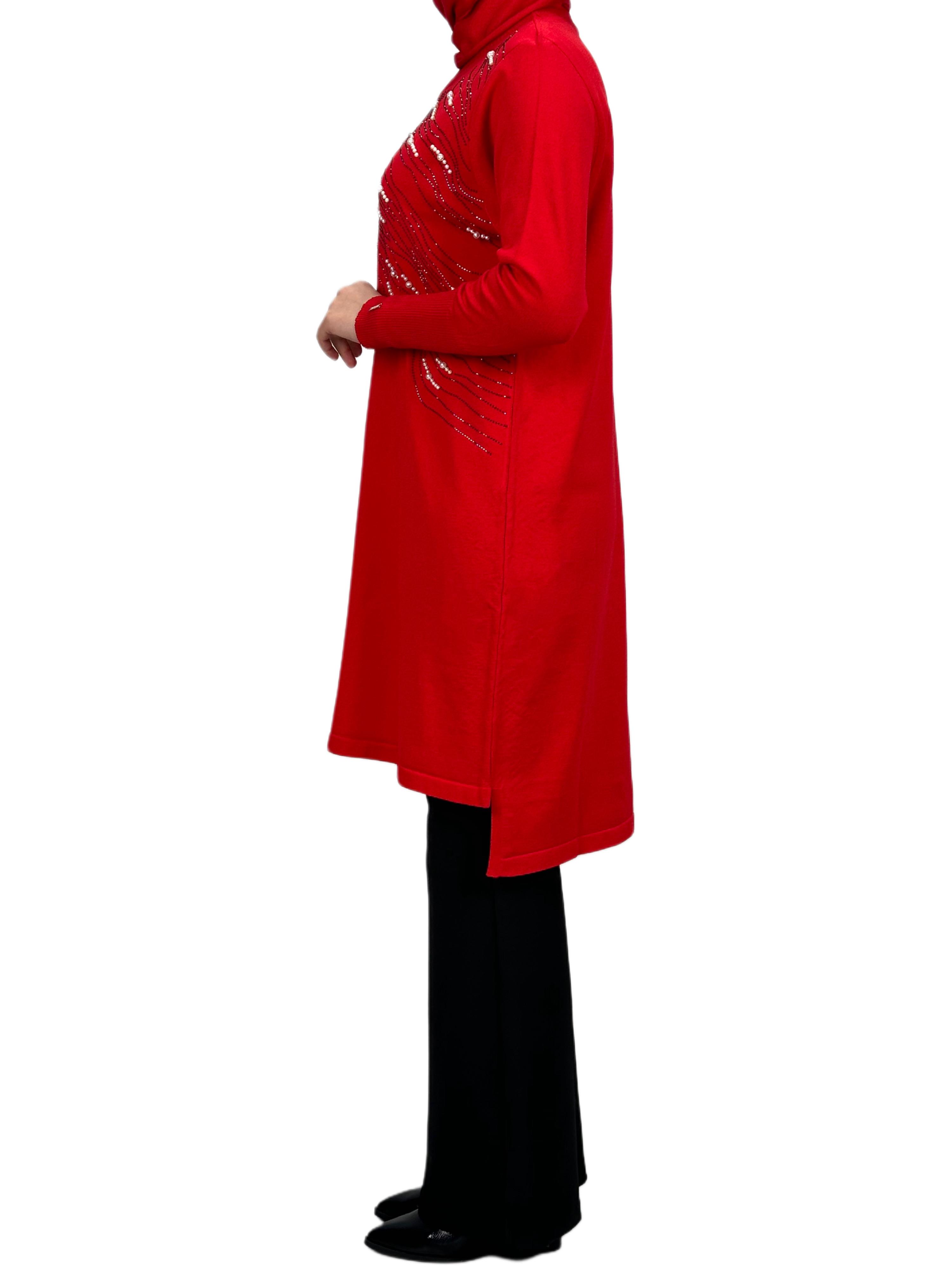 Taşlı Merserize Triko Tunik Kırmızı OTW121