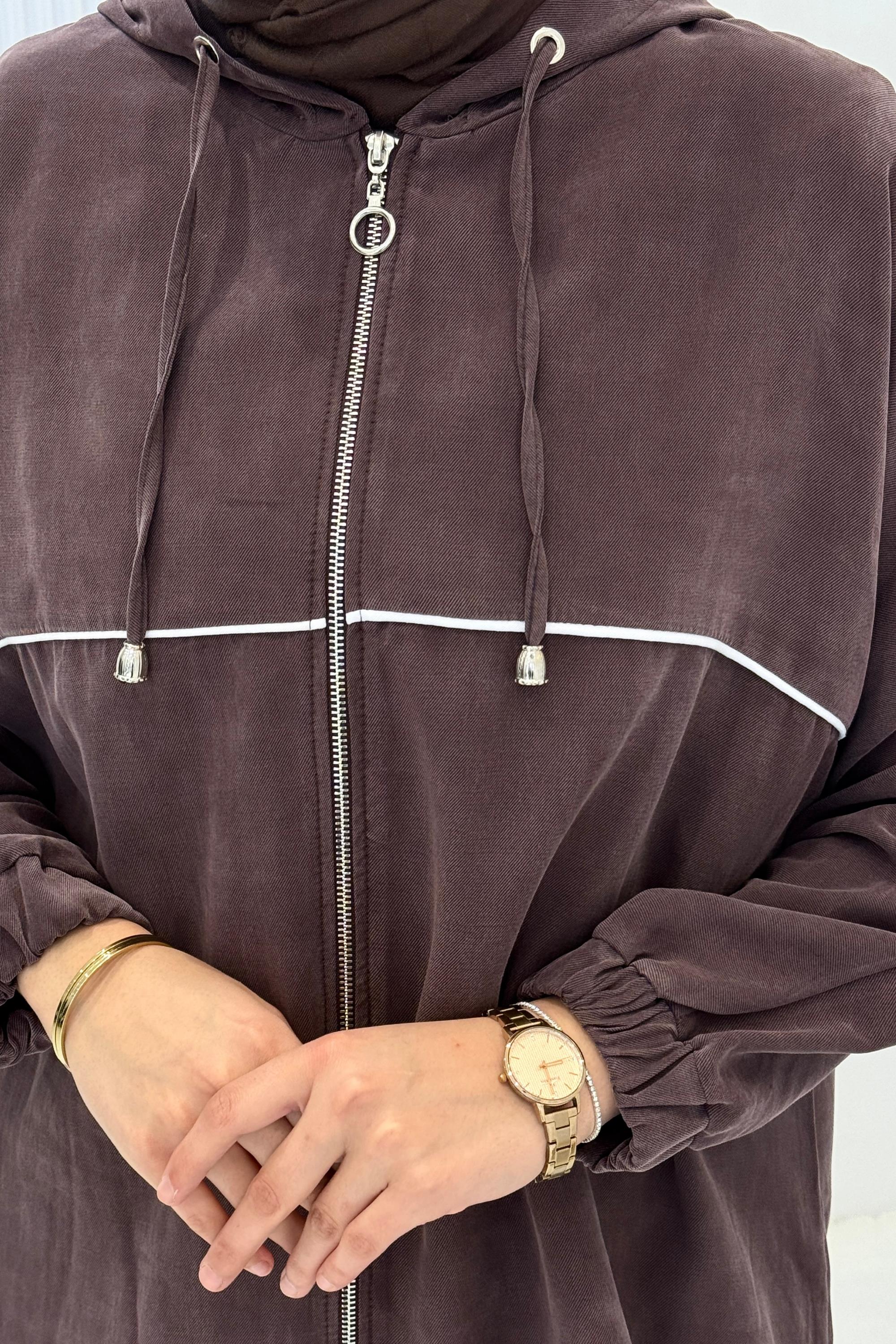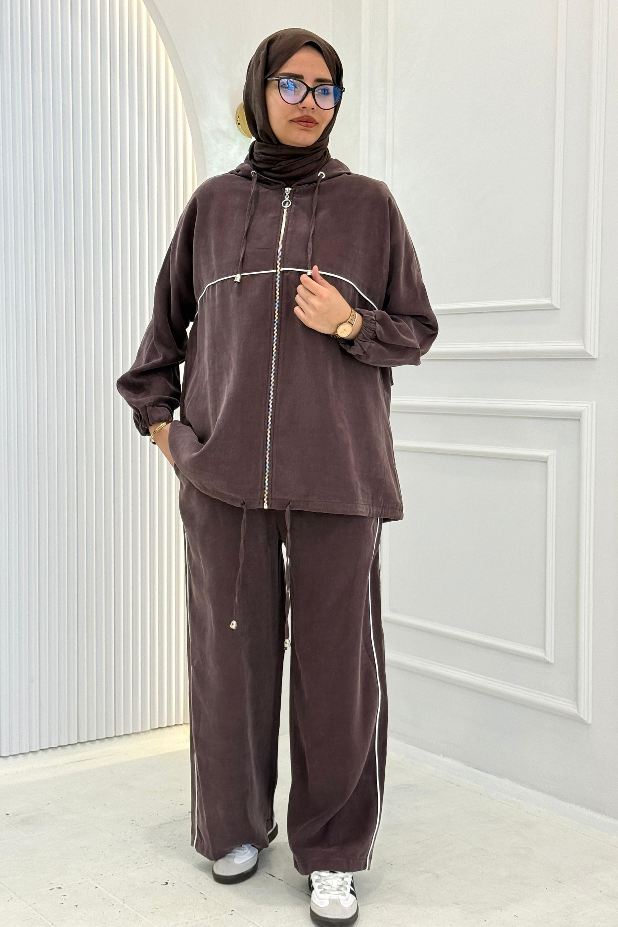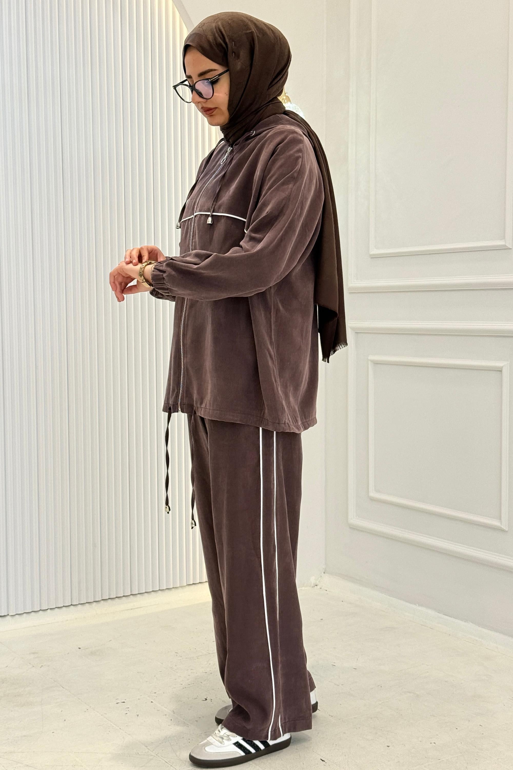 Tensel Kumaş Şerit Detaylı Kapüşonlu Takım Kahve OTW73060