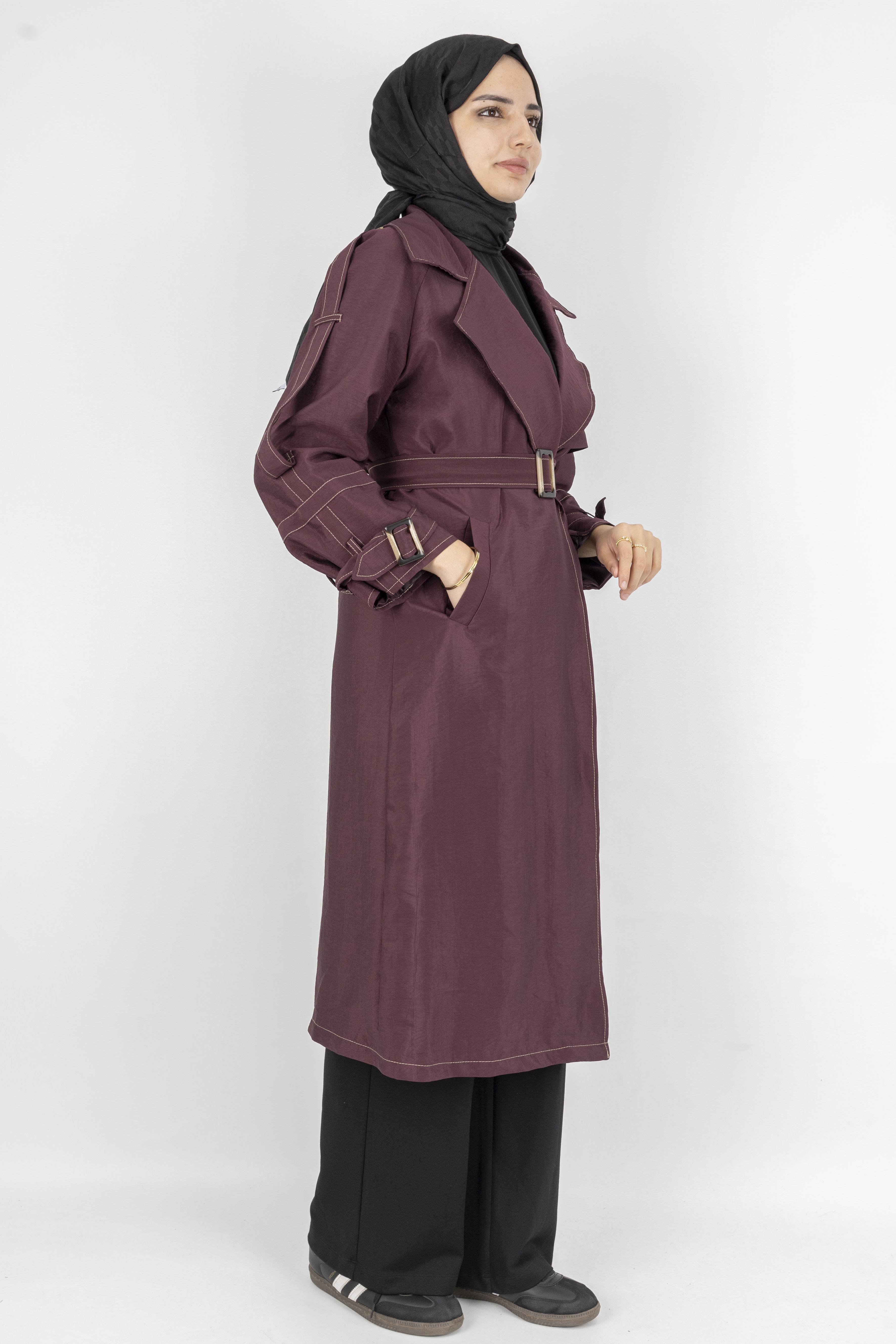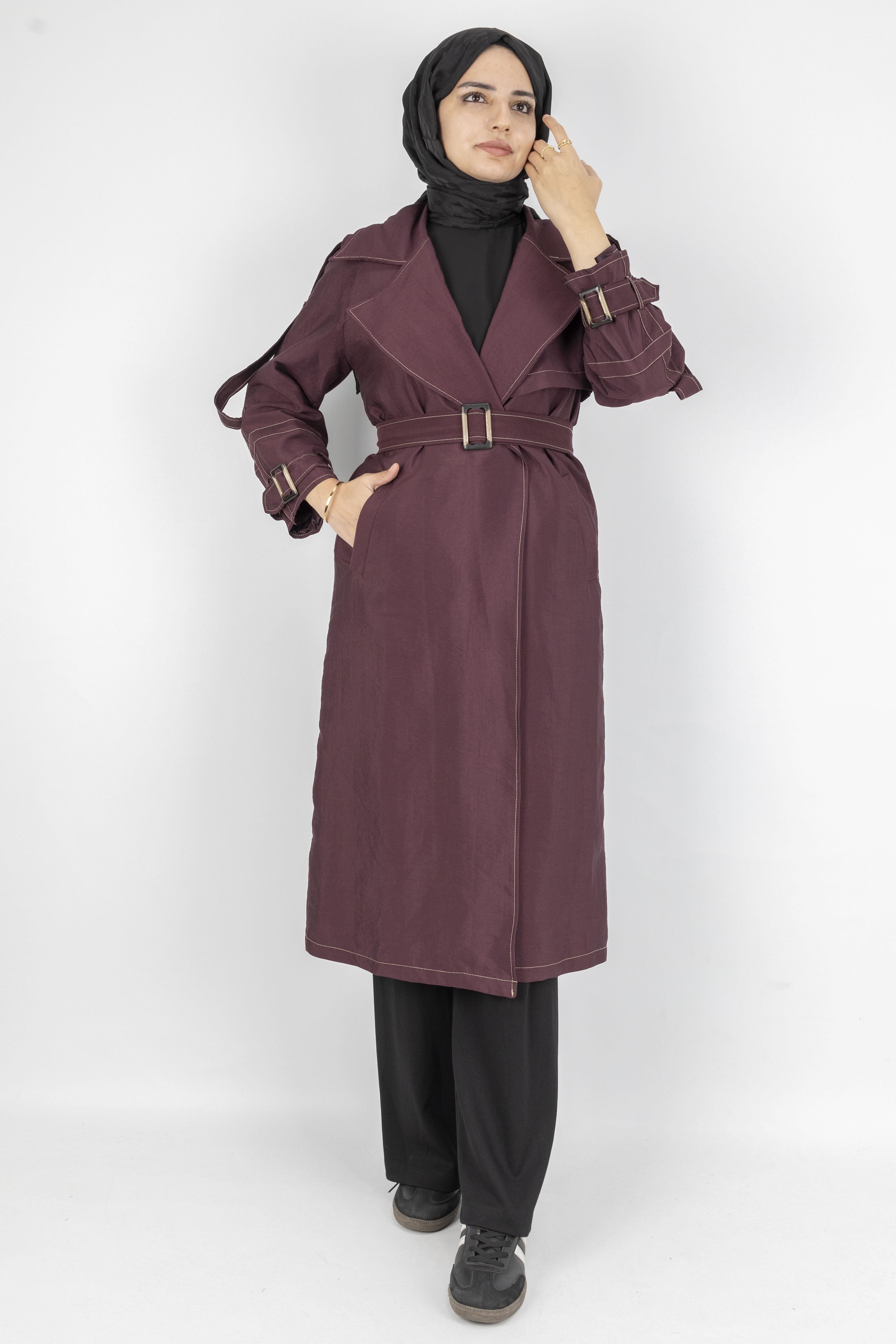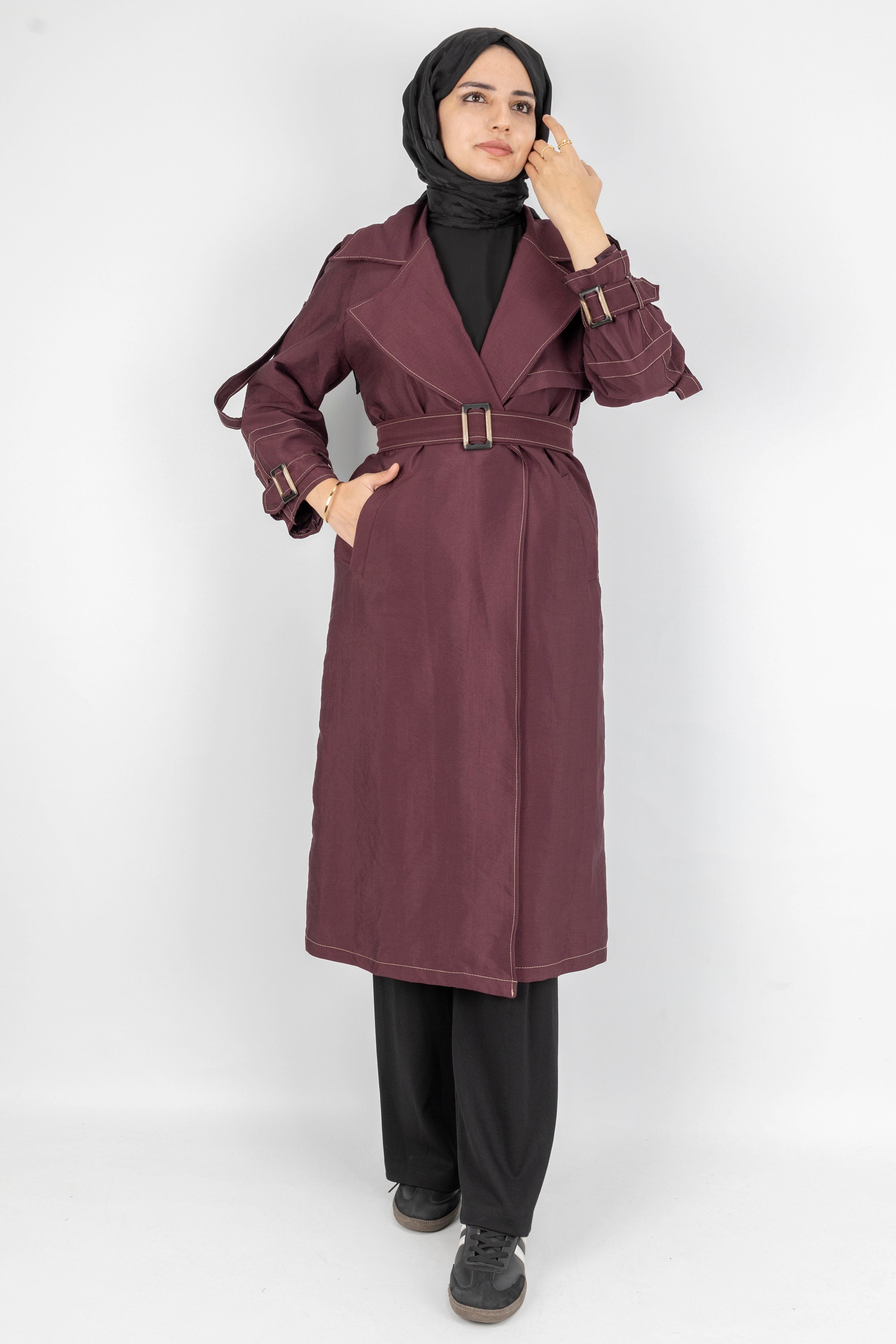 Tokalı Kemerli Şık Trenç Kap Bordo OTW4182
