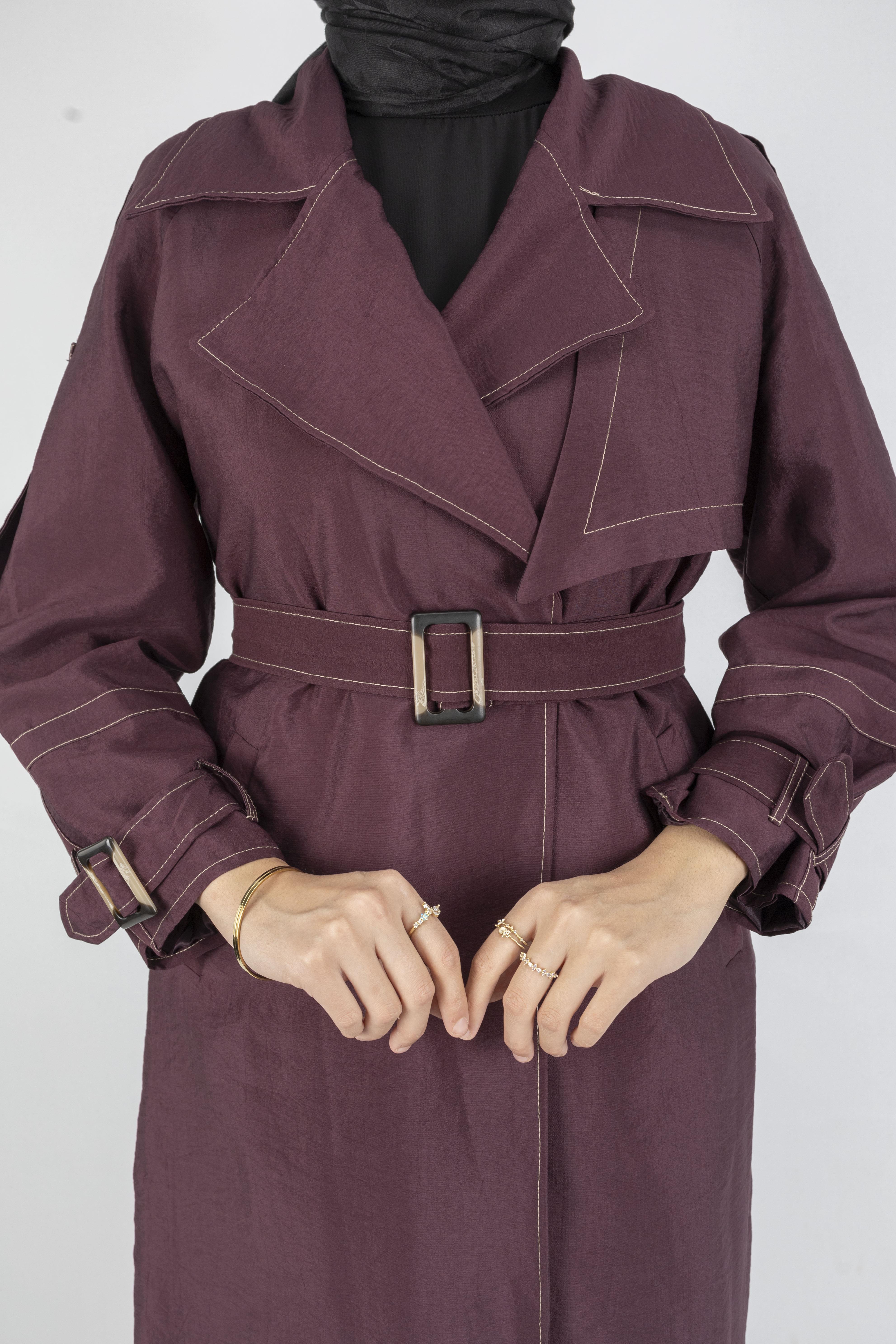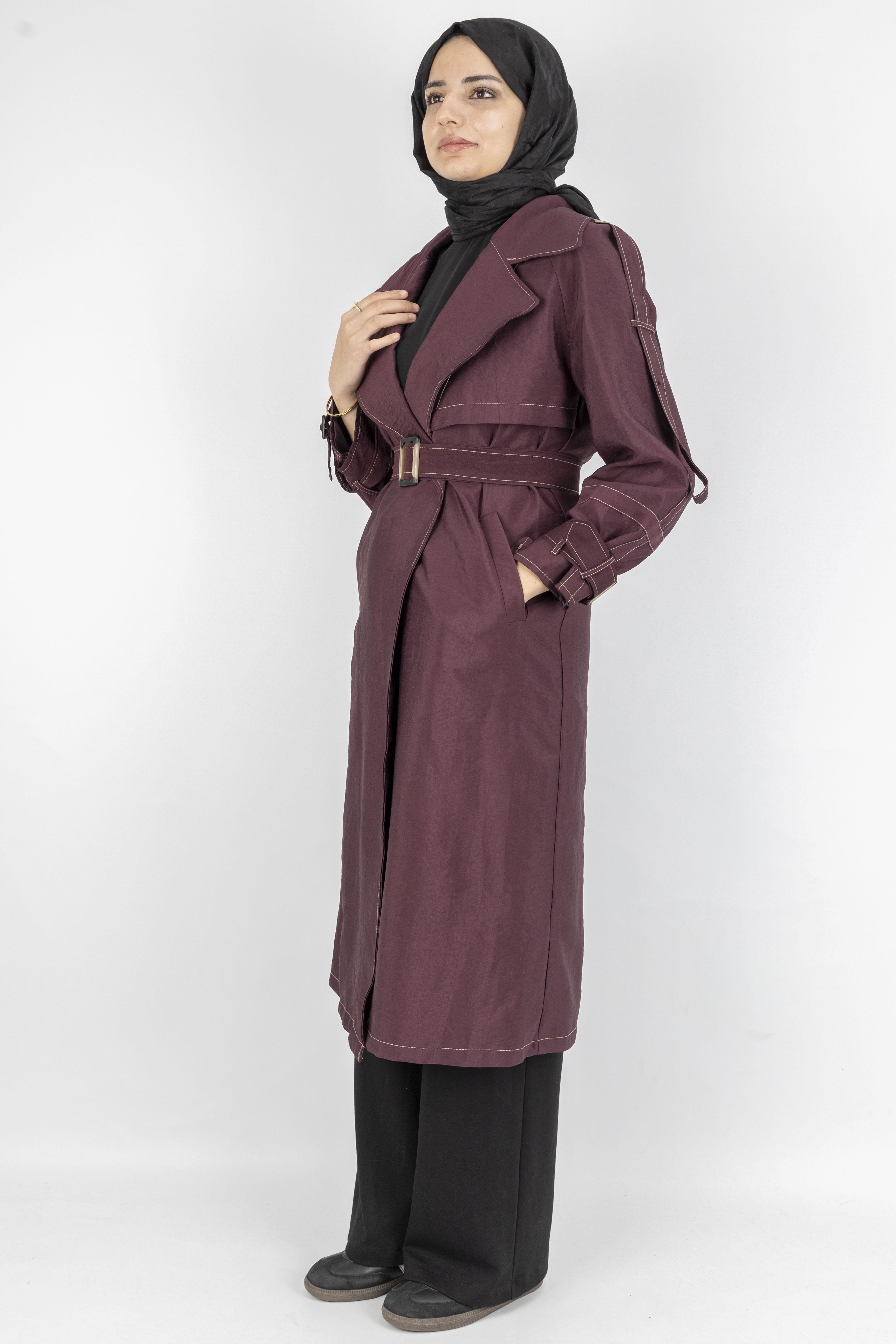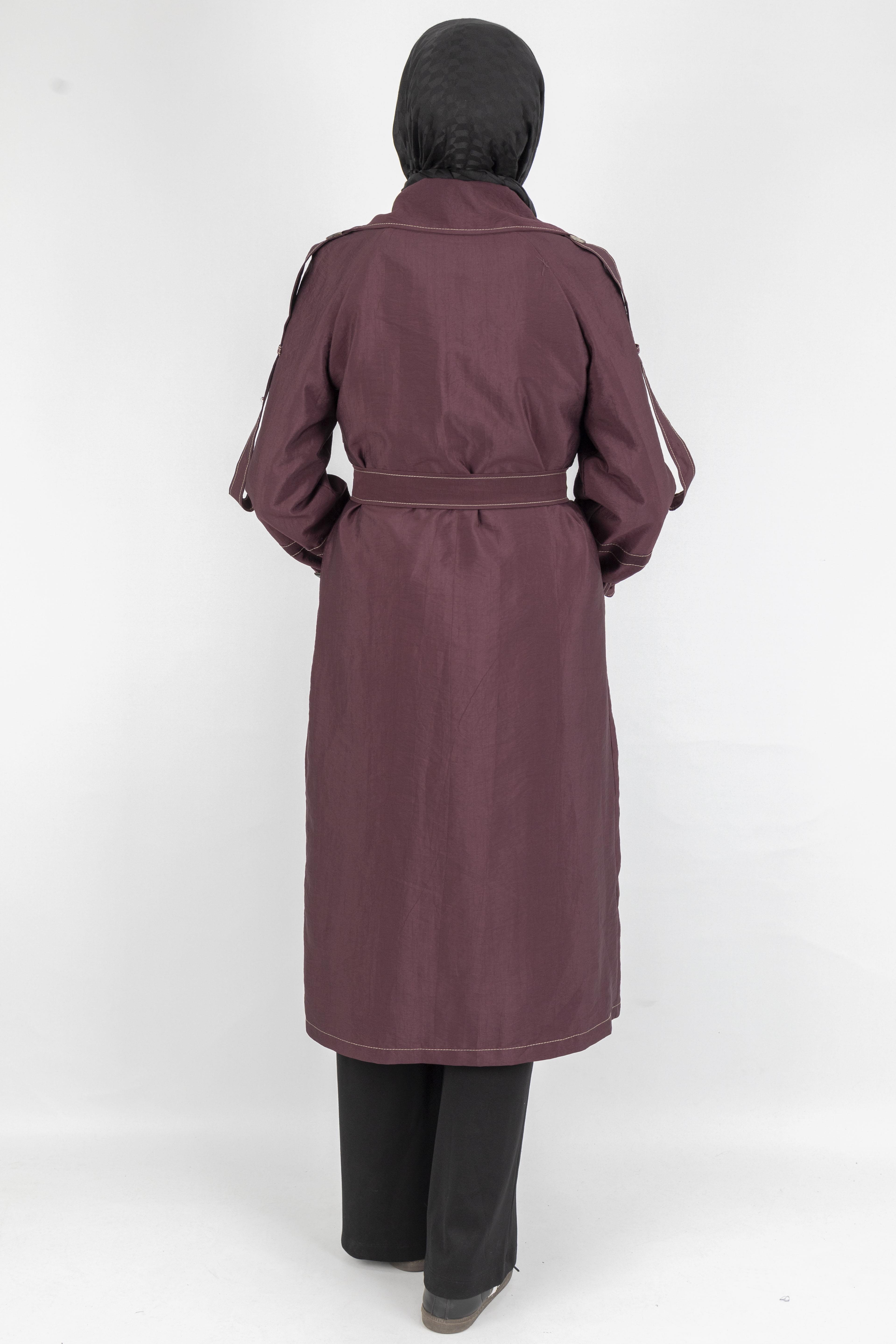 Tokalı Kemerli Şık Trenç Kap Bordo OTW4182
