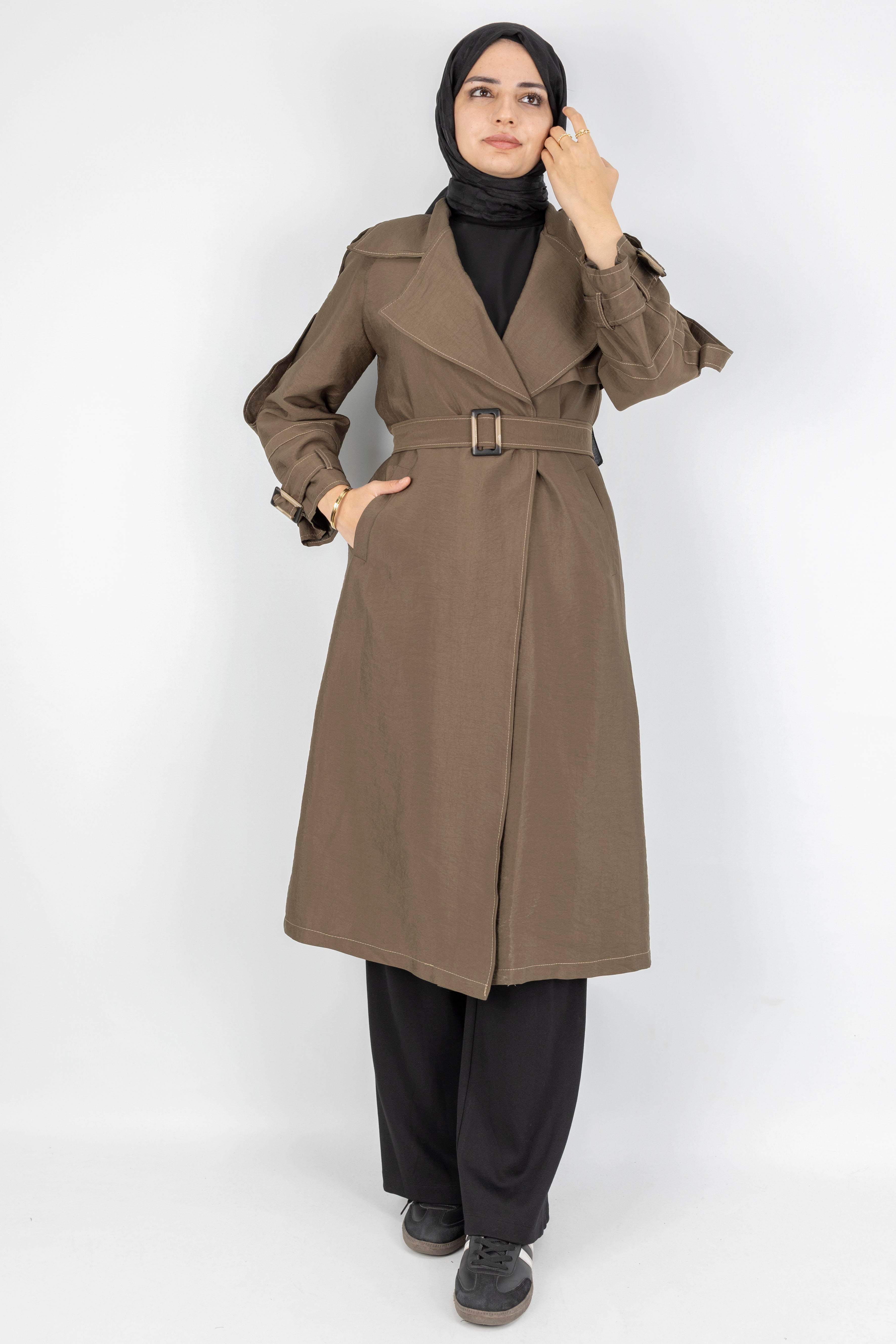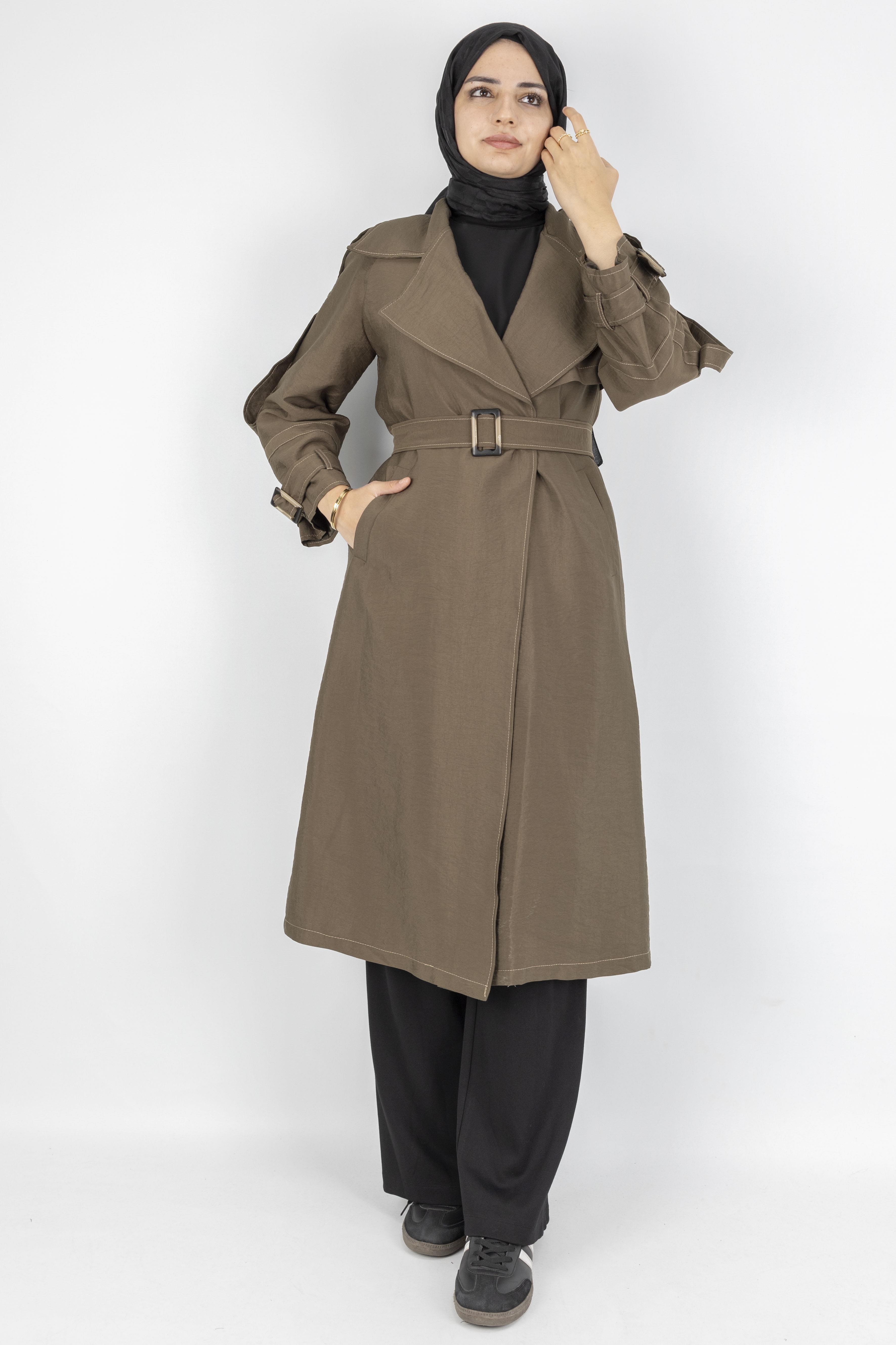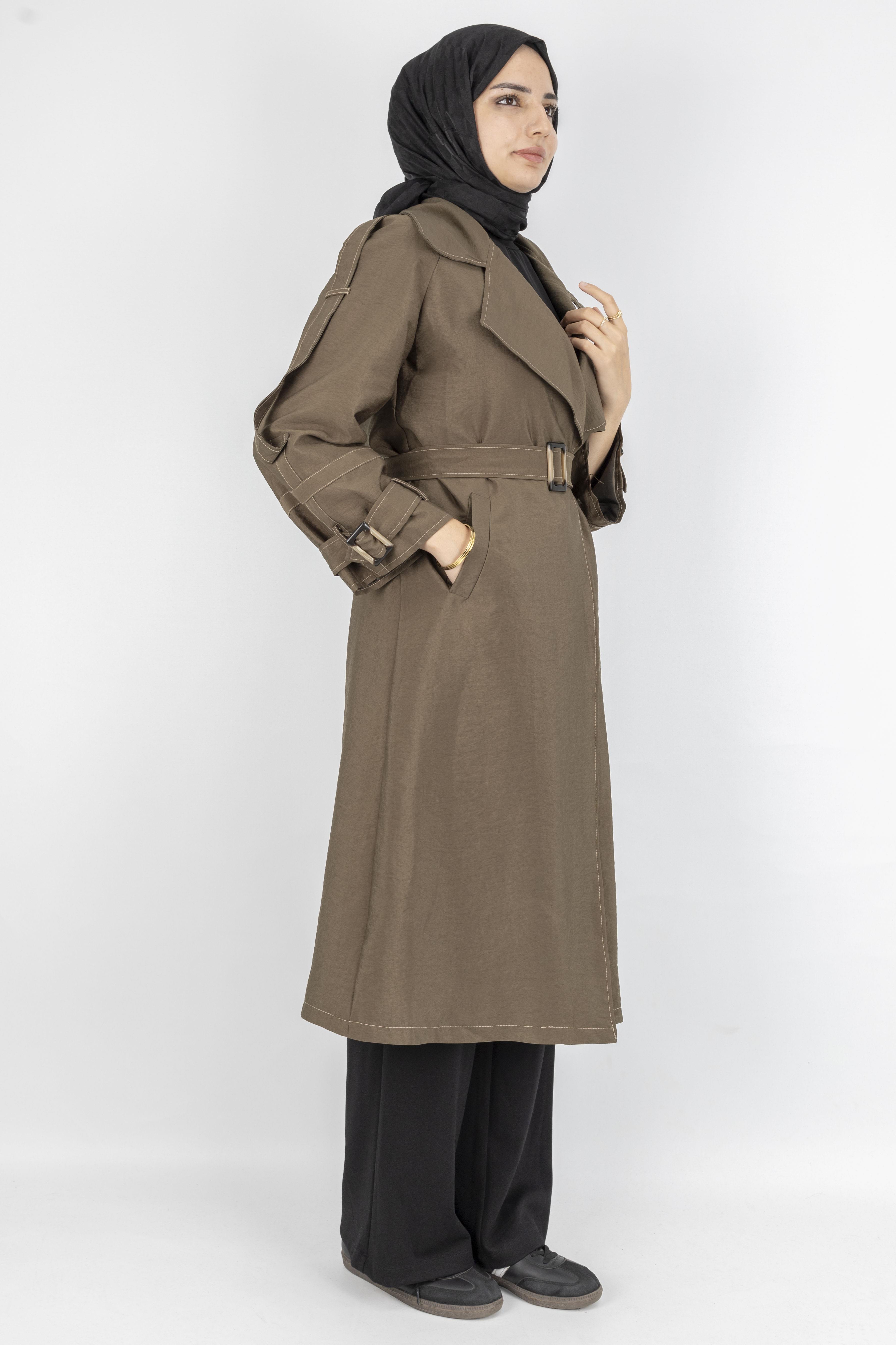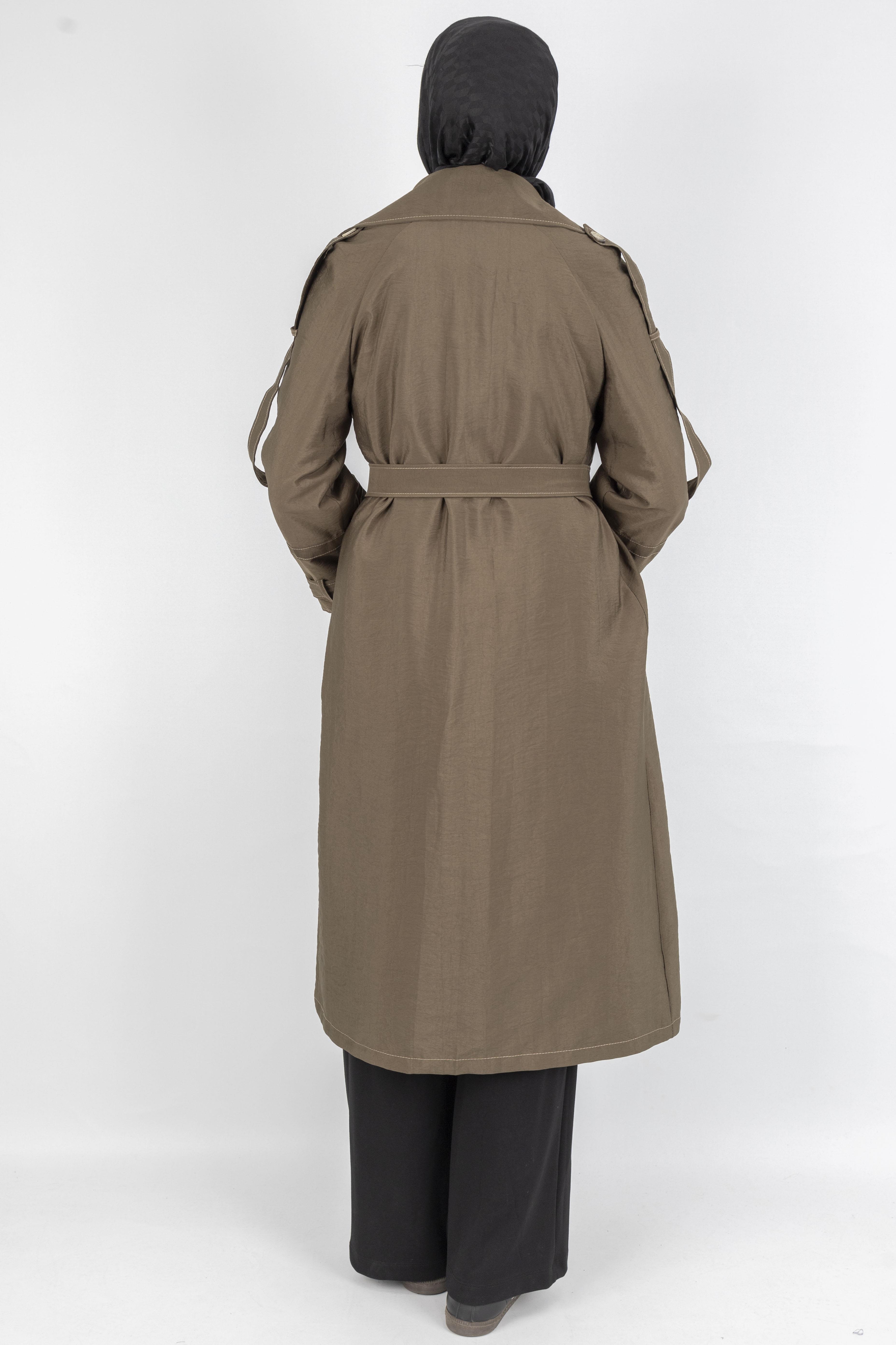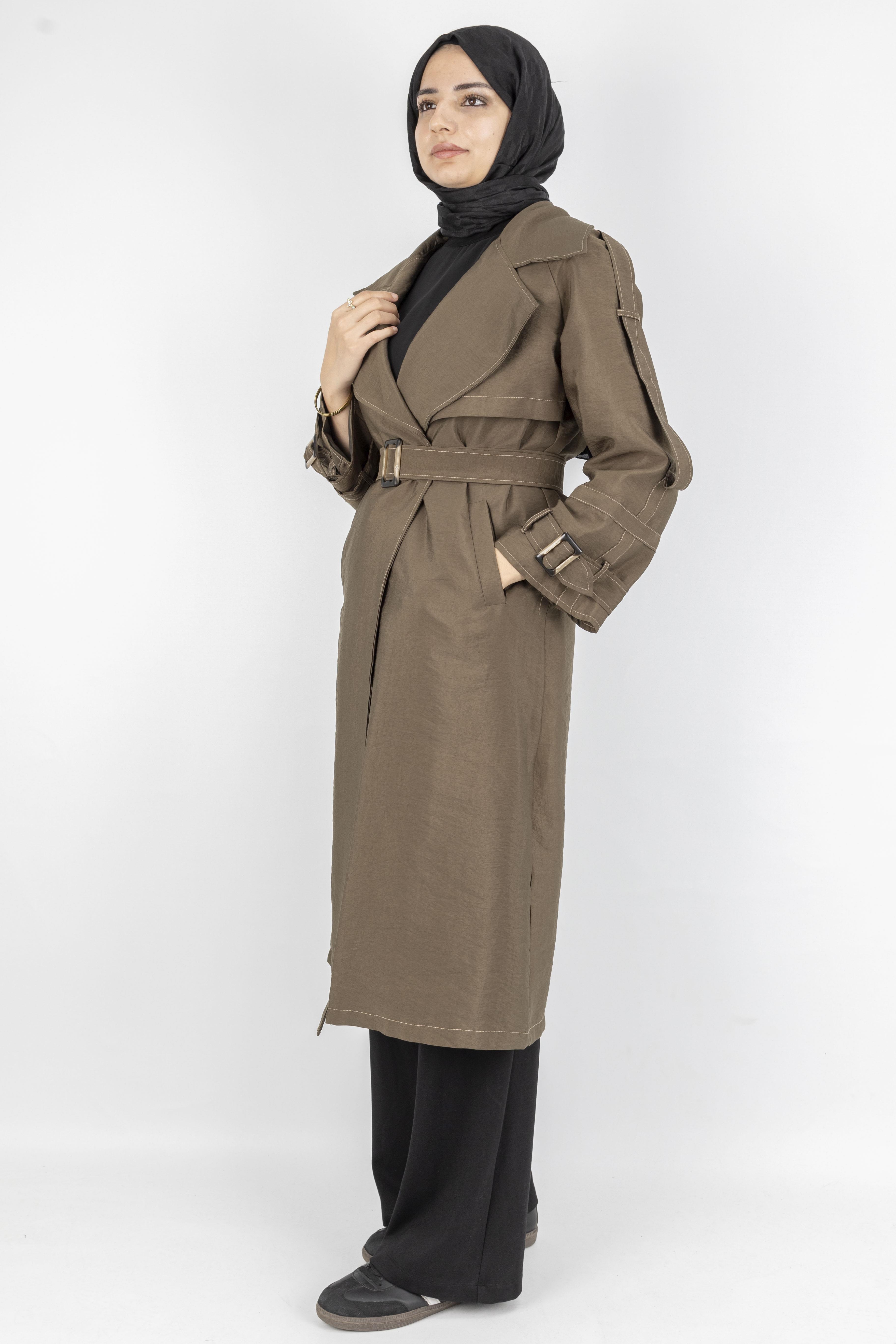 Tokalı Kemerli Şık Trenç Kap Haki OTW4182