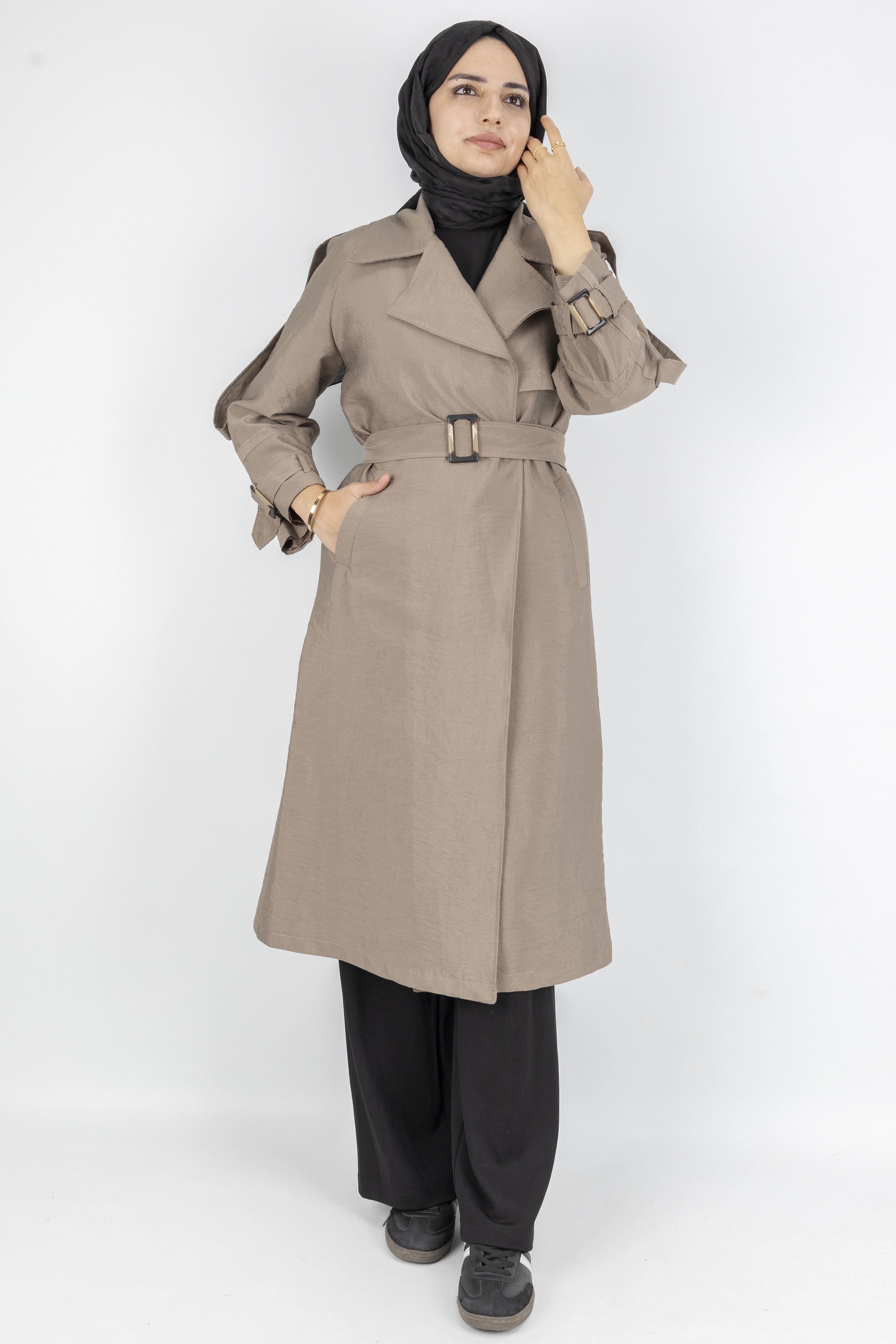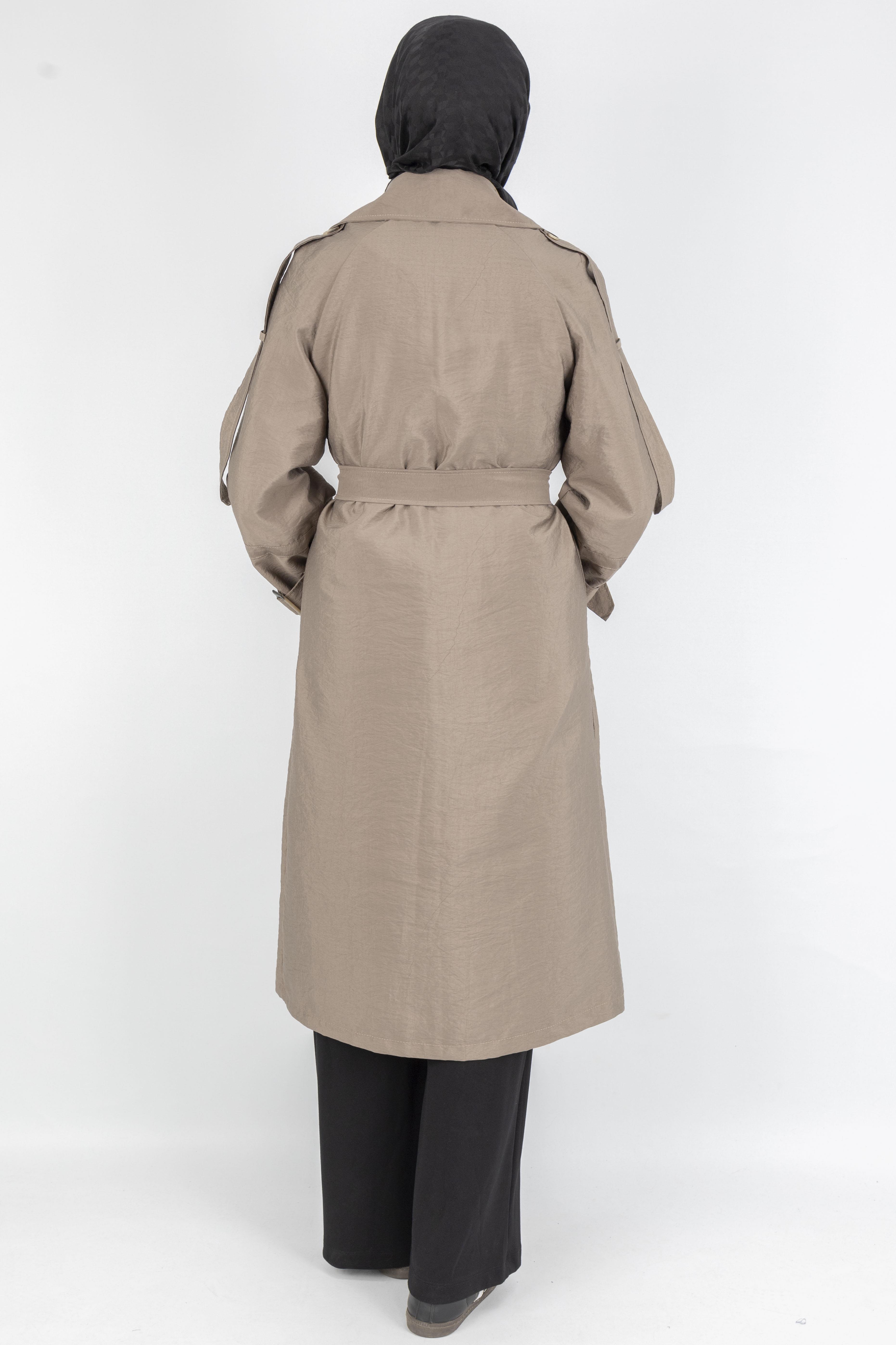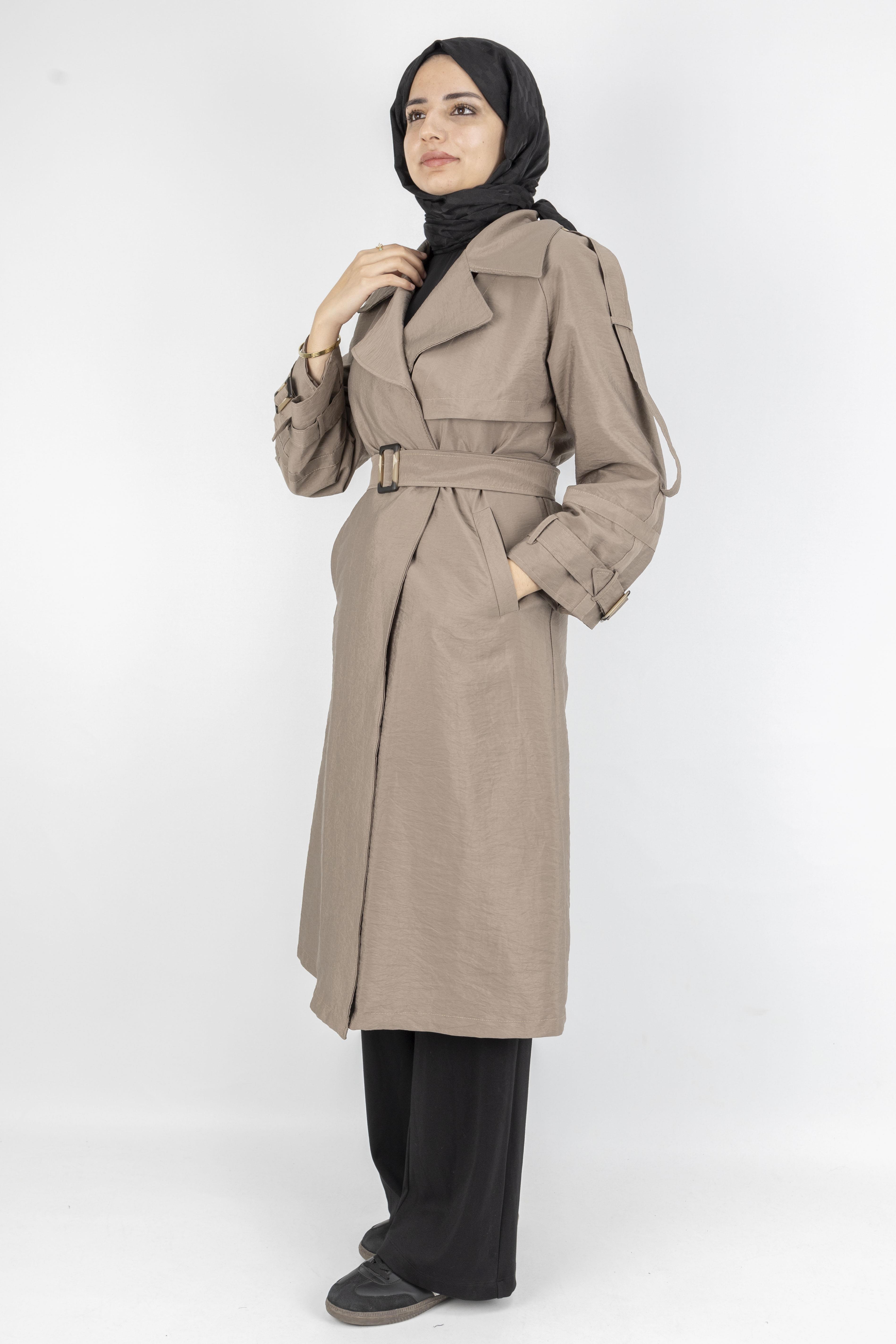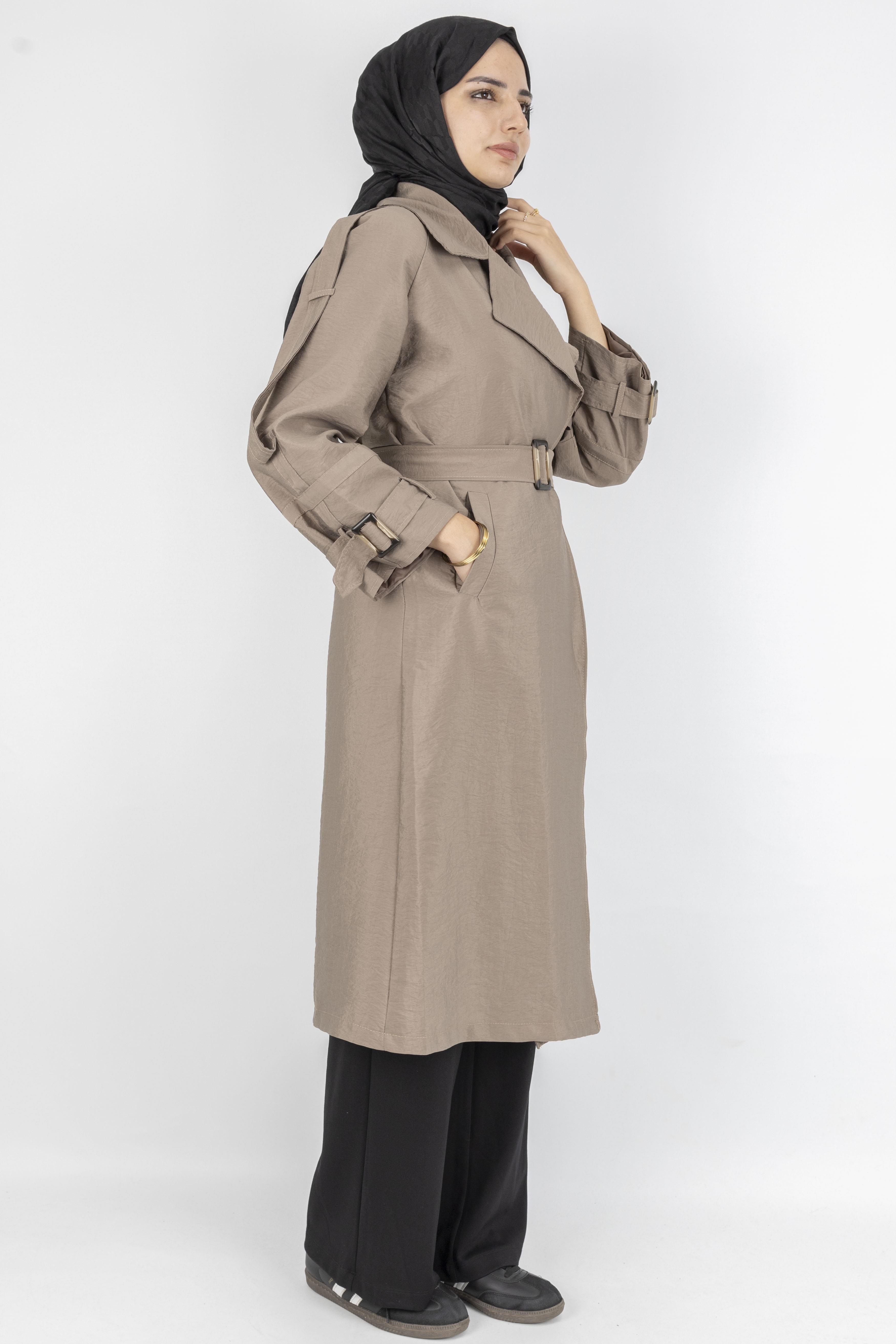 Tokalı Kemerli Şık Trenç Kap Vizon OTW4182