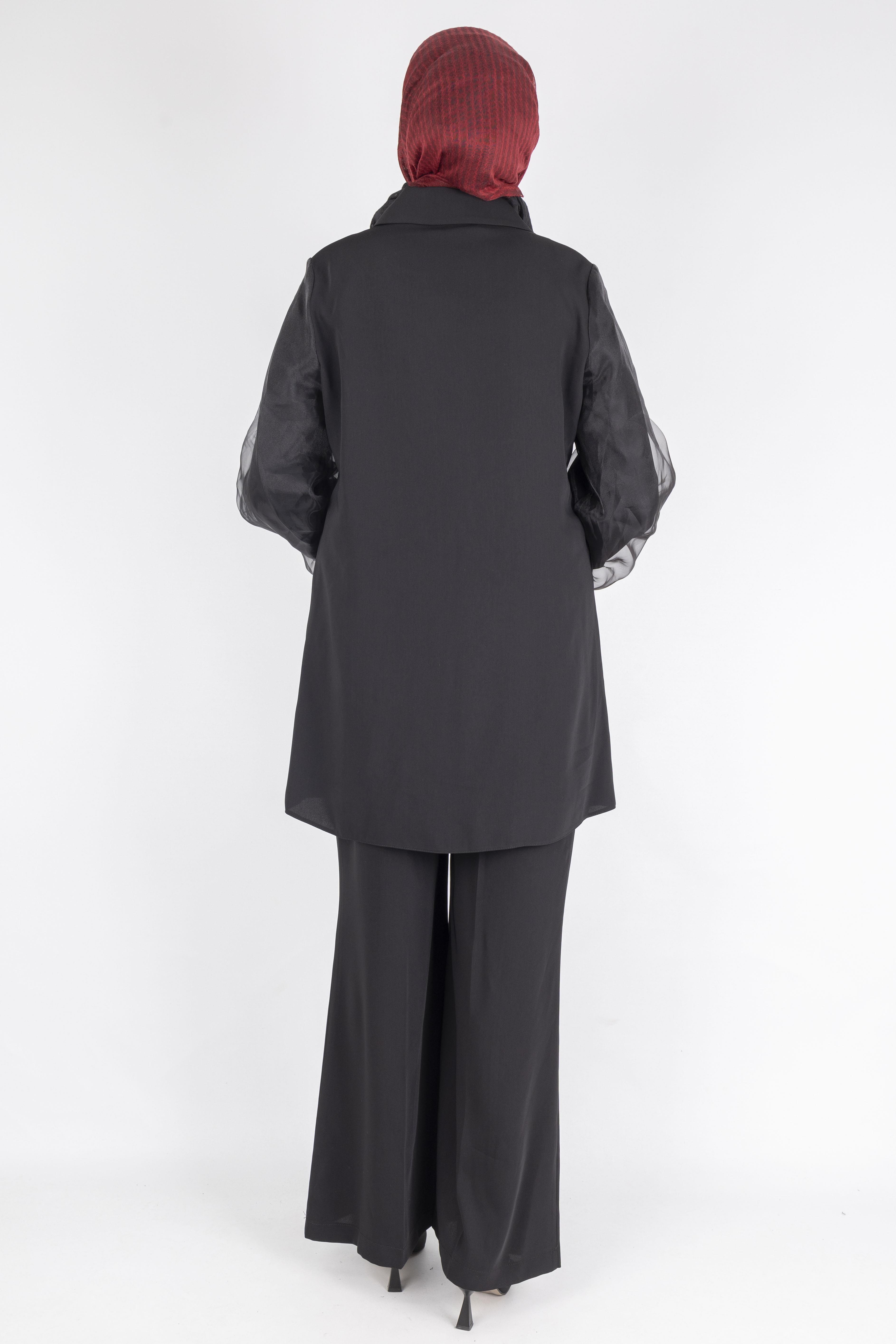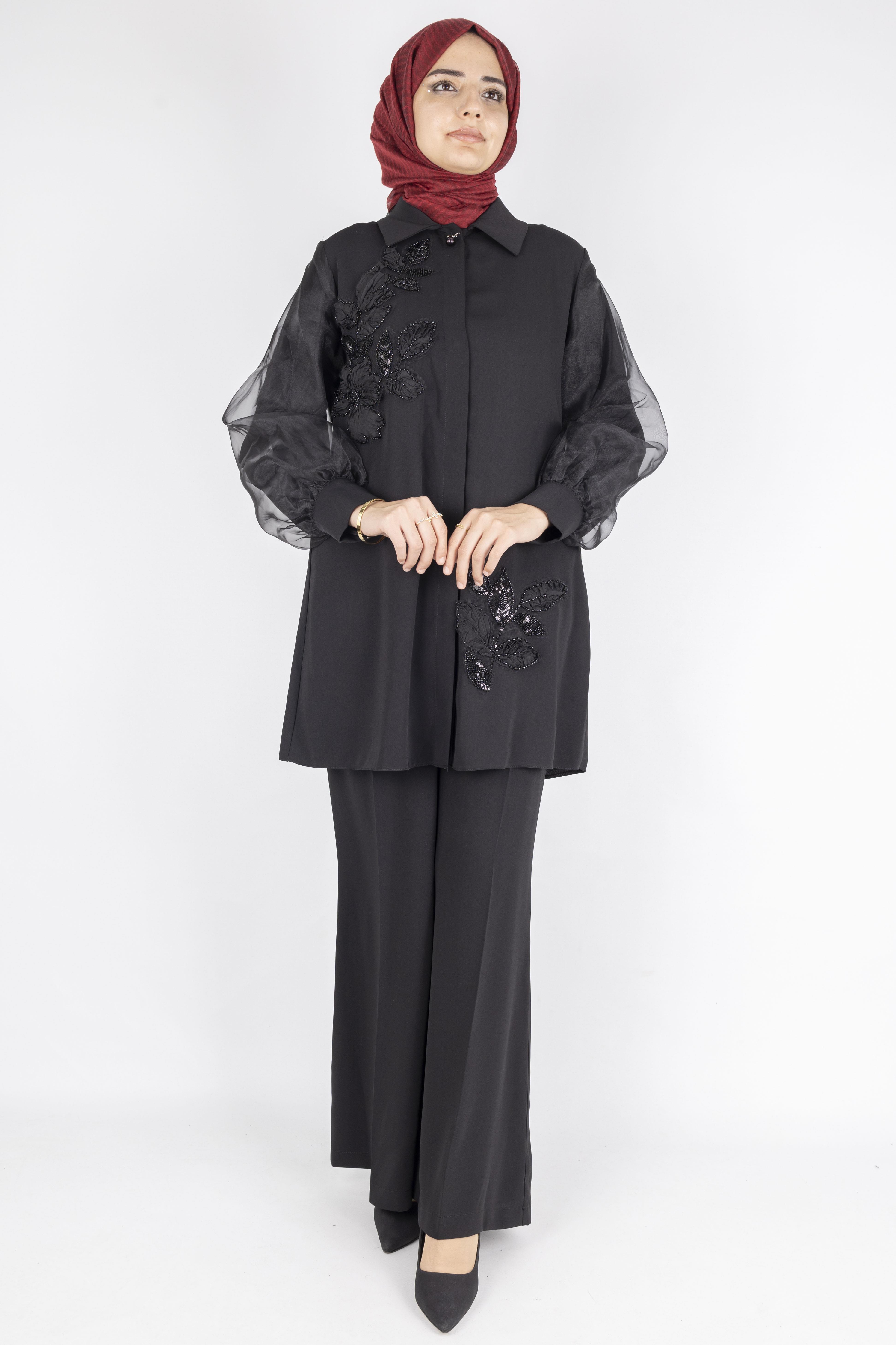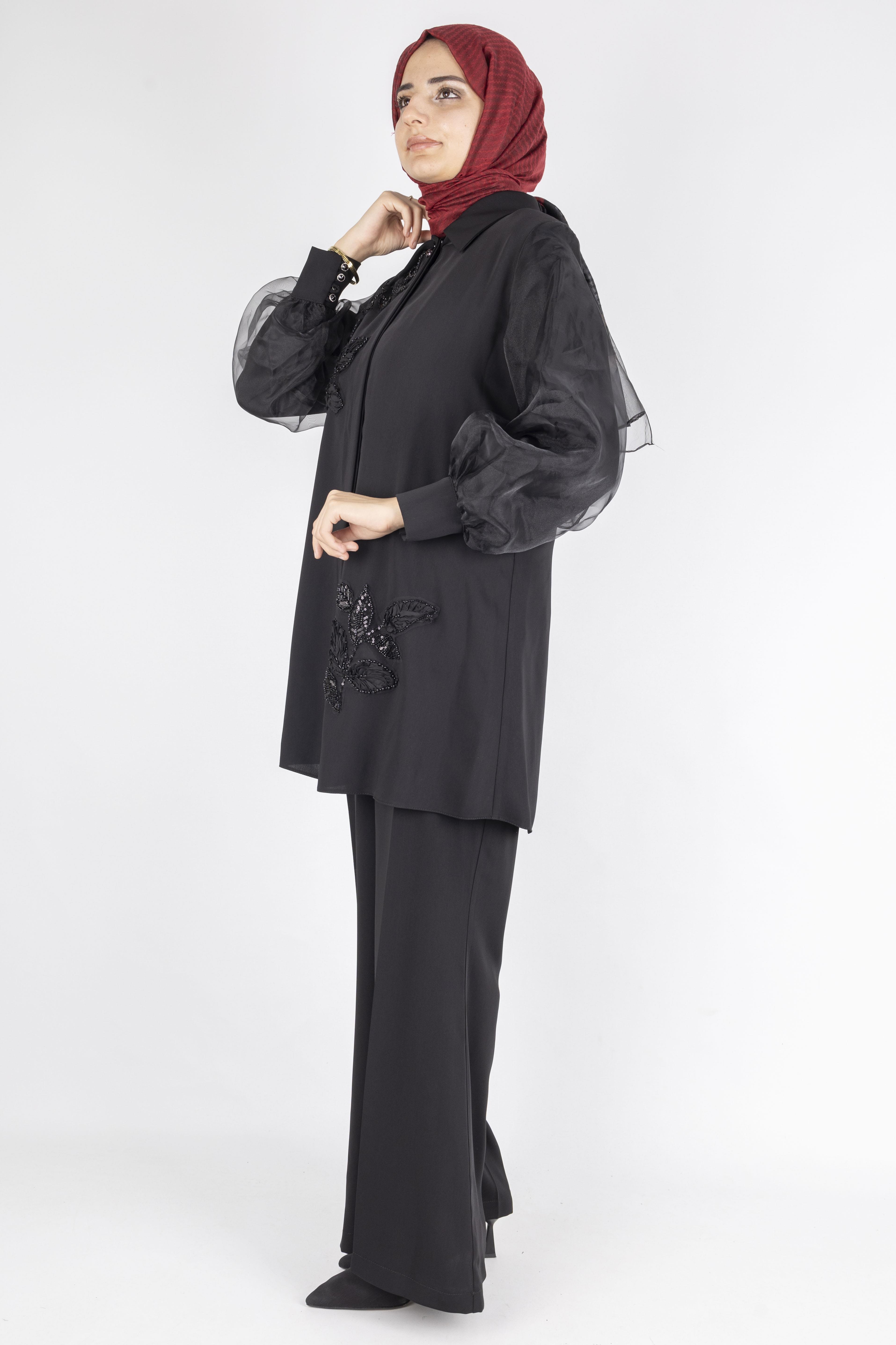 Orhan Store Tül Kollu Çiçek İşlemeli Tesettür Pantolonlu Takım Siyah OTW2561
