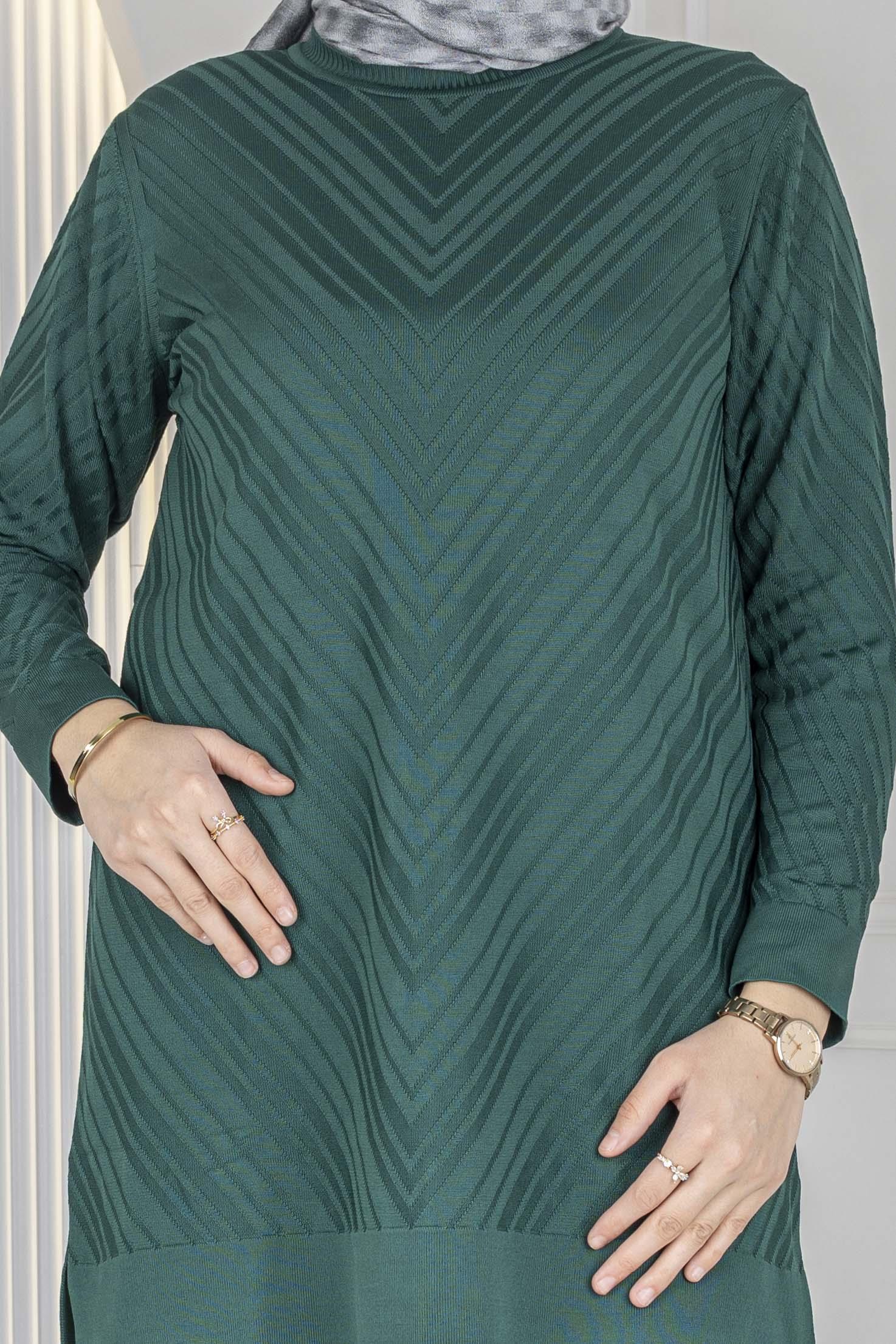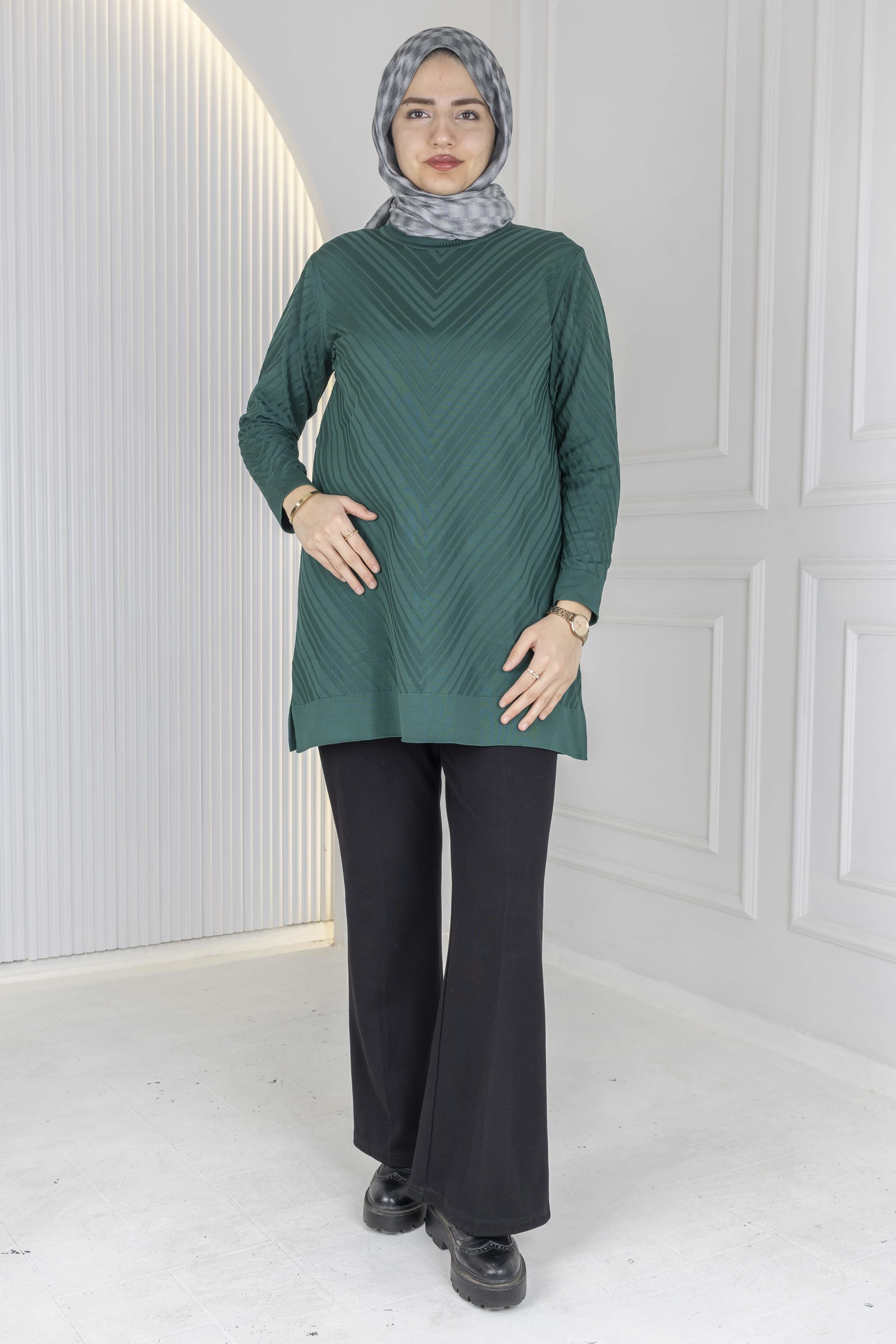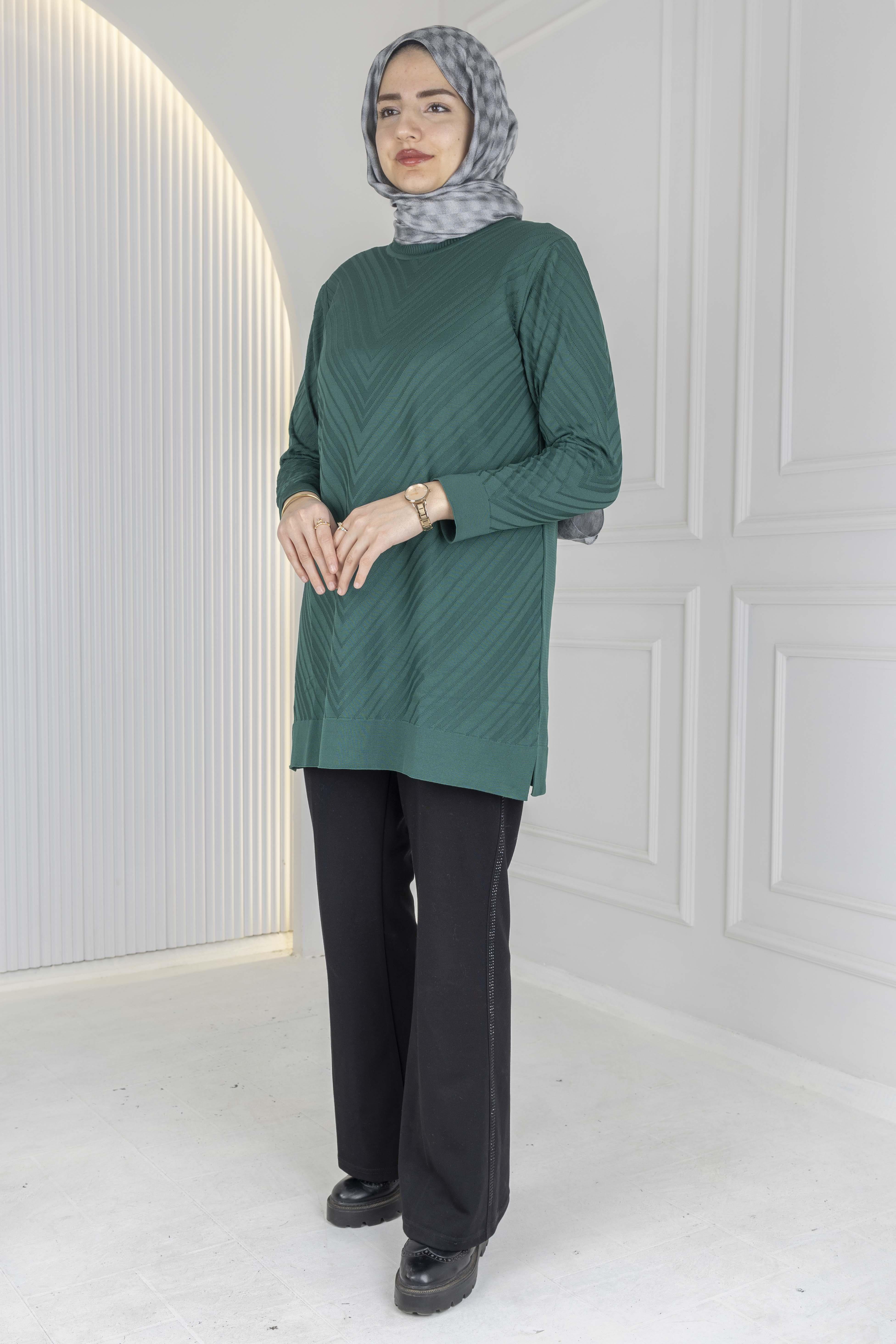Modern çizgili dokusu ve merserize triko kumaşı ile bu tunik, hem şık hem rahat bir görünüm sunar. Yumuşak yapısı, tok duruşu ve nefes alan merserize dokusu sayesinde gün boyu konfor sağlar. Vücudu sarmayan rahat kesimi ile büyük beden kullanıcılar için ideal olup pantolon, etek ya da bol paça parçalarla kolayca kombinlenebilir. Günlük kullanım, ofis stili veya şehir şıklığı için zarif bir tercih oluşturur.