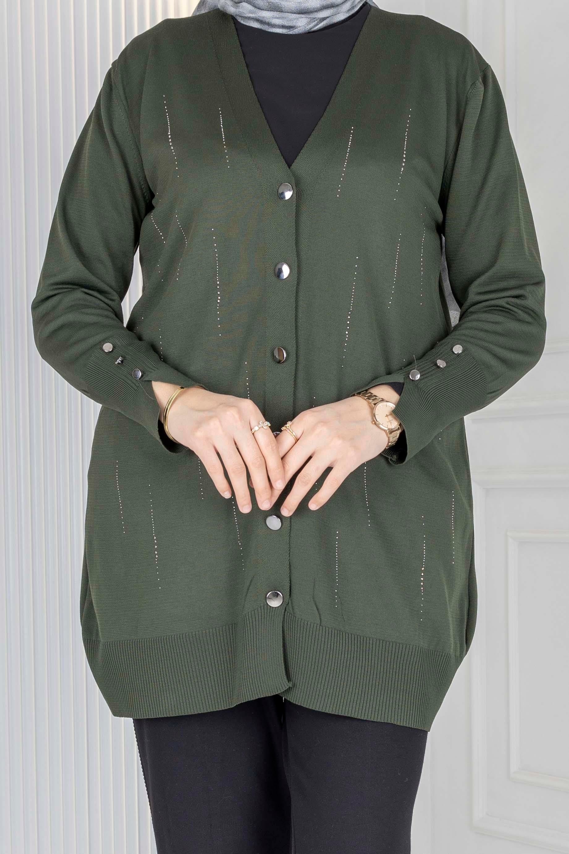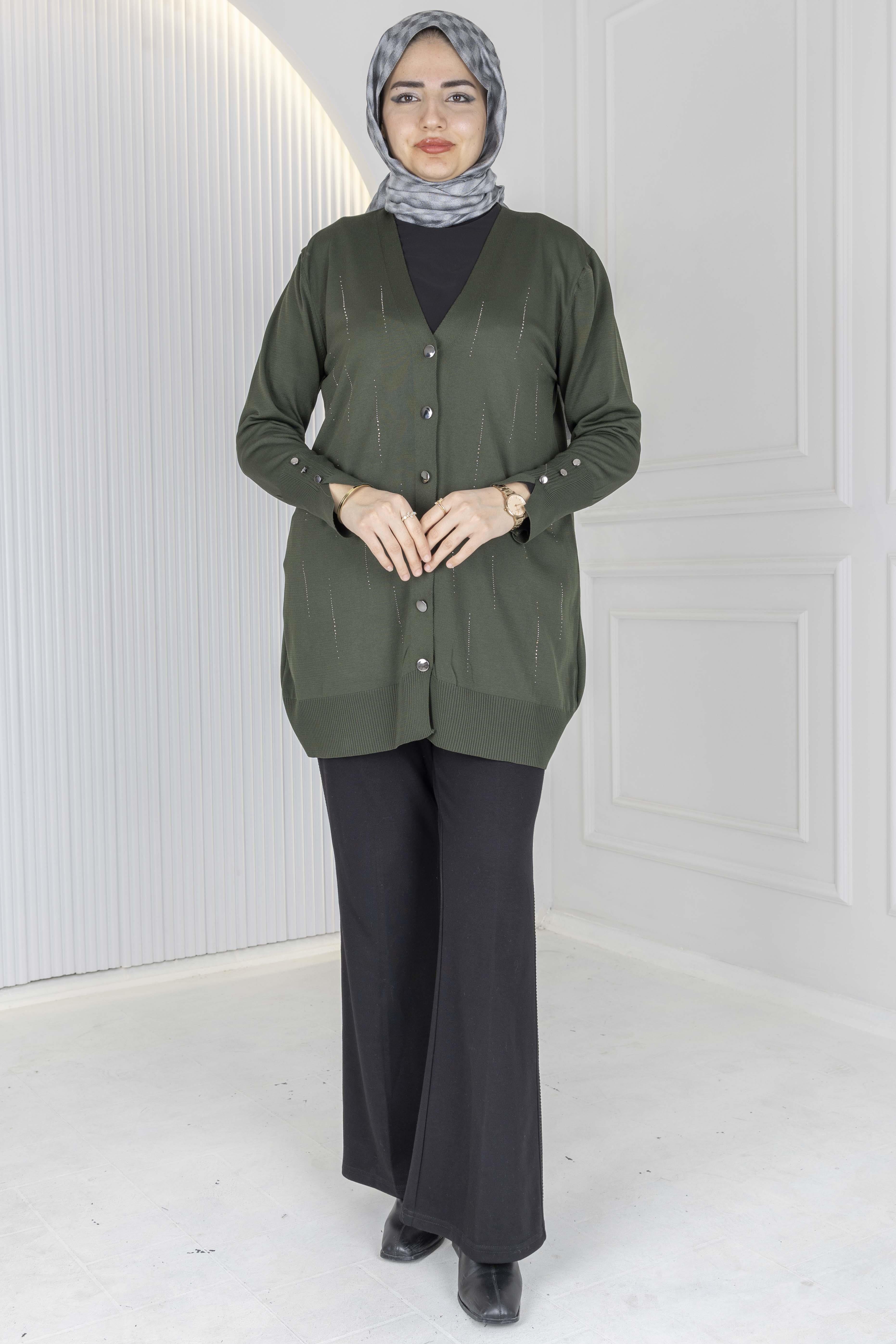 V Yaka Düğmeli Merserize Hırka Haki OTW1030